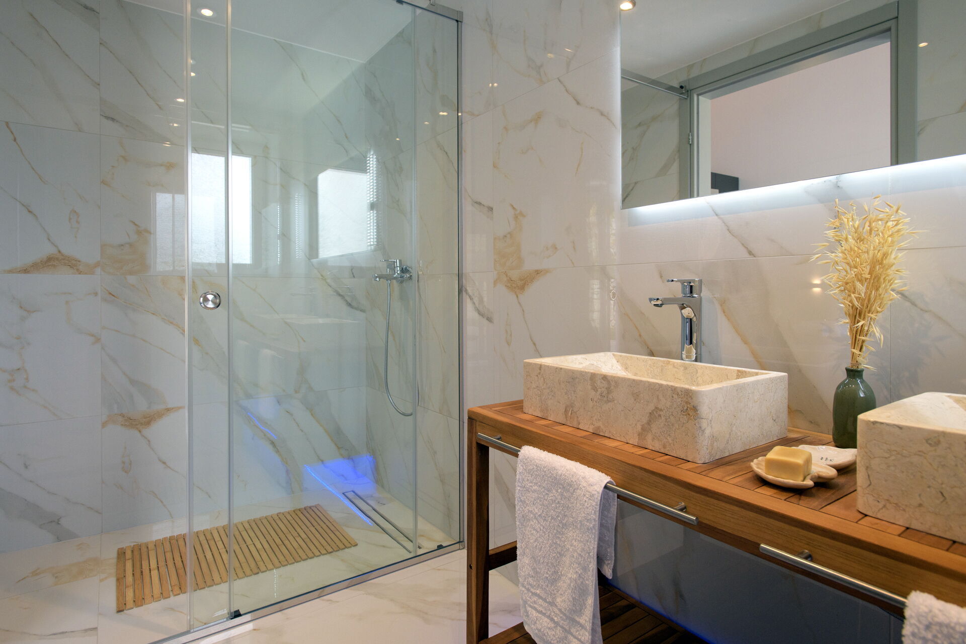 First floor: 2 double bedrooms, each with a private bathroom with shower.