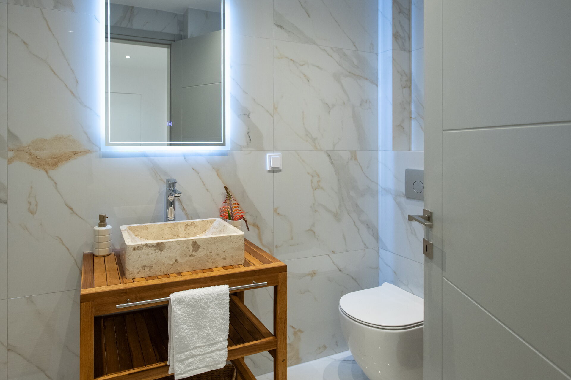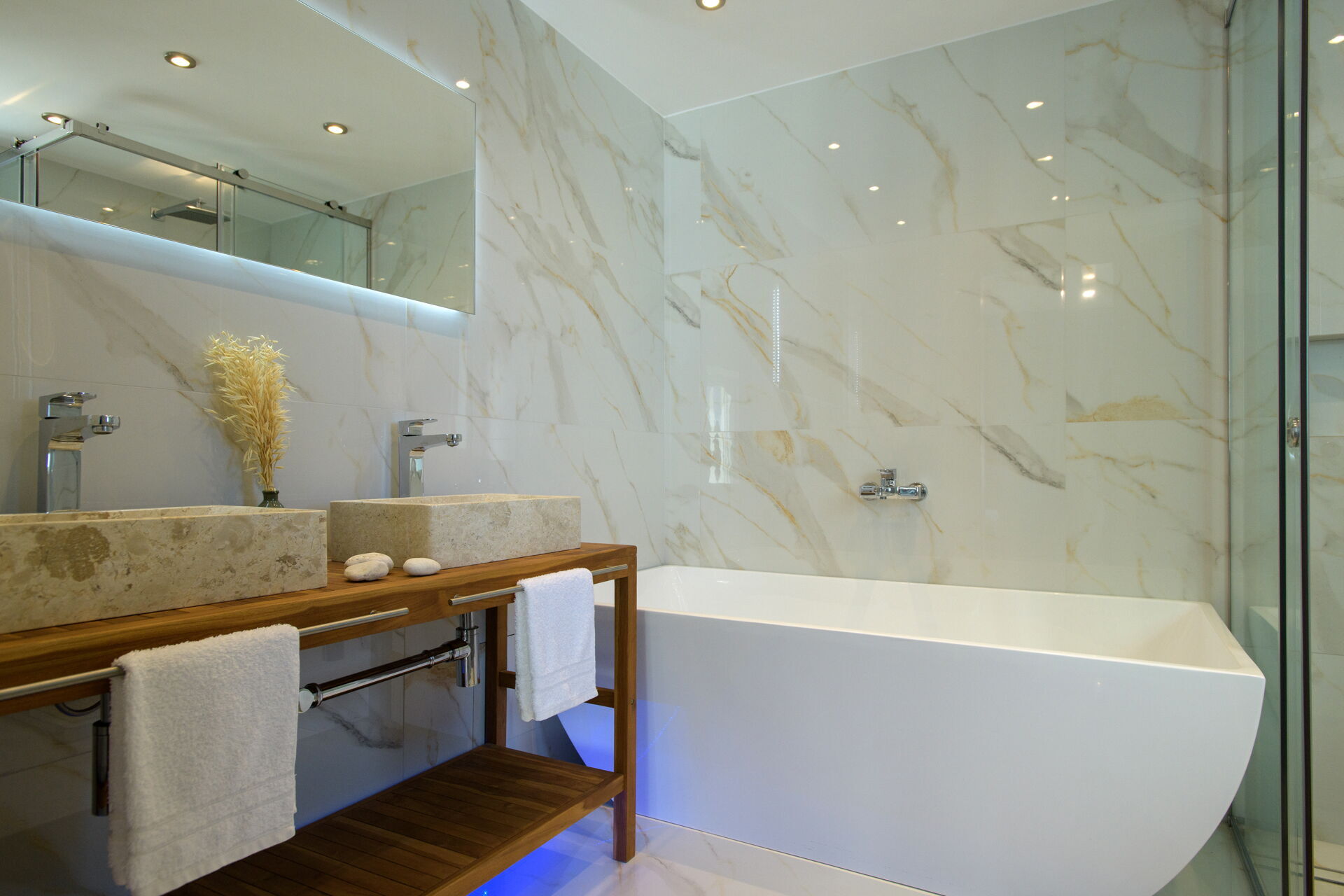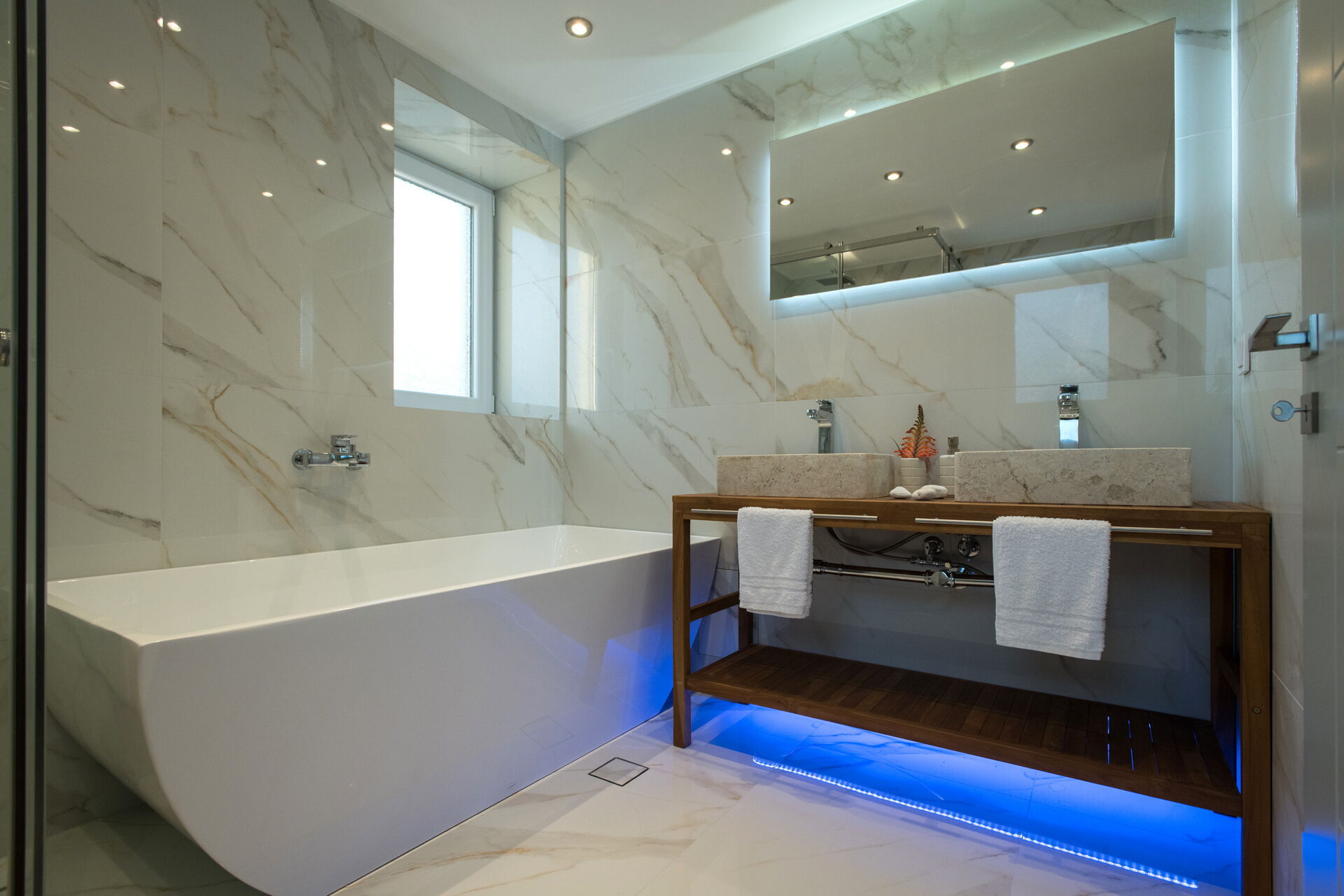 The 3 floor villa has 3 bedrooms and large common spaces, including a wellness area with indoor hot tub (located on the villa’s lower floor). This villa can comfortably accommodate up to 6/8 people in an exclusive setting with sweeping views.