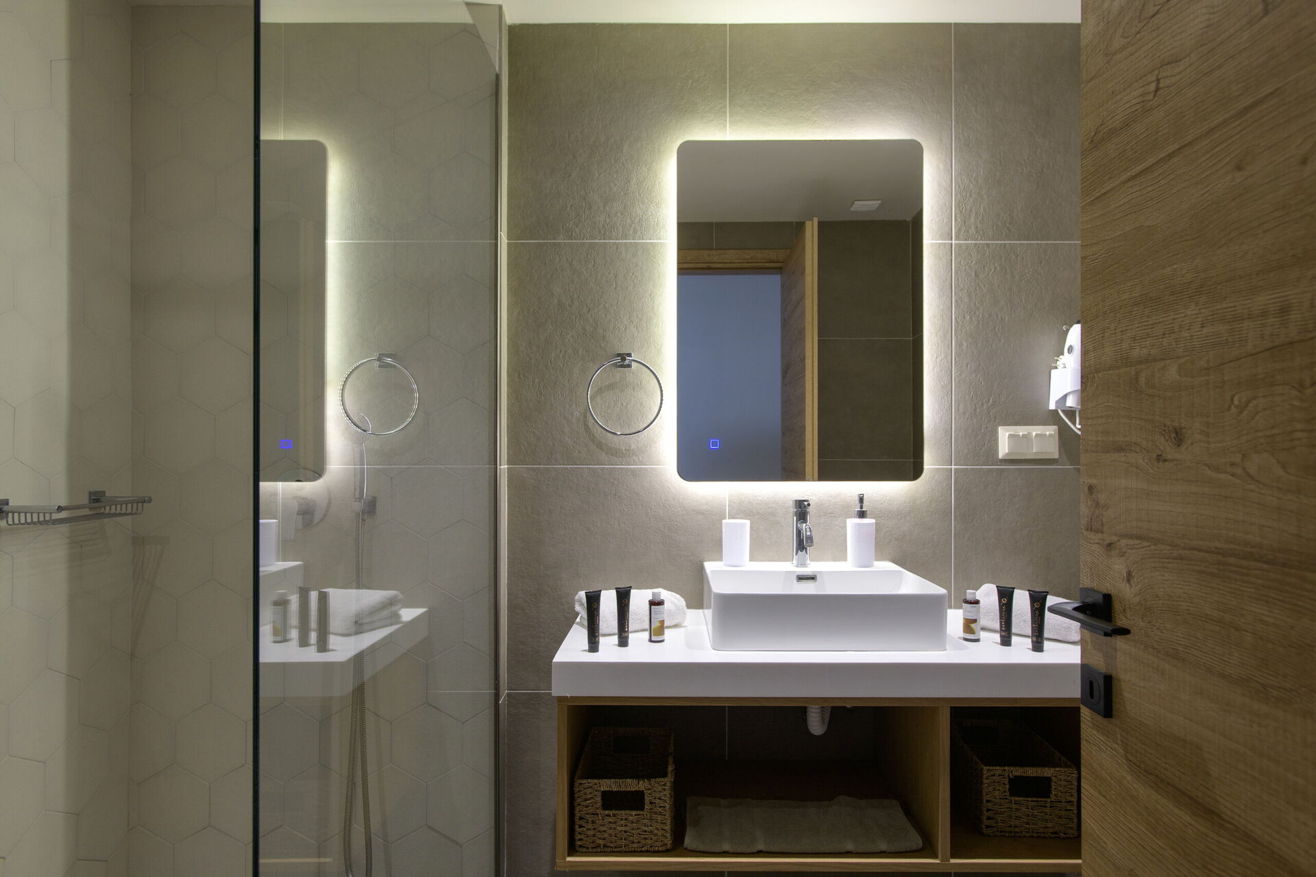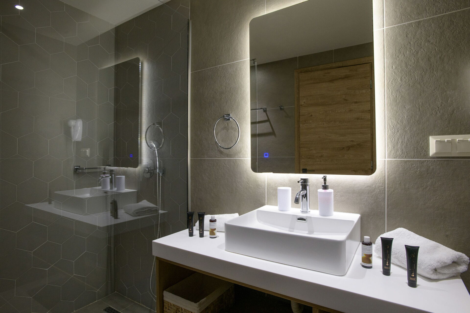 Ground floor: living space with living room (smart TV), dining area and kitchen (oven, freezer, dishwasher, microwave, toaster, electric kettle and coffee maker); WC; 2 bedrooms, each with private bathroom with shower; bedroom with 2 single beds (can be joined upon request) and private bathroom with shower.