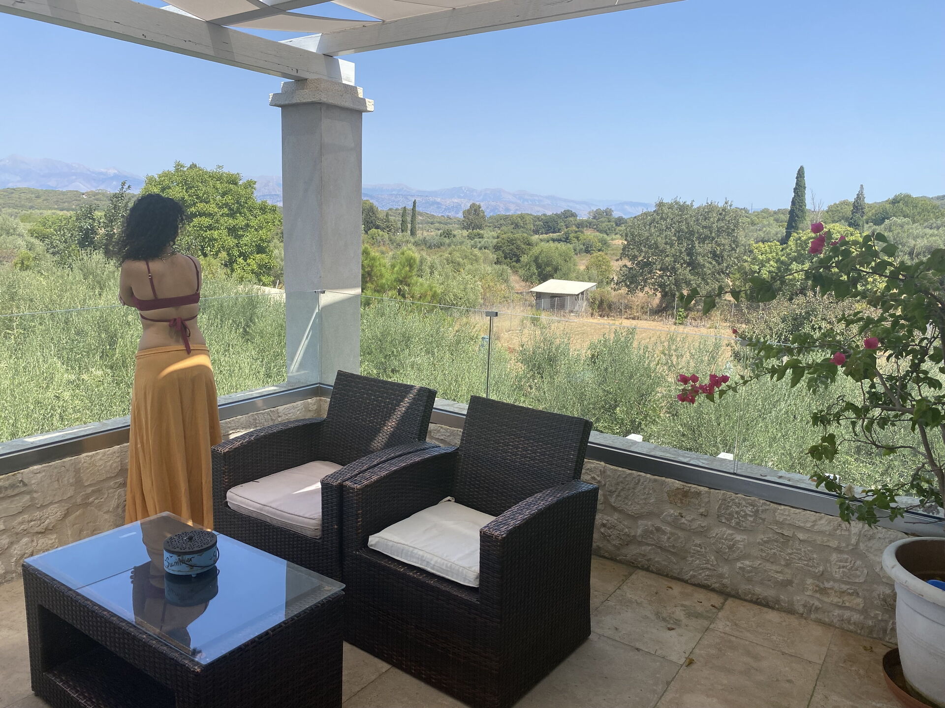 Plenty of room for four people with great pool and lots of different seating areas to enjoy the views and sunsets, enjoy a bbq or just read a book in peace. Regularly cleaned, nice pool. Maybe worth getting some little tables and plastic glasses for safety. Perfect position close to Almiros Beach, and within reach of shops and tavernas but you would need a car. Everything you need within five minutes drive. Brilliant owner. Drove out to meet us on main road and directed us to villa. Athenasia lives in annex but rarely saw her apart from to shout hello when we saw her and if we needed anything, otherwise she kept very quiet so didn’t feel loss of privacy.