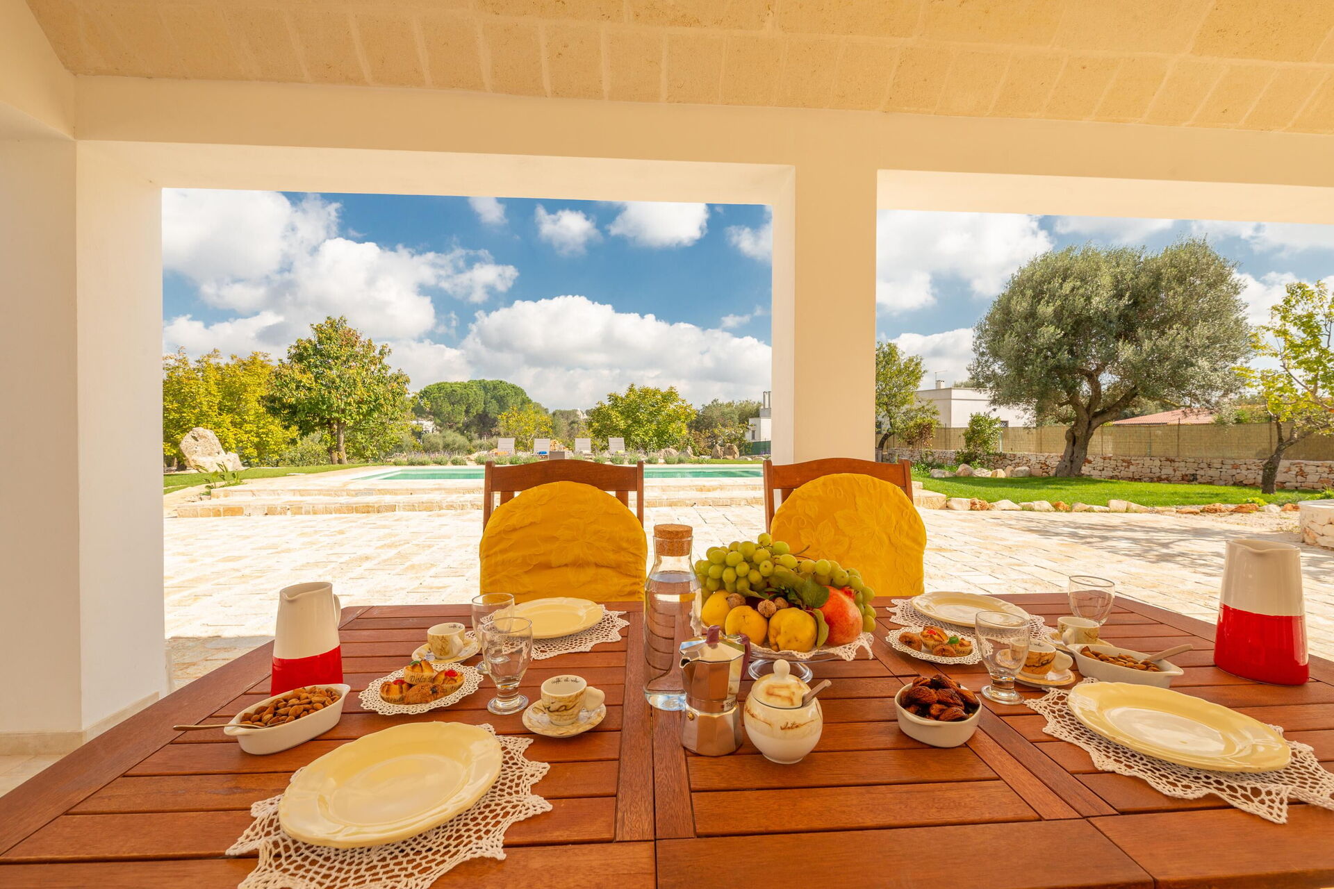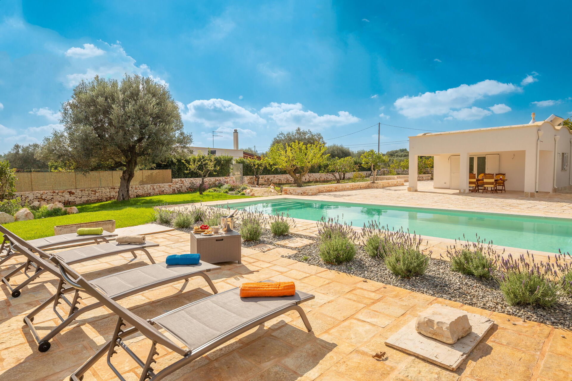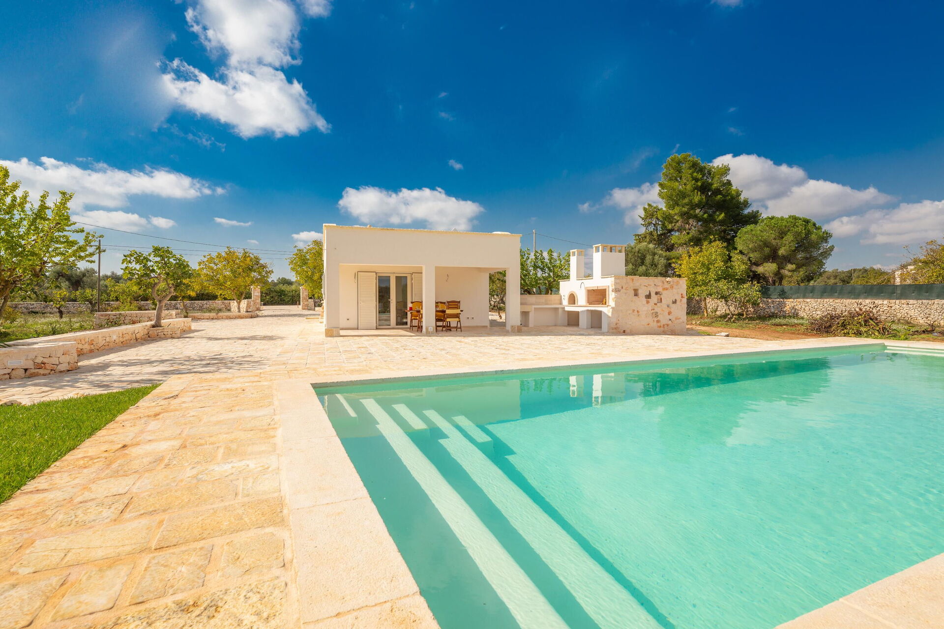 This villa rental is nestled in a large, fenced-in garden of approximately 4000 m2. Spend the hot Apulian summer days outside, relaxing by the elegant private pool with Roman steps; enjoying time with your friends on the veranda; and strolling in the park among the olive trees.