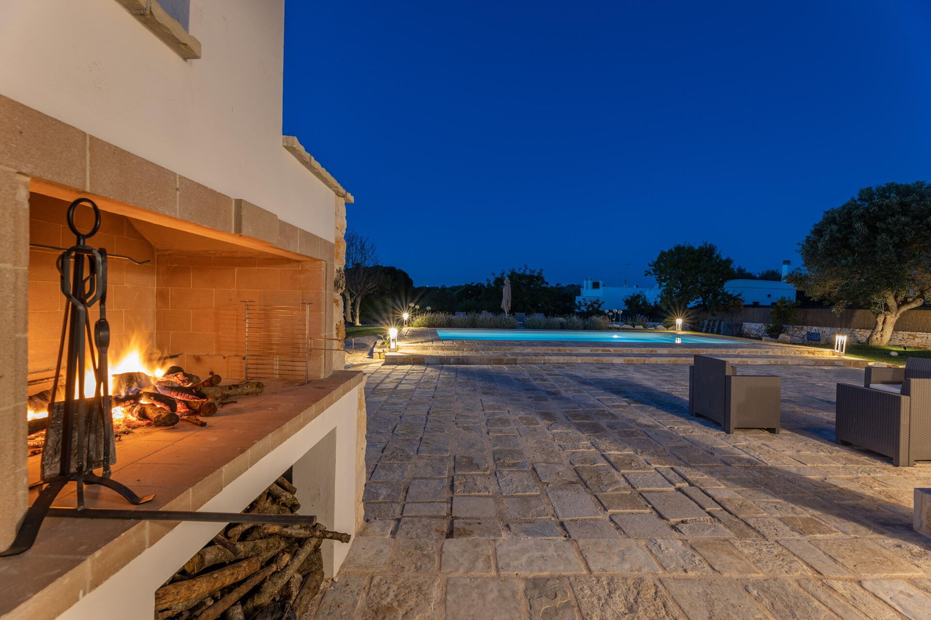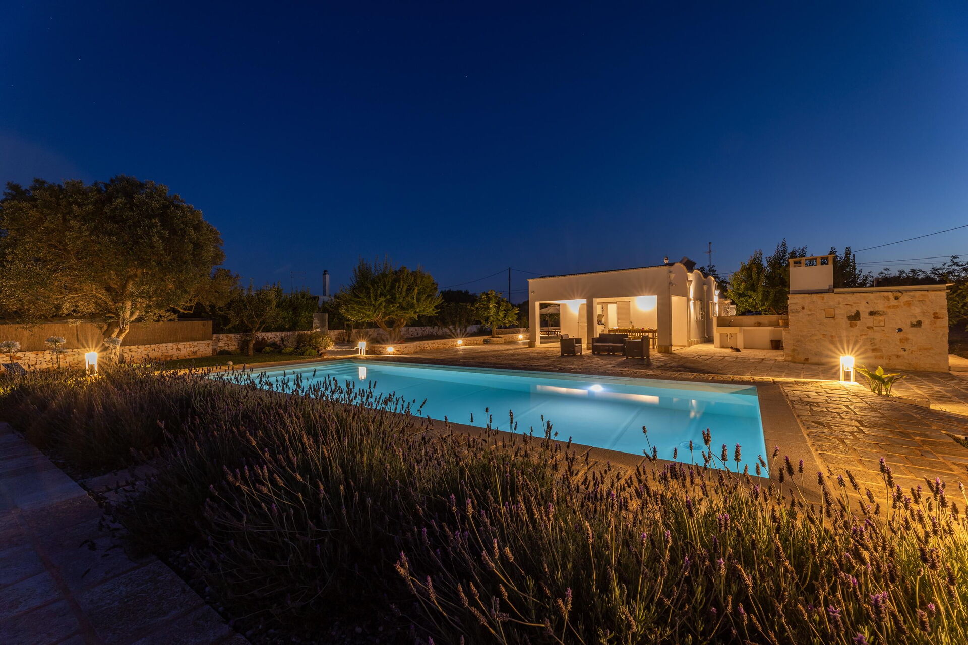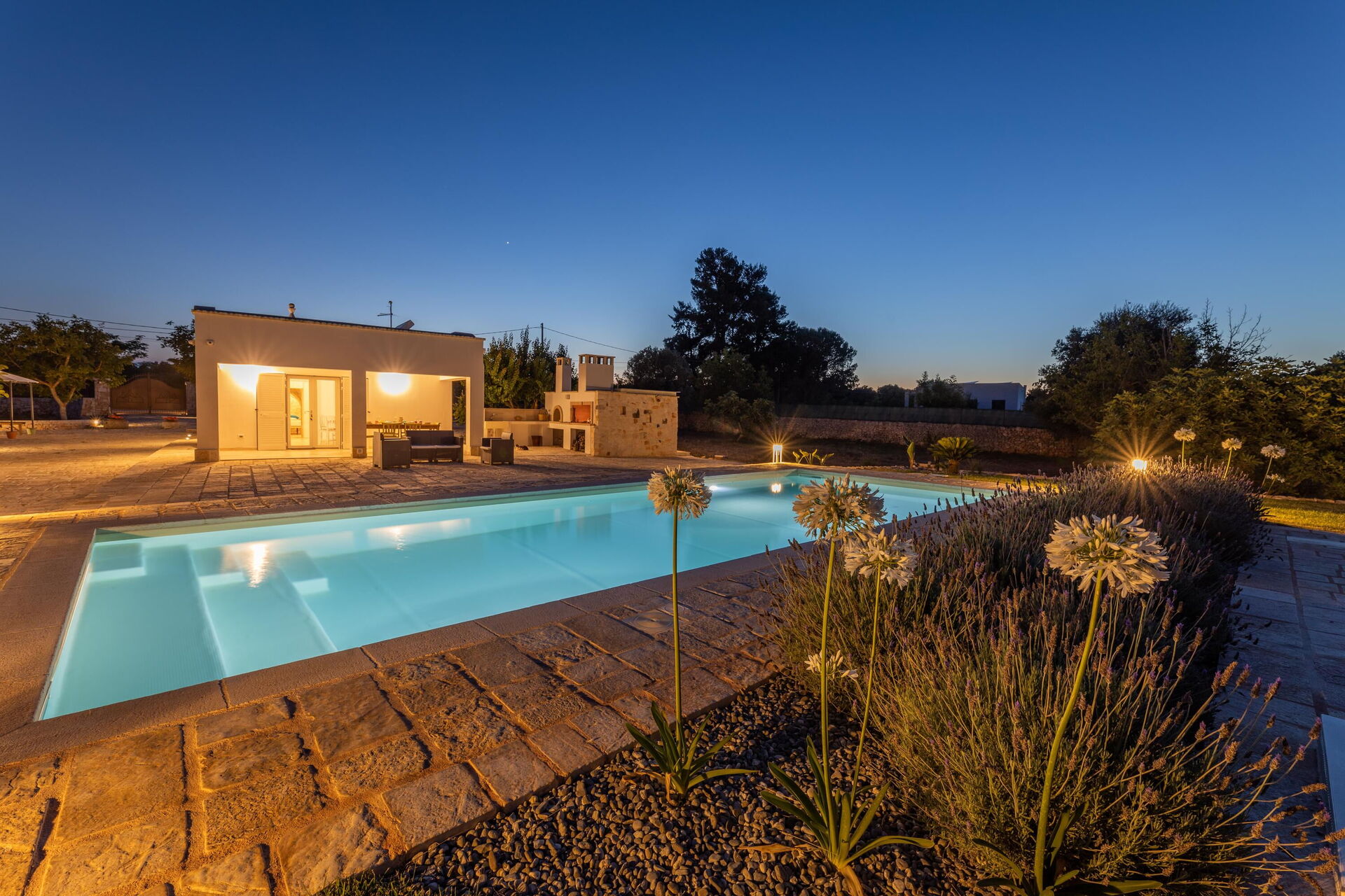 This villa rental is nestled in a large, fenced-in garden of approximately 4000 m2. Spend the hot Apulian summer days outside, relaxing by the elegant private pool with Roman steps; enjoying time with your friends on the veranda; and strolling in the park among the olive trees.