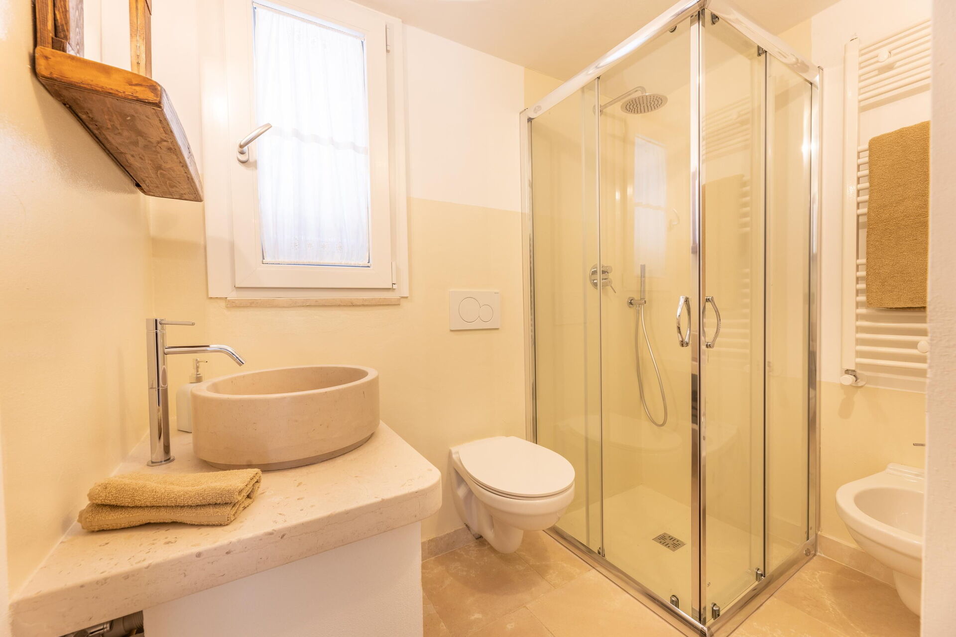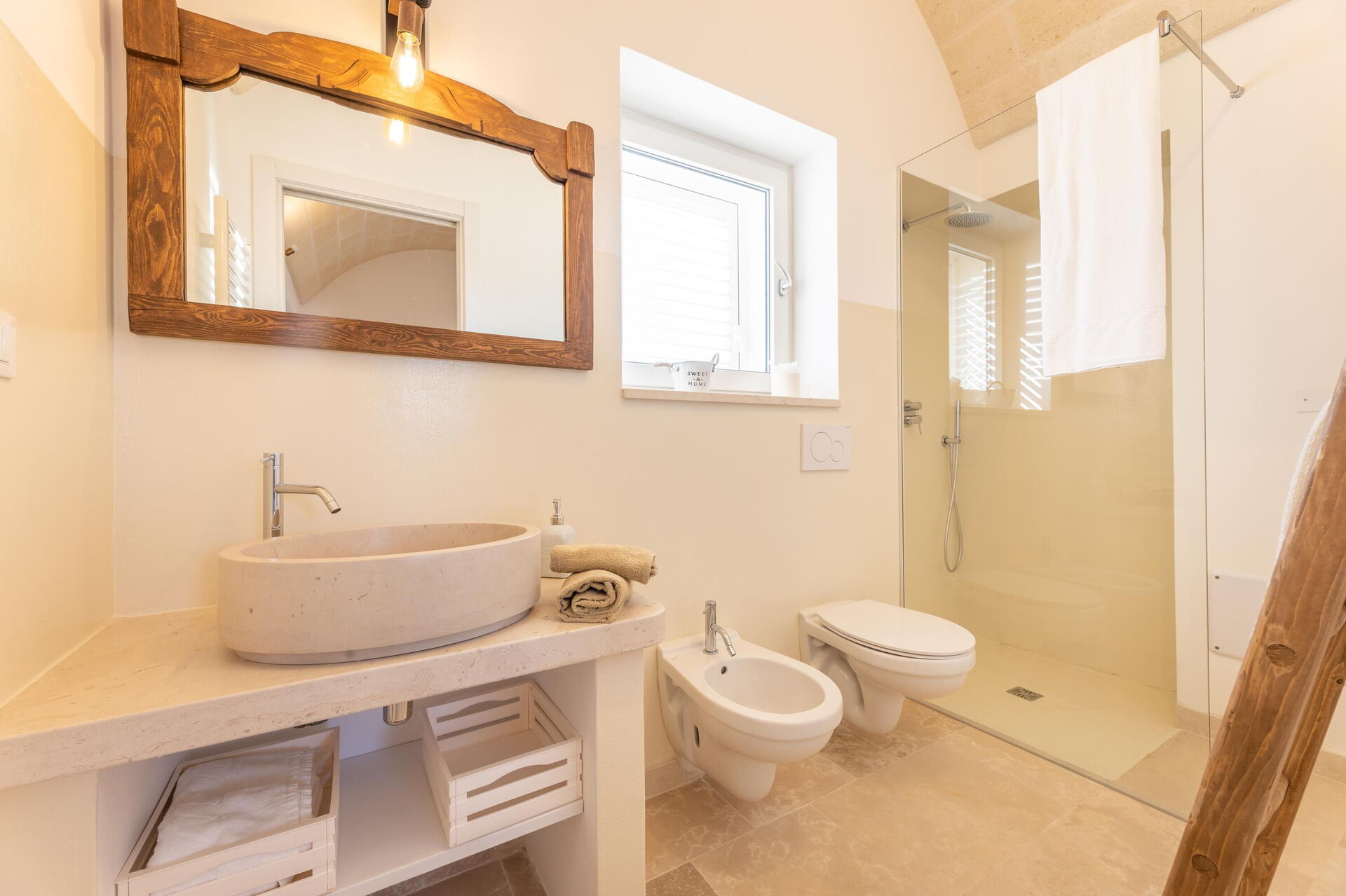 Ground floor: entryway and kitchen (dishwasher, microwave, freezer and oven) and living room with double sofa bed (available upon request for an extra fee); double bedroom with private bathroom with shower; large double bedroom carved out of the trullo; bathroom with shower.