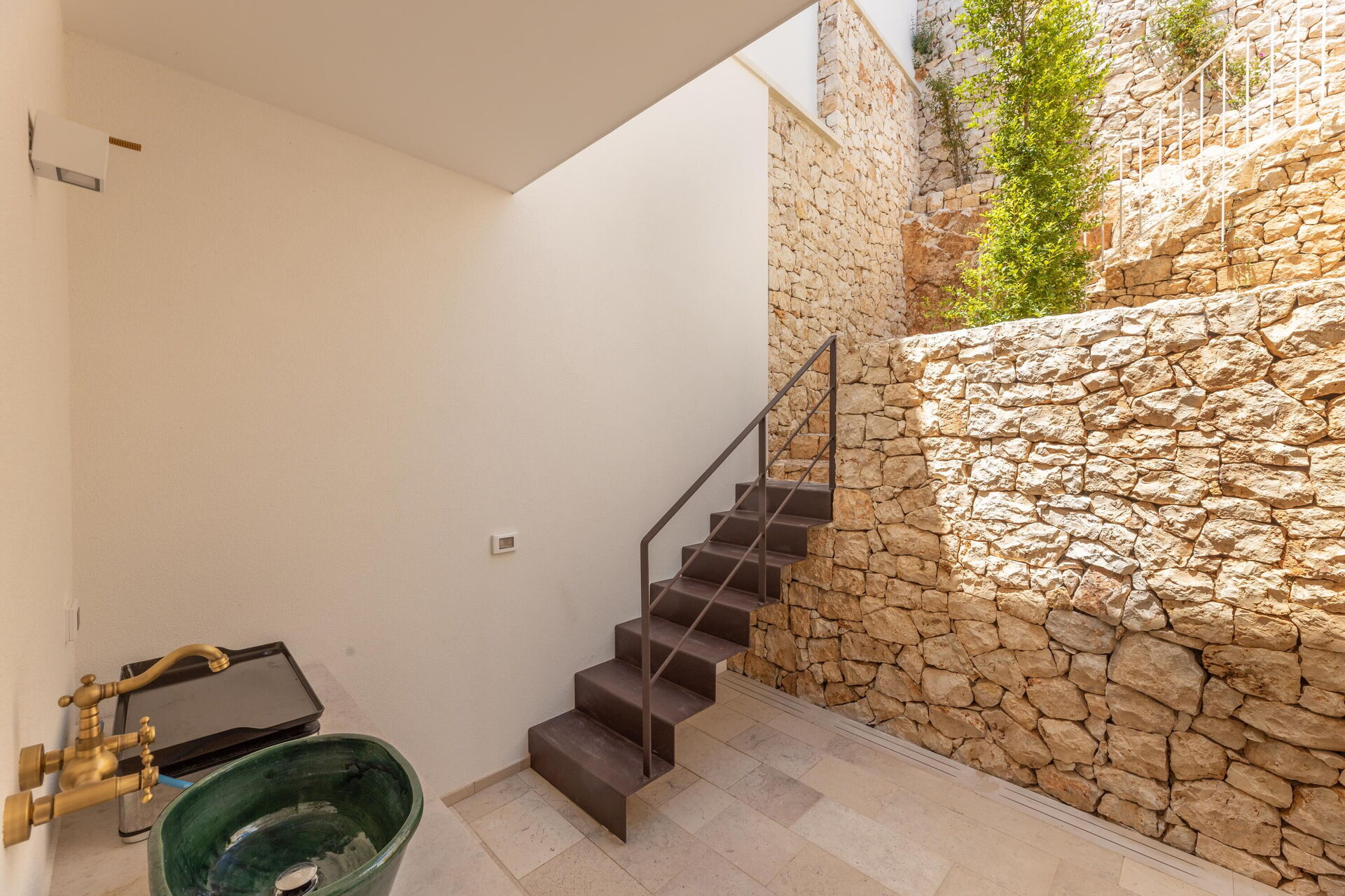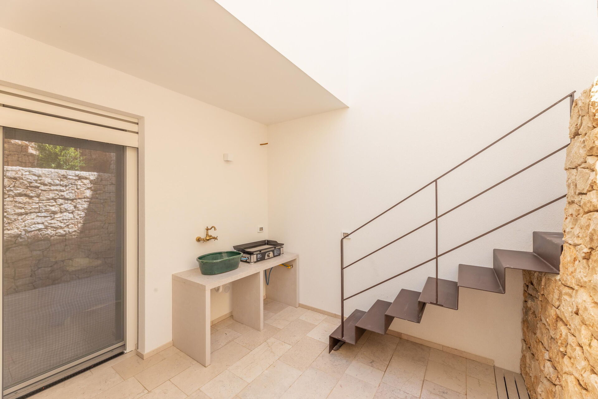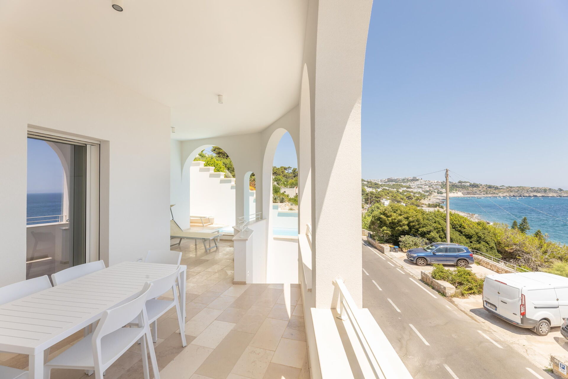 The apartment offers a scenic covered terrace with large, open arches and a table and chairs for dining outdoors. There is a private pool (heating in spring and autumn is included in the price) with lovely views of Apulia’s blue sea.