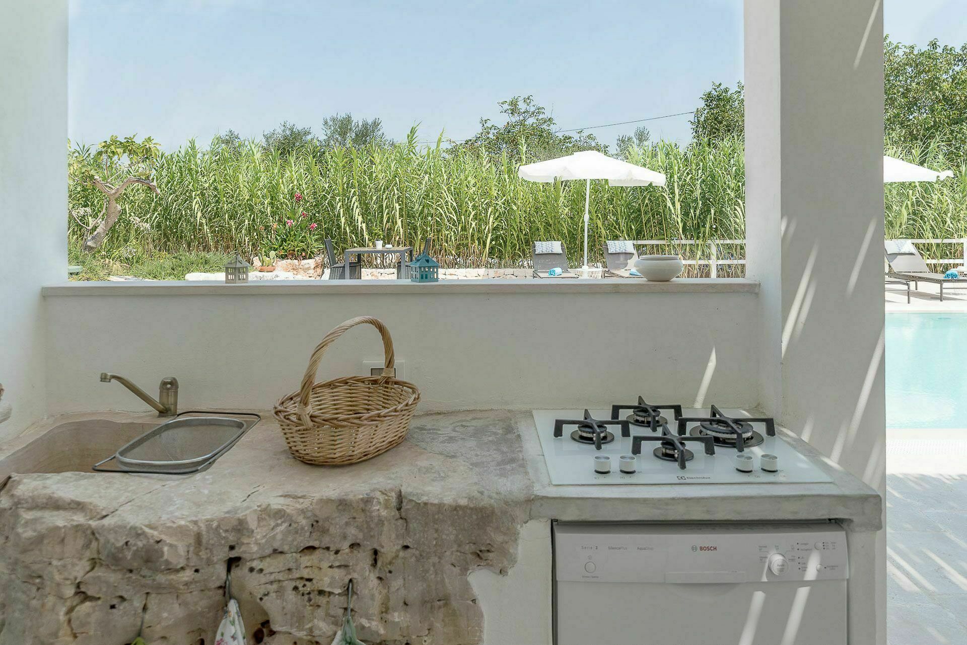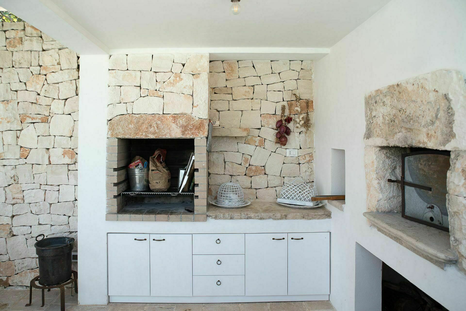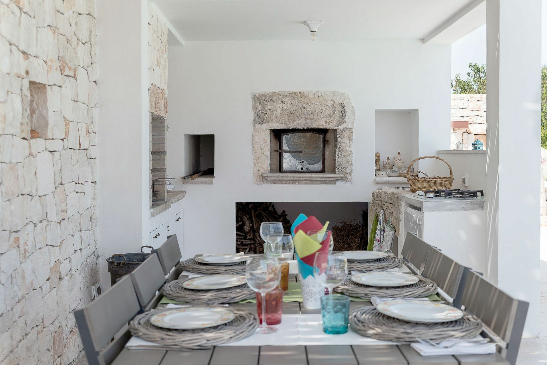 The trullo rental also offers a large covered veranda near the pool with an outdoor kitchen with a dishwasher, wood burning oven, barbecue and dining area, perfect cooking out with friends and relatives. Near the veranda there is a lounge area with stone seats. By “La Lamia” a charming pergola offers an outdoor area with table and chairs so you can relax and take in the incredible Salento countryside.