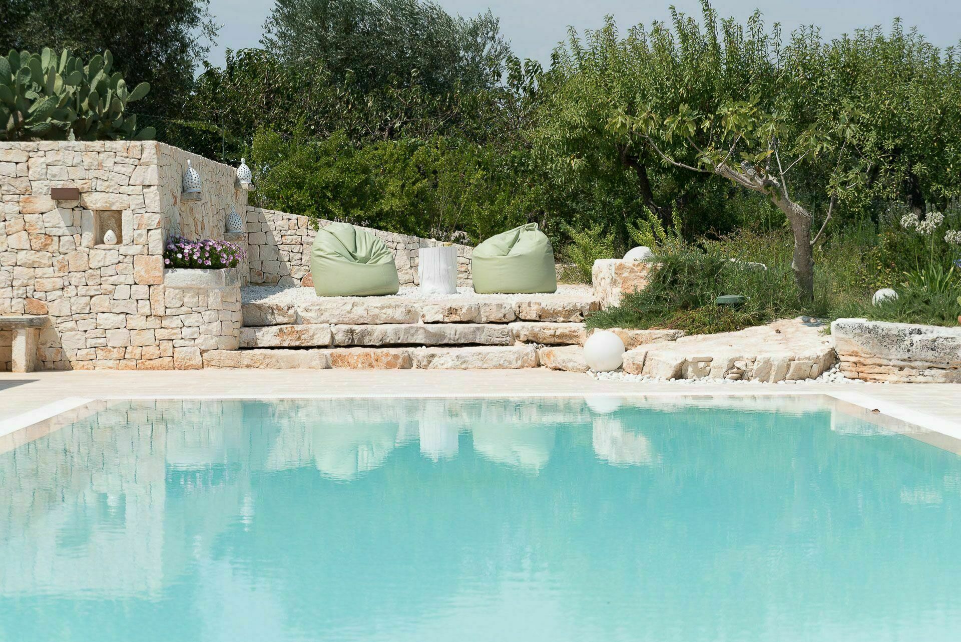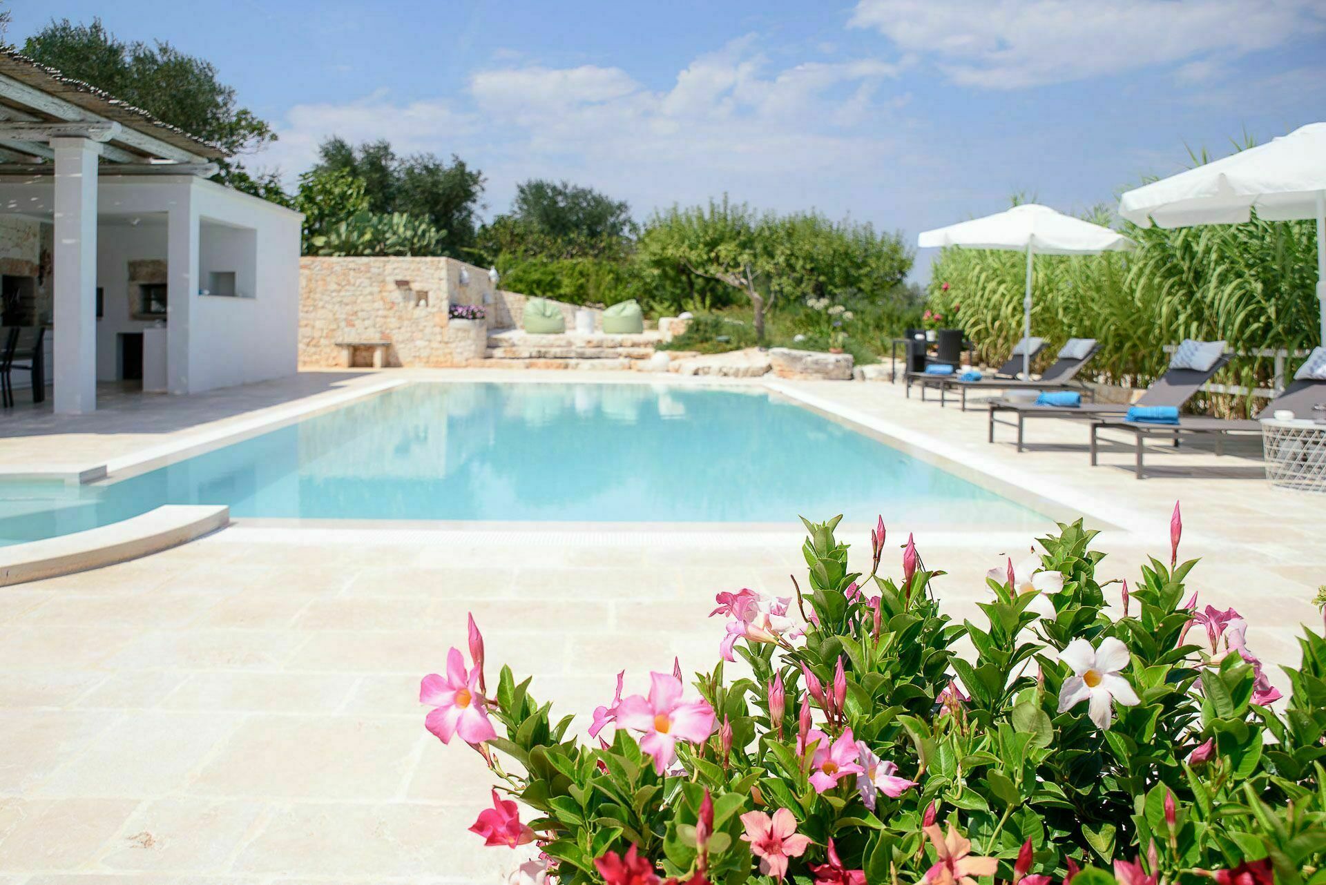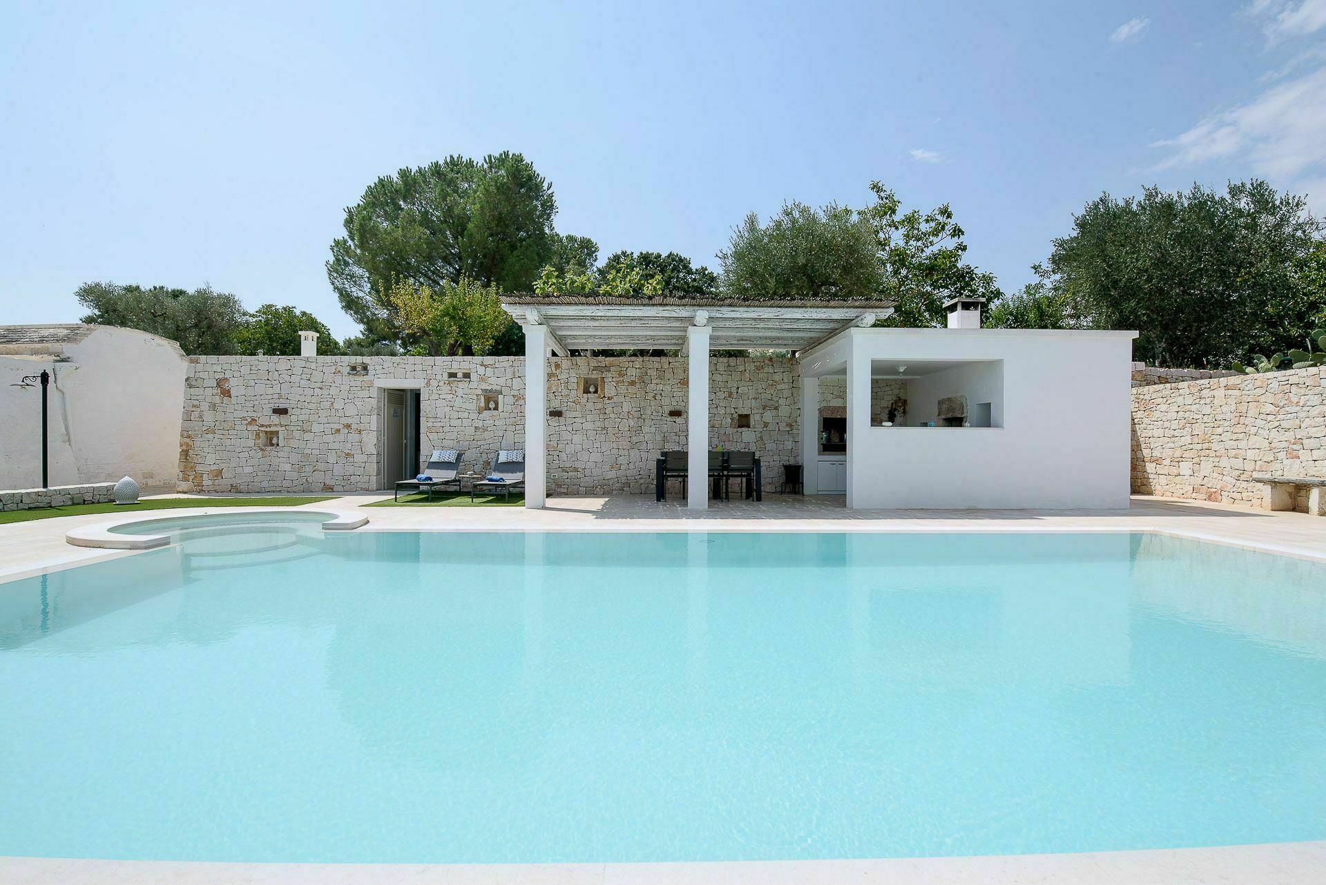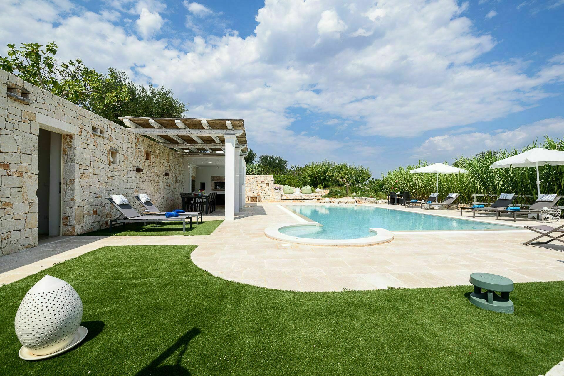 A large, well-tended garden surrounds the property. Behind the villa there is a spectacular saltwater pool flanked by an elegant green lawn. The pool has Roman steps for easy access, and an area with relaxing massage jets. You can enjoy the sun and peacefulness of the Apulian countryside from the poolside sun loungers.