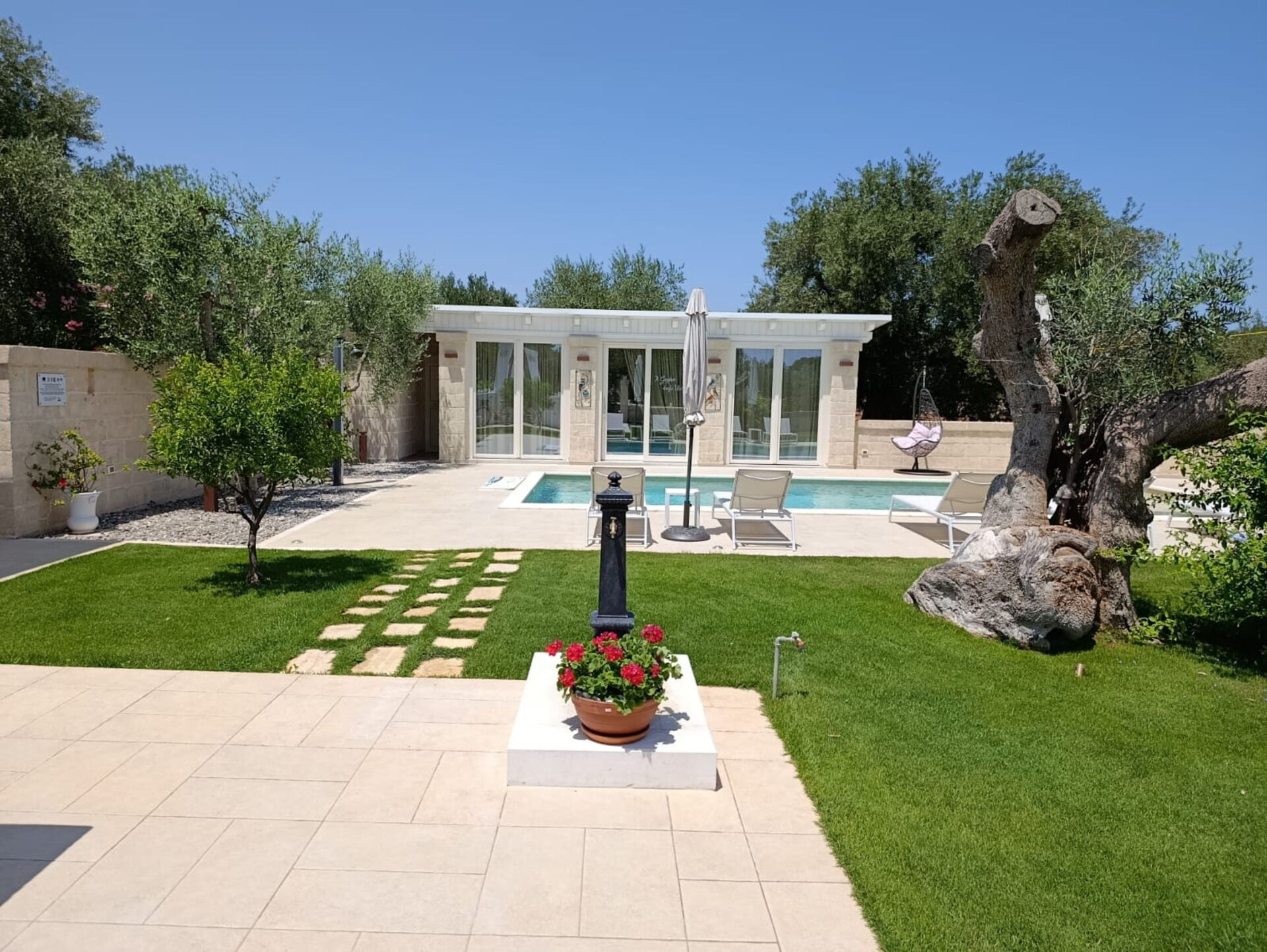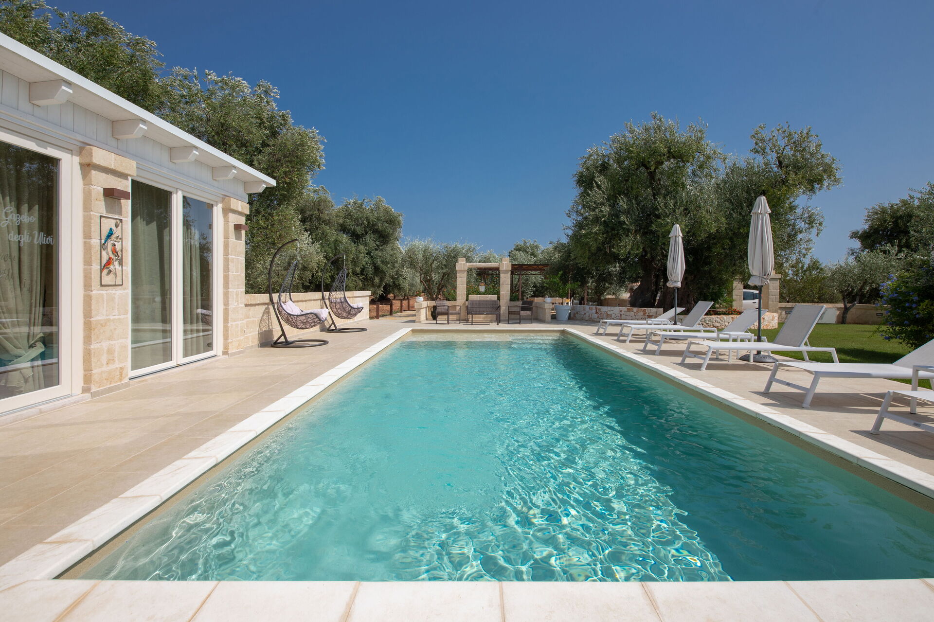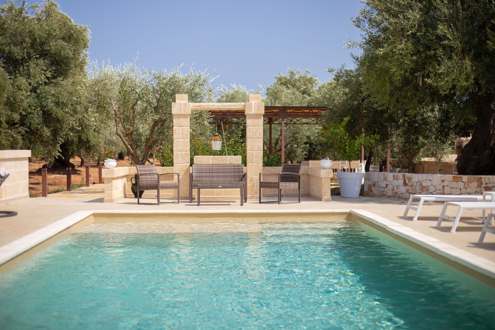 Outside, there is an elegant private pool, and spacious common areas for spending time in the fresh air: a large pergola with a lovely relaxation area and a stone barbecue.