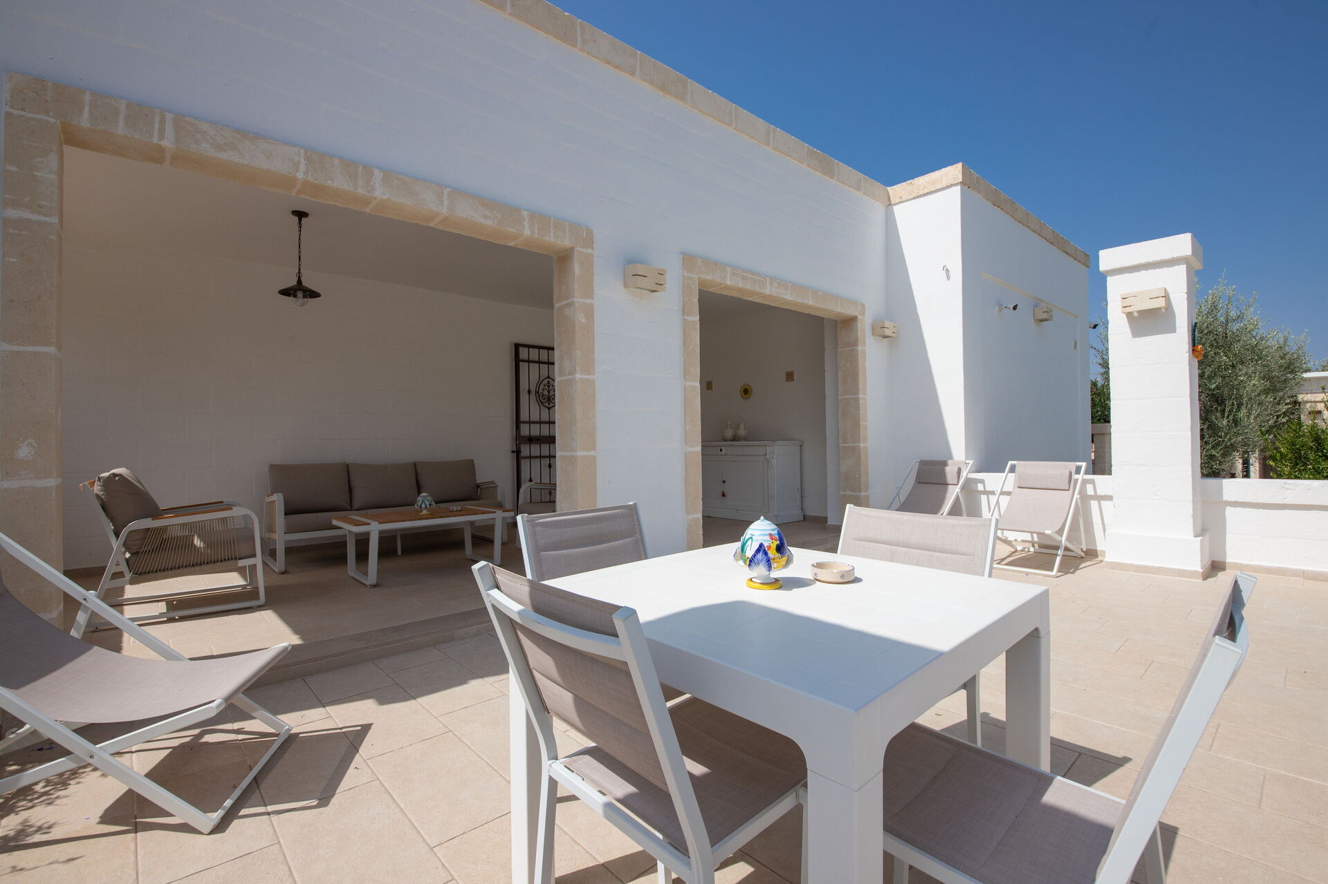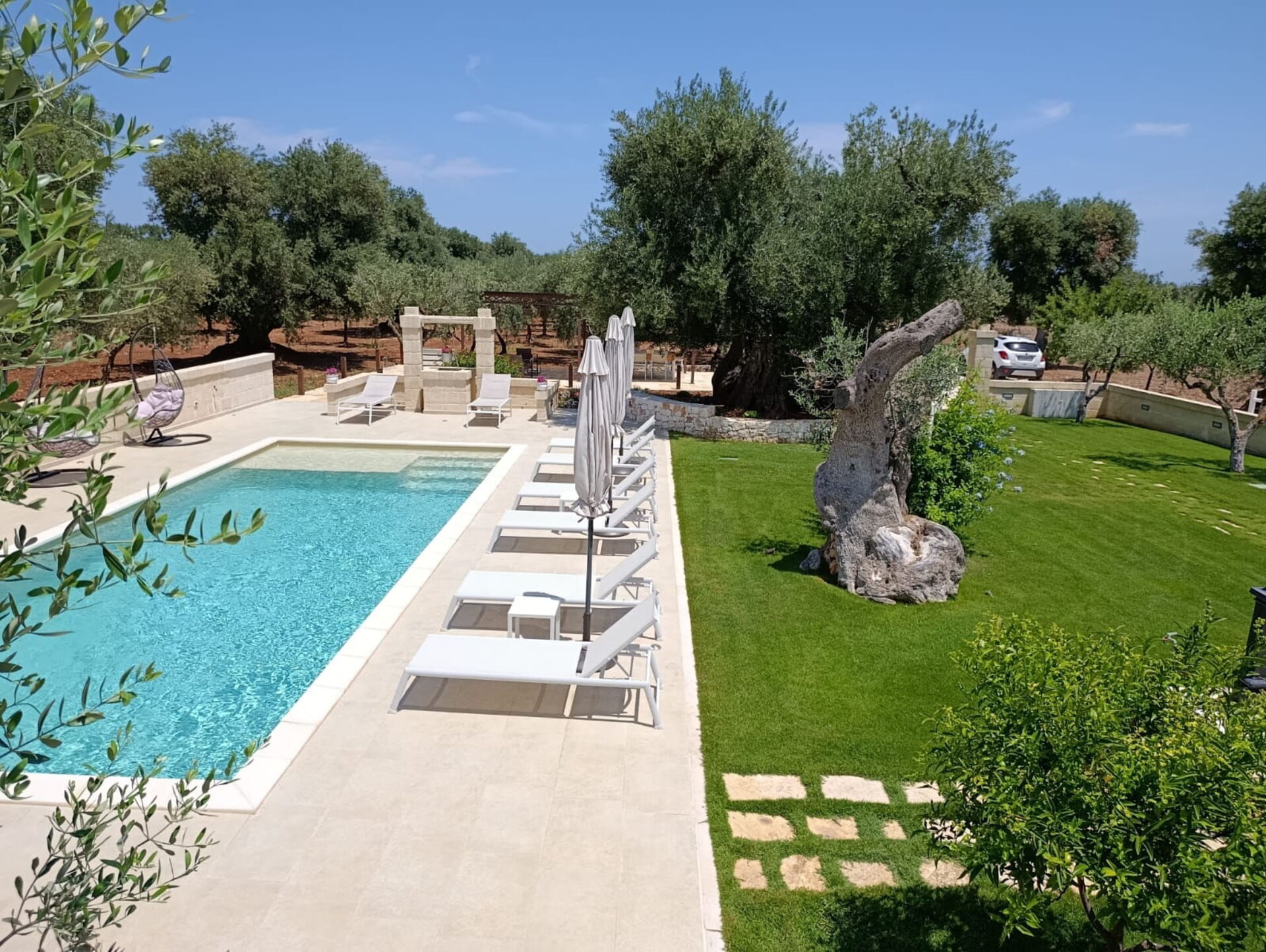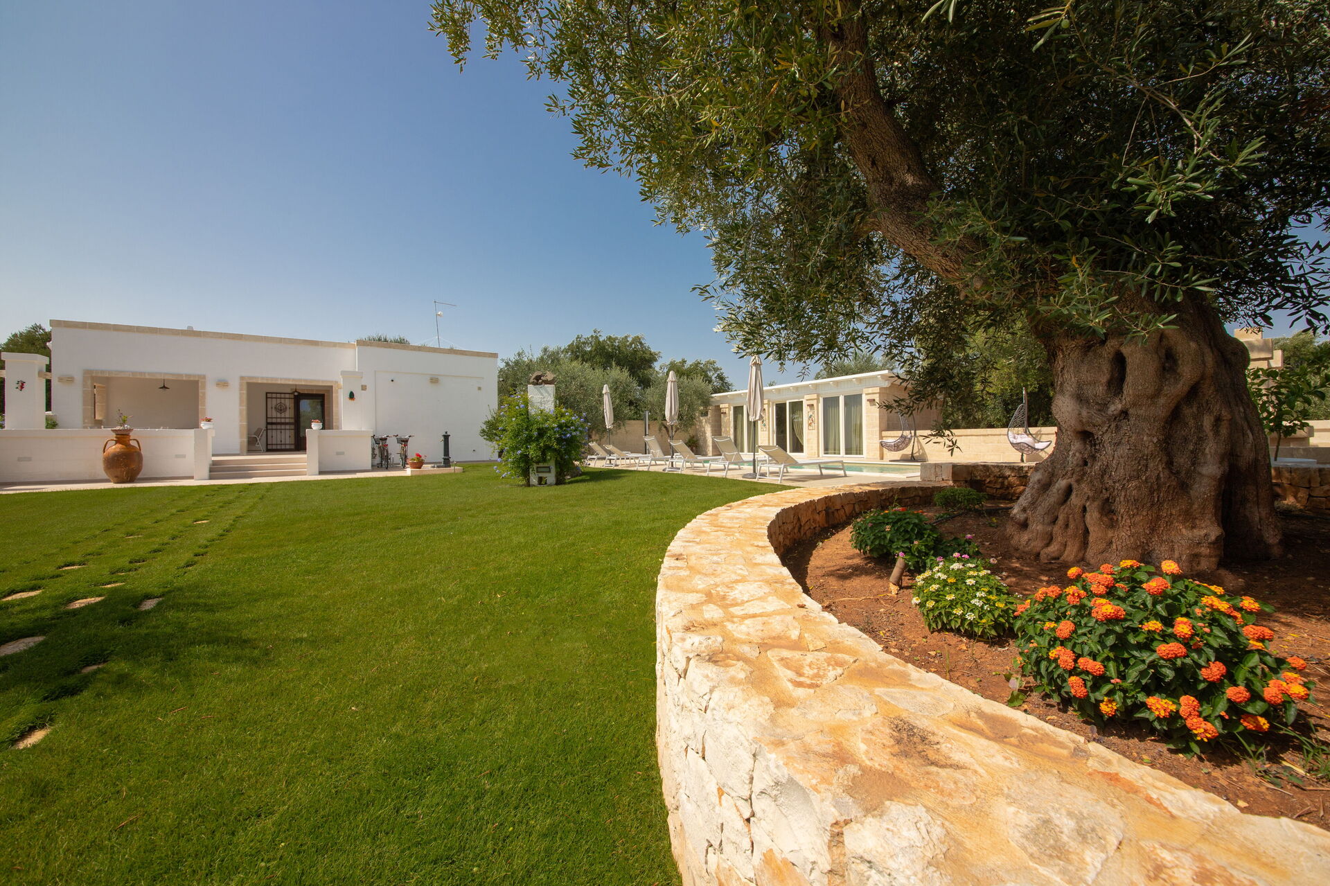 The house is nestled in a splendid rural area among thousand-year-old olive trees. Its central location is within easy reach of the Itria Valley’s charming small villages, and the sandy beaches of the Adriatic coast.