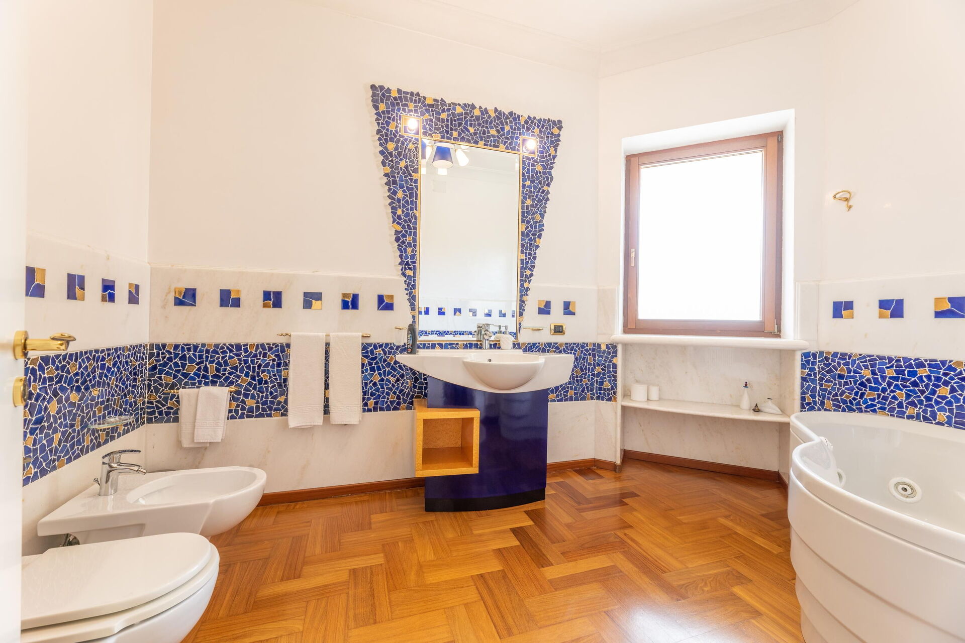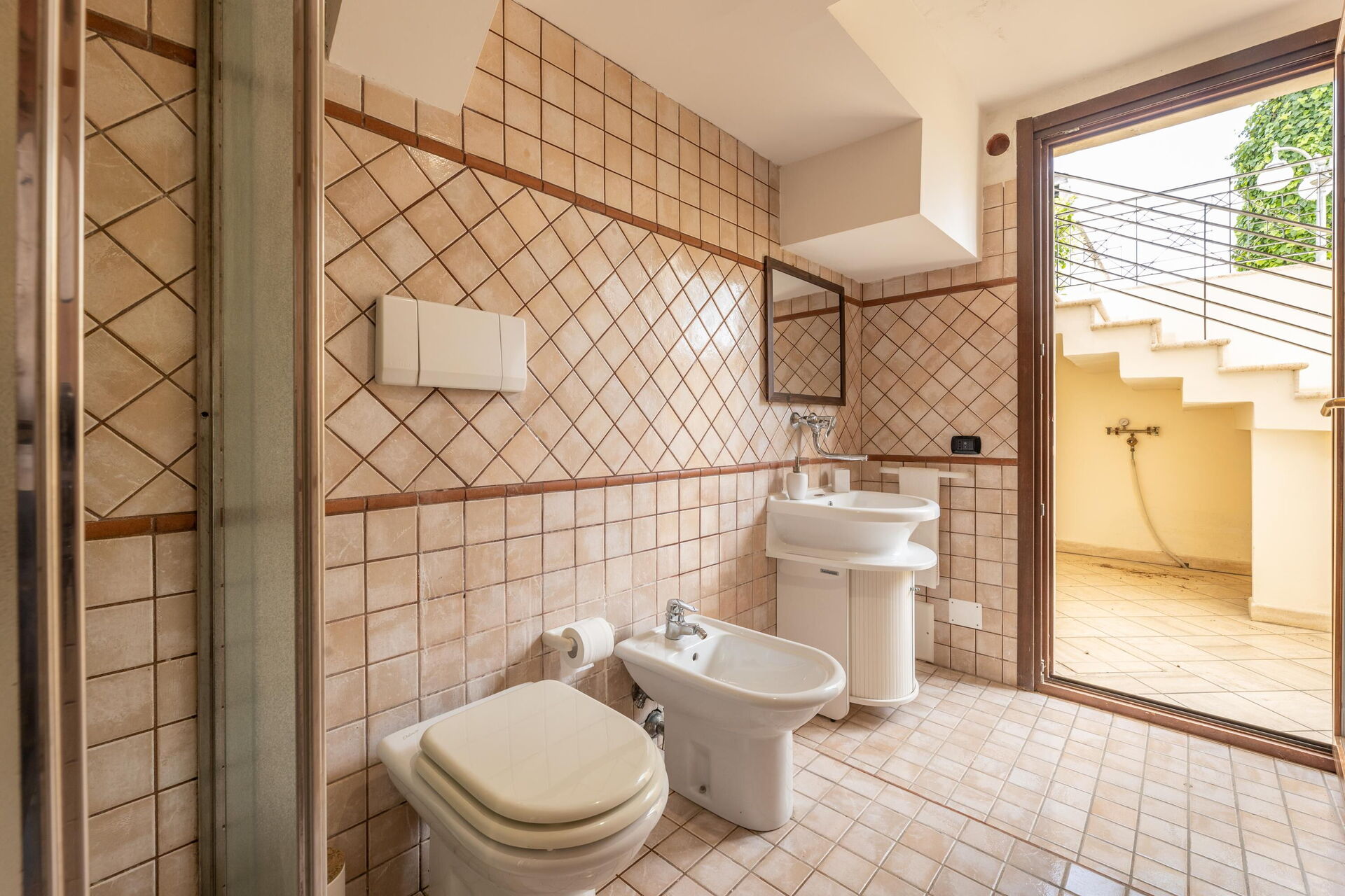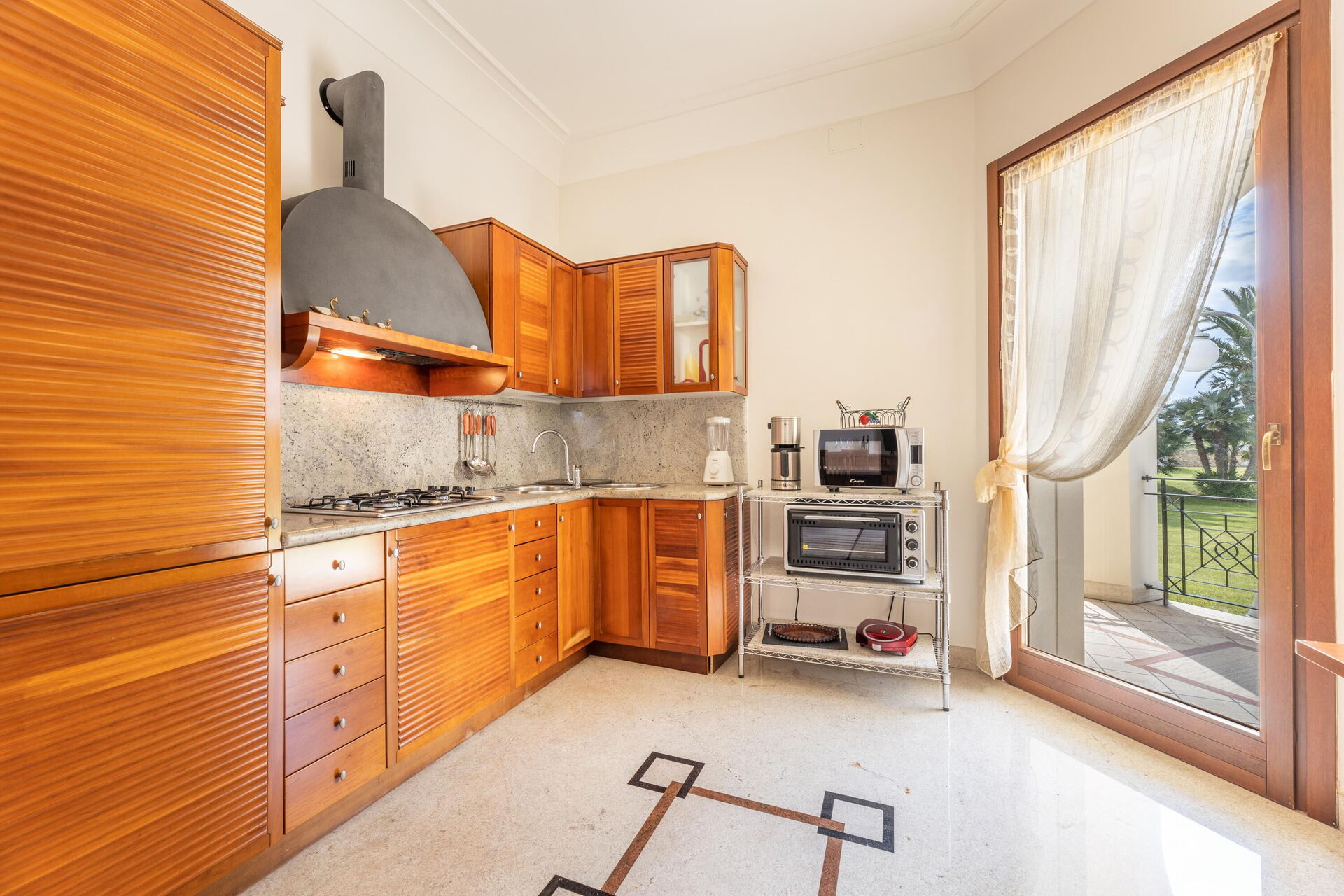 Raised ground floor: entrance, living room (piano), dining room (satellite tv) with loggia access, kitchen (cooktop, oven, freezer, refrigerator, dishwasher, microwave, coffee maker); double bedroom with a private bathroom with shower, double bedroom, bathroom with hot tub, bedroom with a double bed (can be converted upon request to 2 single beds) and single bed (extra, upon request), bathroom with shower.