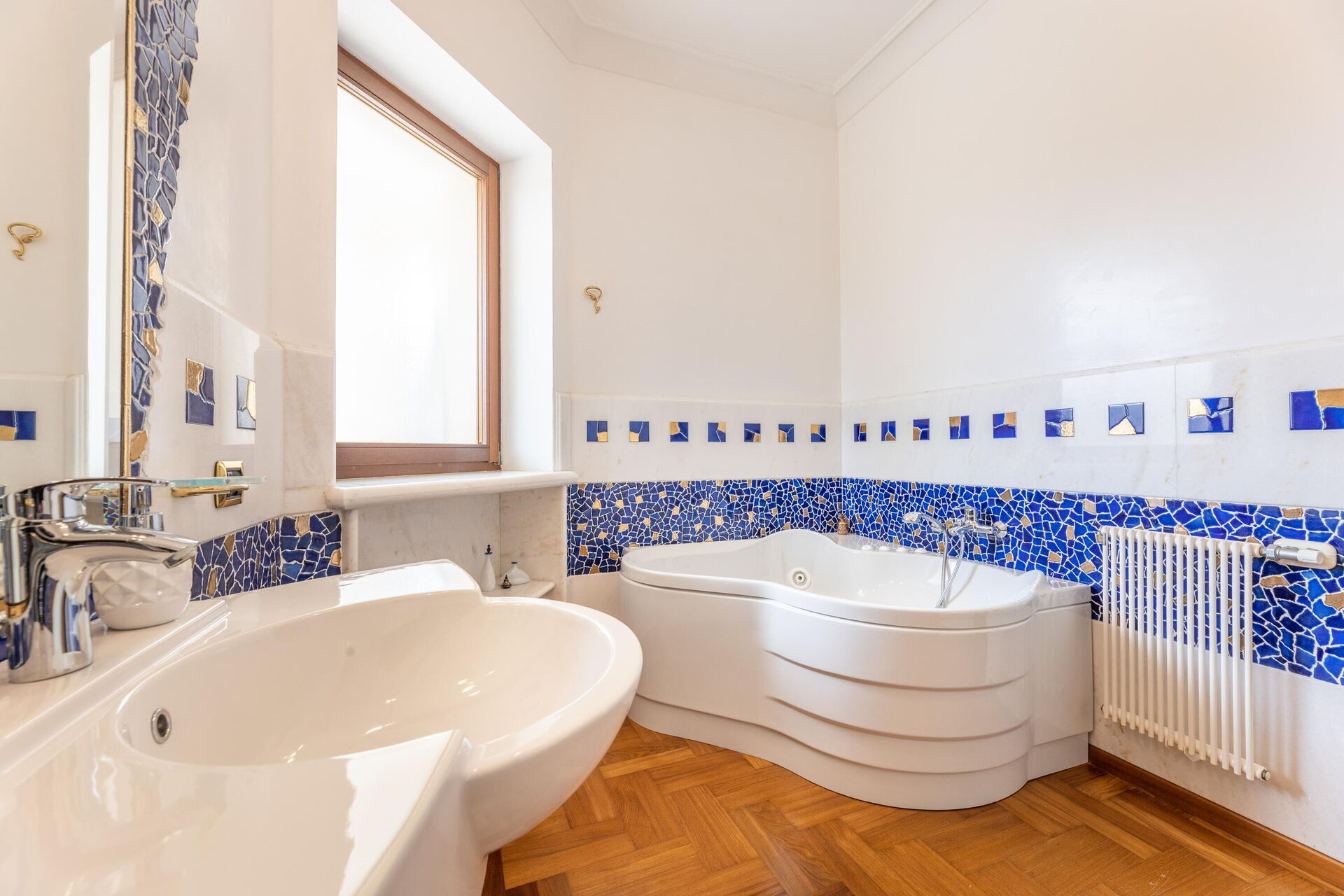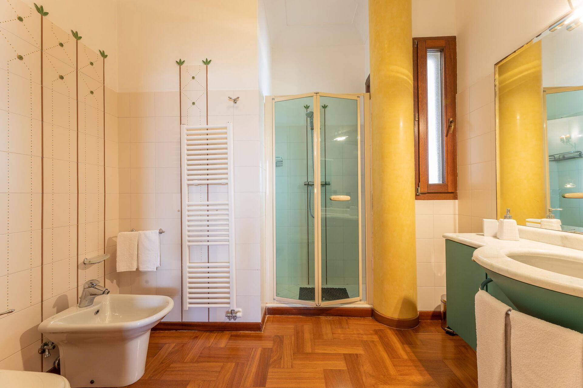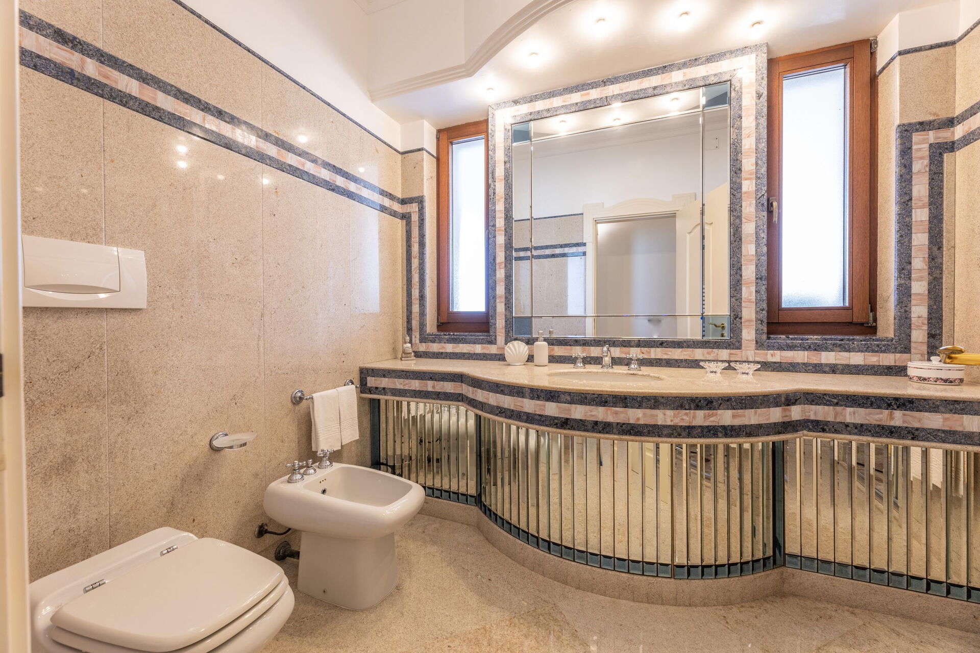 Raised ground floor: entrance, living room (piano), dining room (satellite tv) with loggia access, kitchen (cooktop, oven, freezer, refrigerator, dishwasher, microwave, coffee maker); double bedroom with a private bathroom with shower, double bedroom, bathroom with hot tub, bedroom with a double bed (can be converted upon request to 2 single beds) and single bed (extra, upon request), bathroom with shower.