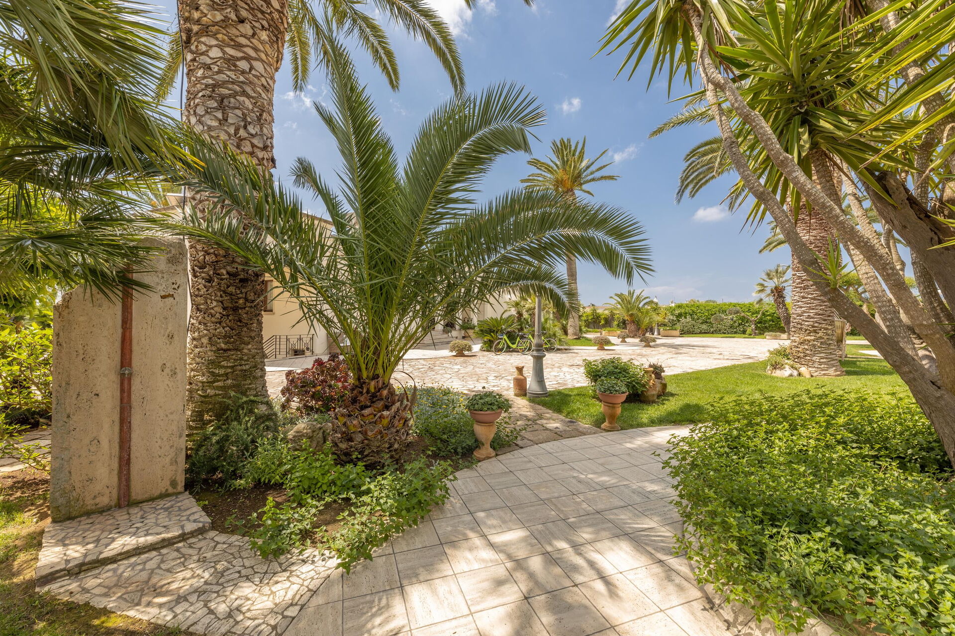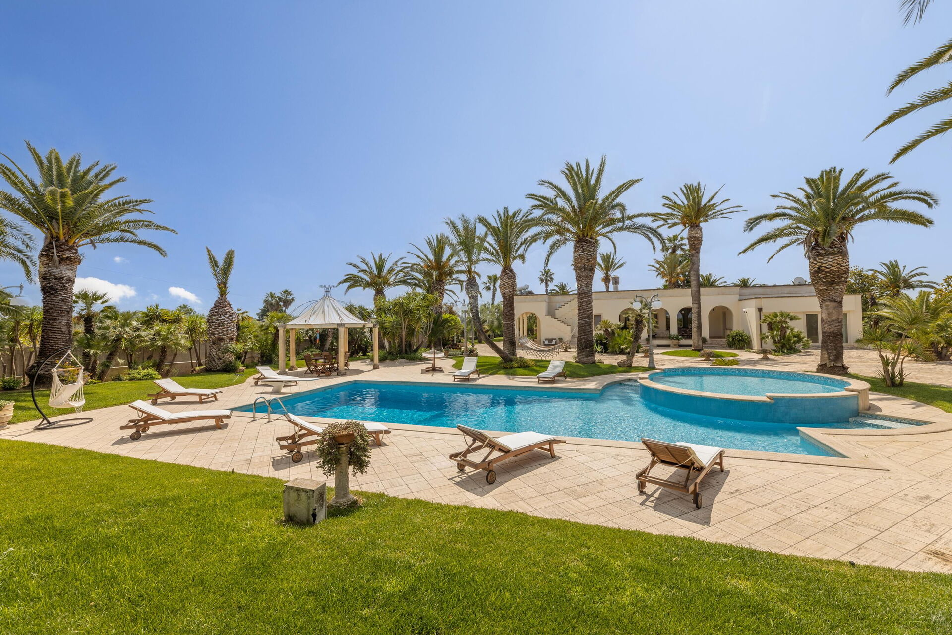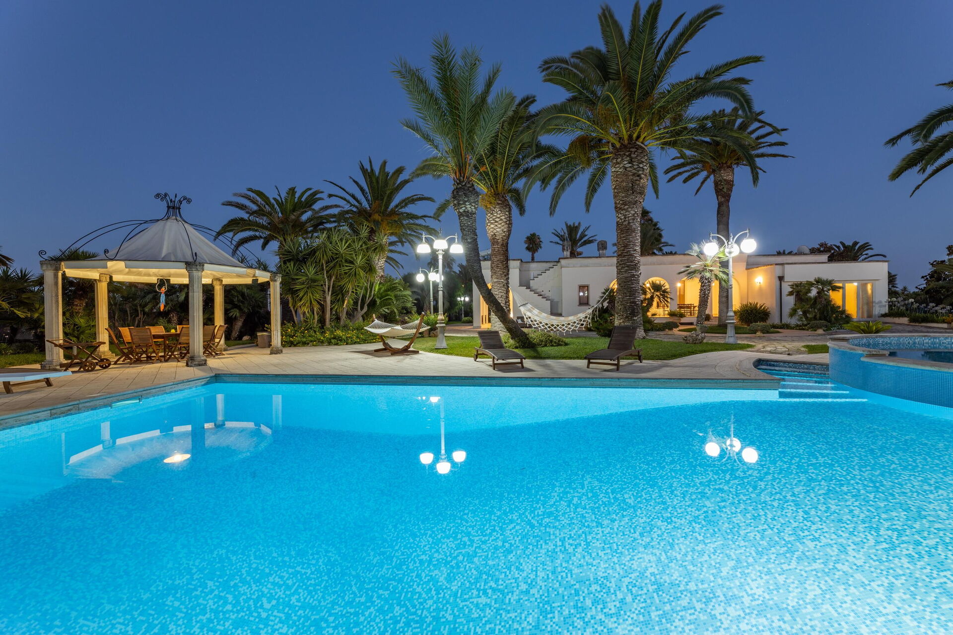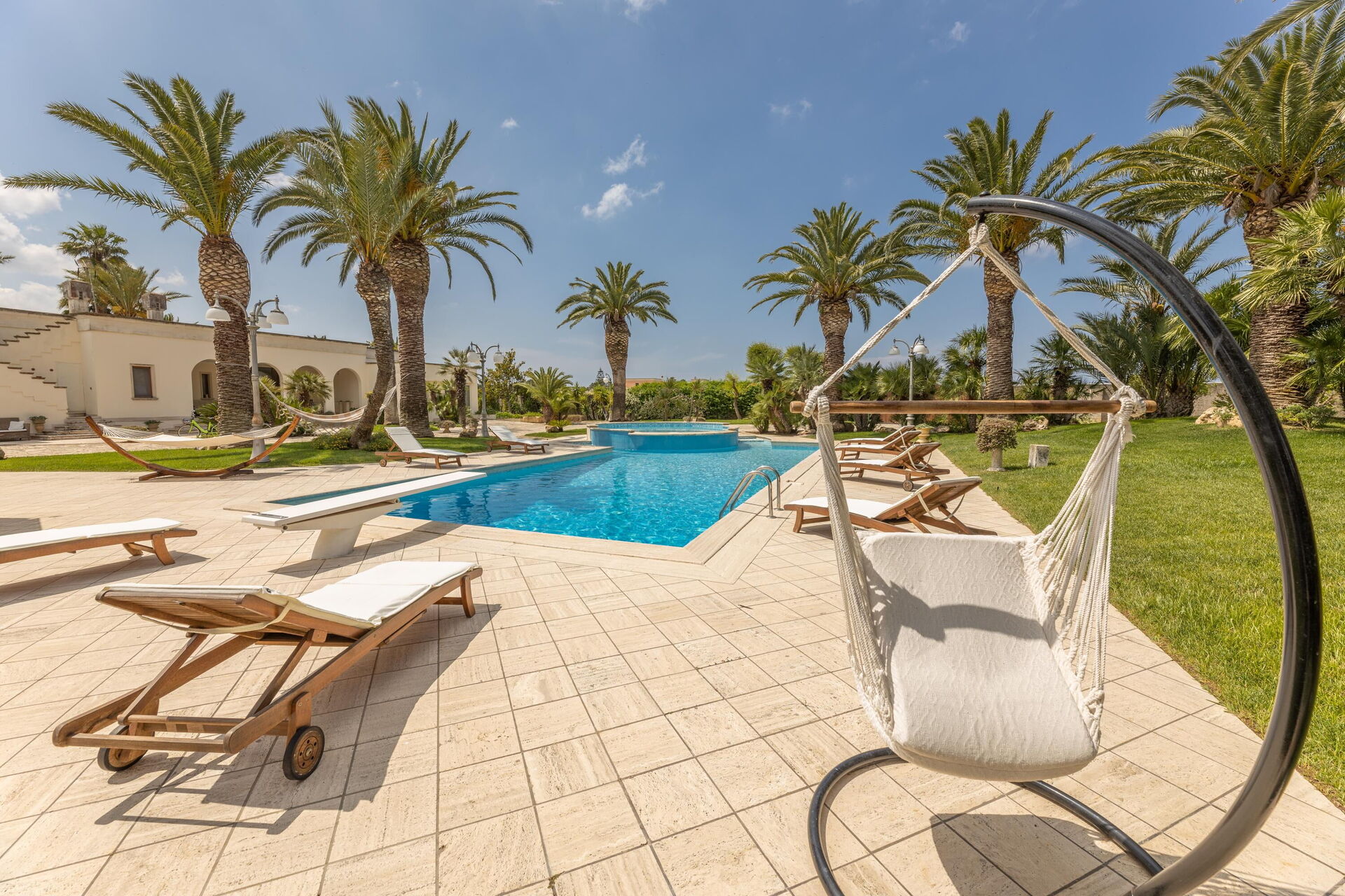 Villa Oasi di Pace is nestled in a 5000 square meter garden which is splendidly cared for, with a lawn, beautiful palm trees, and a fabulous private pool. This vacation villa rental with a private pool in Apulia is completely independent, and you can enjoy a vacation in total privacy just kilometers from the region’s beautiful beaches.