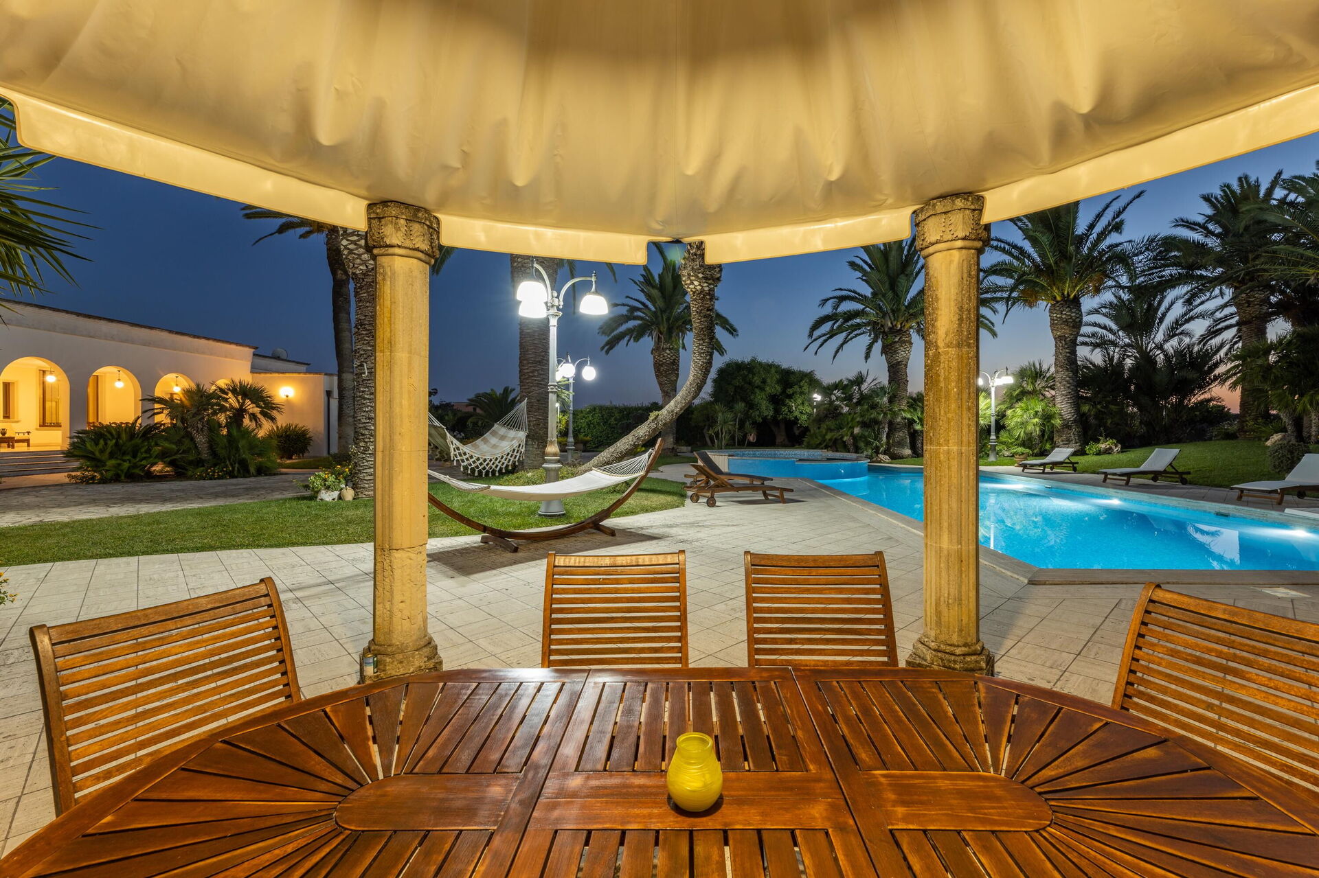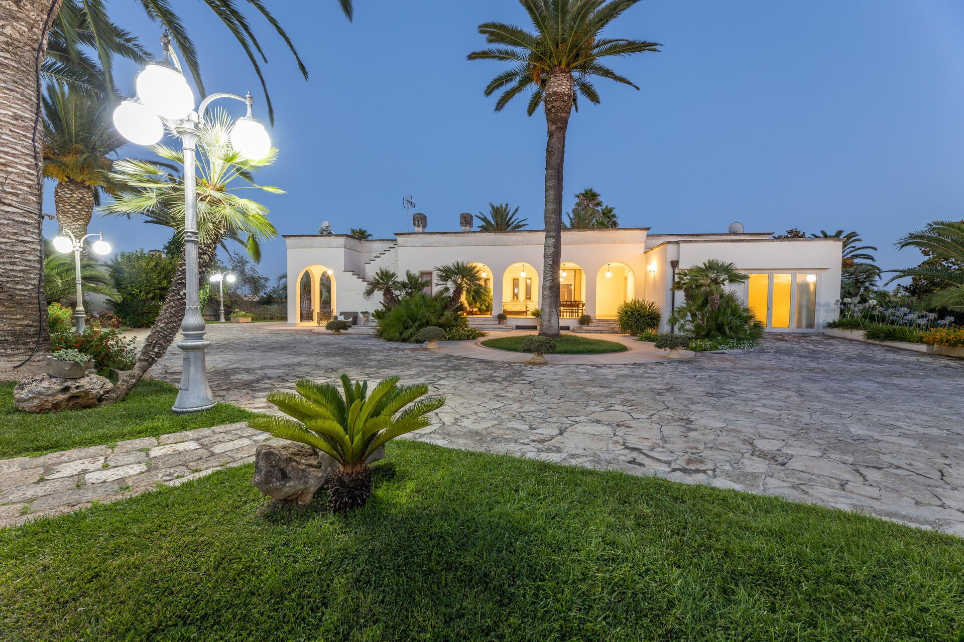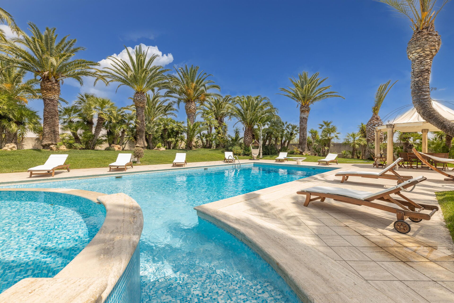 Villa Oasi di Pace is nestled in a 5000 square meter garden which is splendidly cared for, with a lawn, beautiful palm trees, and a fabulous private pool. This vacation villa rental with a private pool in Apulia is completely independent, and you can enjoy a vacation in total privacy just kilometers from the region’s beautiful beaches.