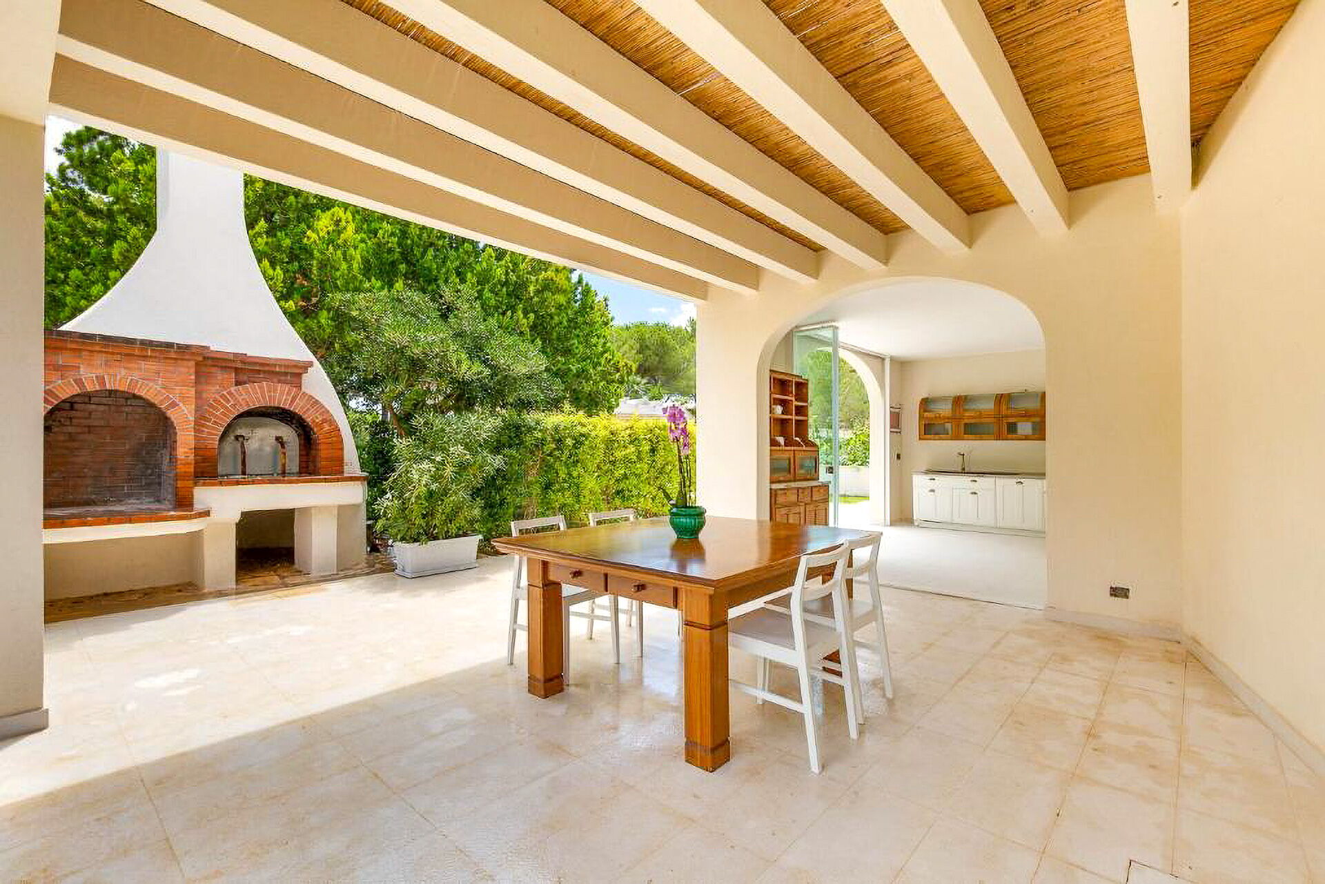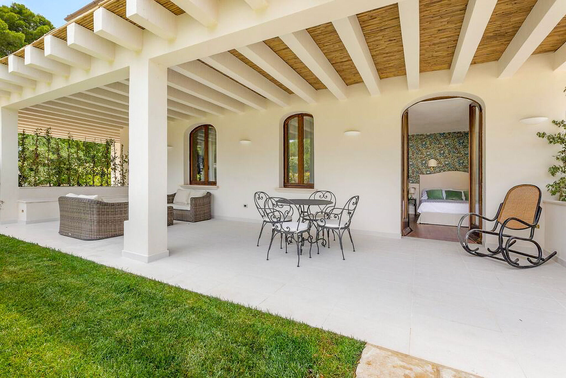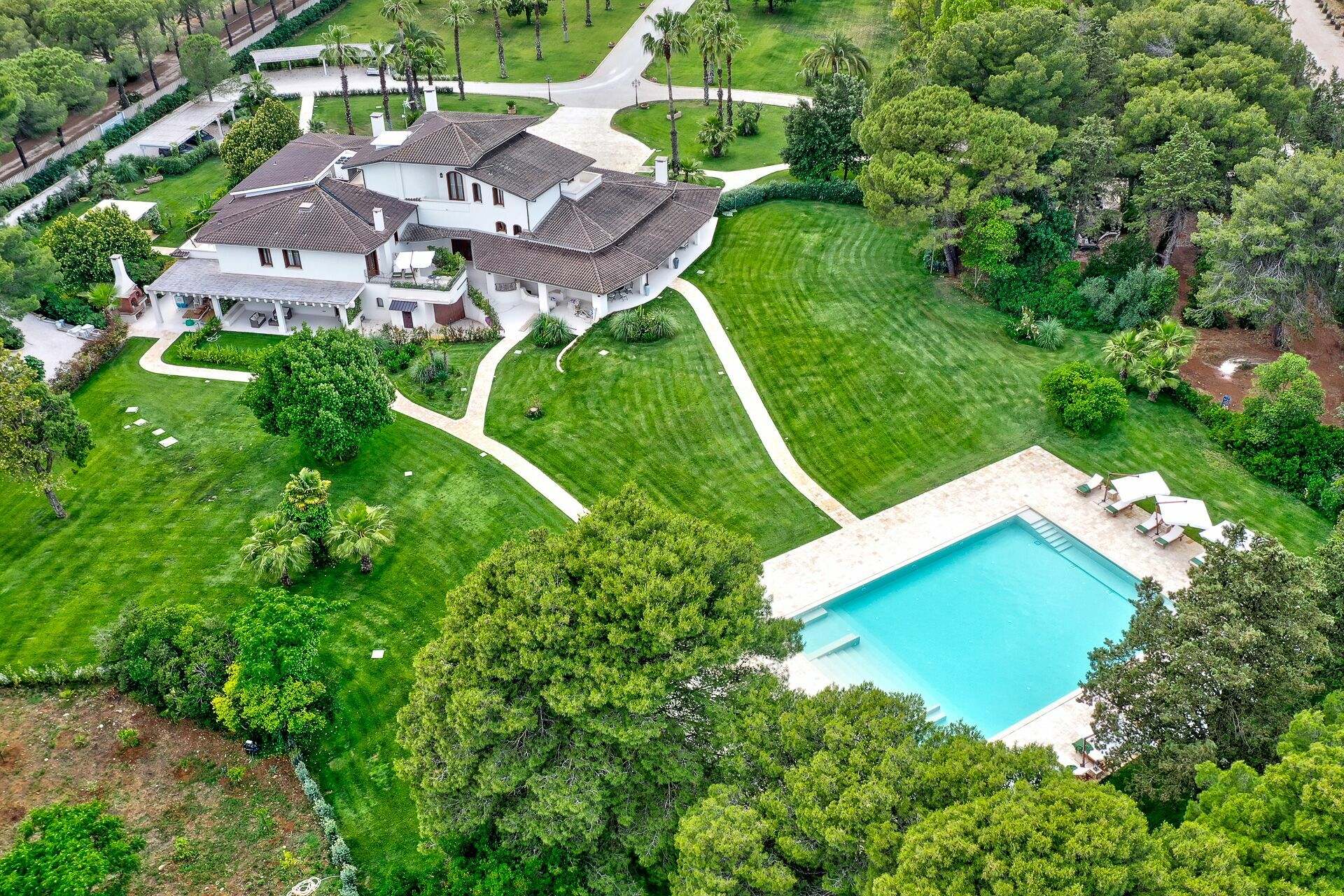 The interiors are tastefully furnished, and the rooms are spacious and bright. The entire property is surrounded by a large, fenced-in garden that is about 8000 m2, with a lovely green lawn and Mediterranean shrub vegetation and trees. A path leads to the spectacular private pool. There are various relaxation and dining areas scattered about the garden, under elegant pergolas, and on the verandas by the house.