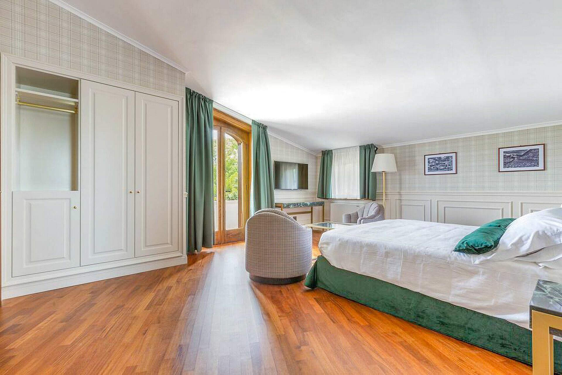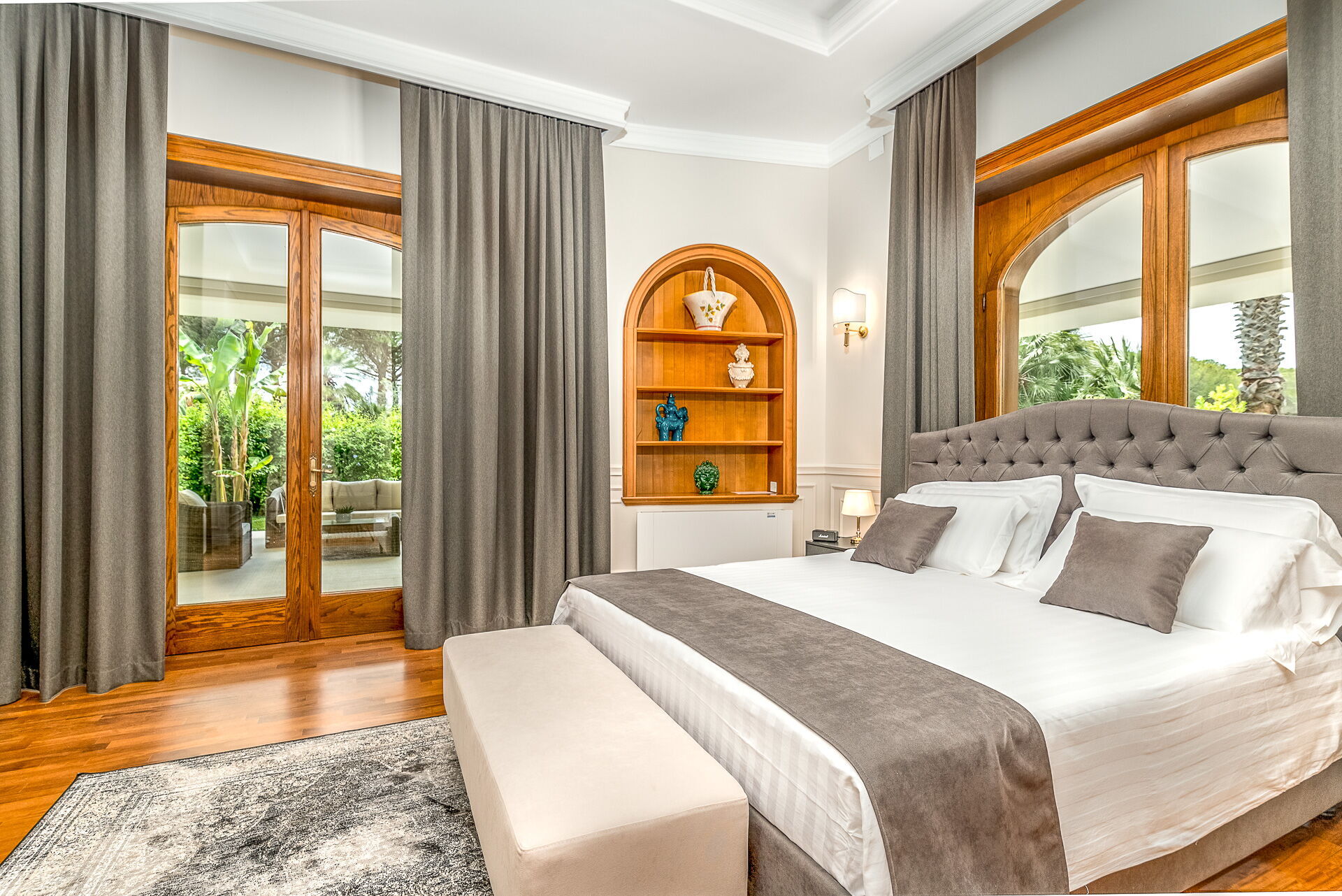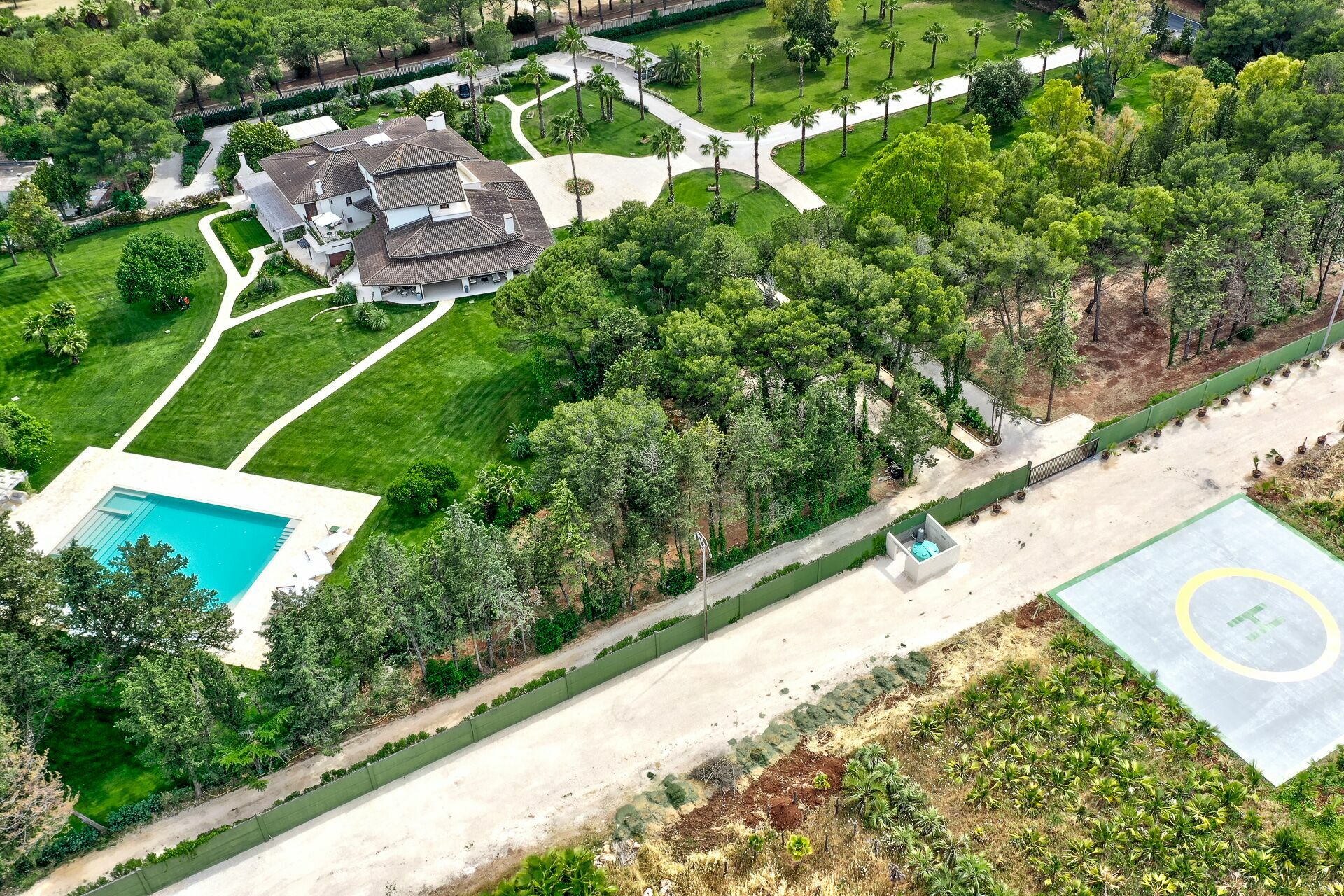 The interiors are tastefully furnished, and the rooms are spacious and bright. The entire property is surrounded by a large, fenced-in garden that is about 8000 m2, with a lovely green lawn and Mediterranean shrub vegetation and trees. A path leads to the spectacular private pool. There are various relaxation and dining areas scattered about the garden, under elegant pergolas, and on the verandas by the house.