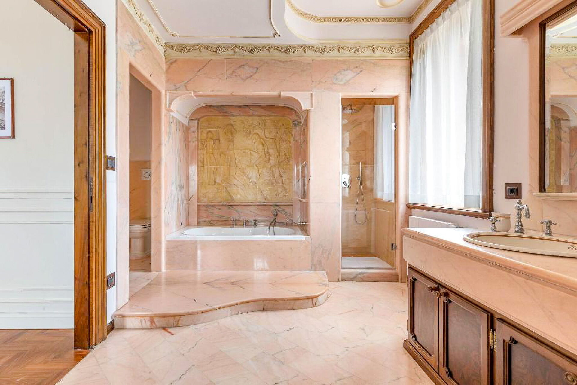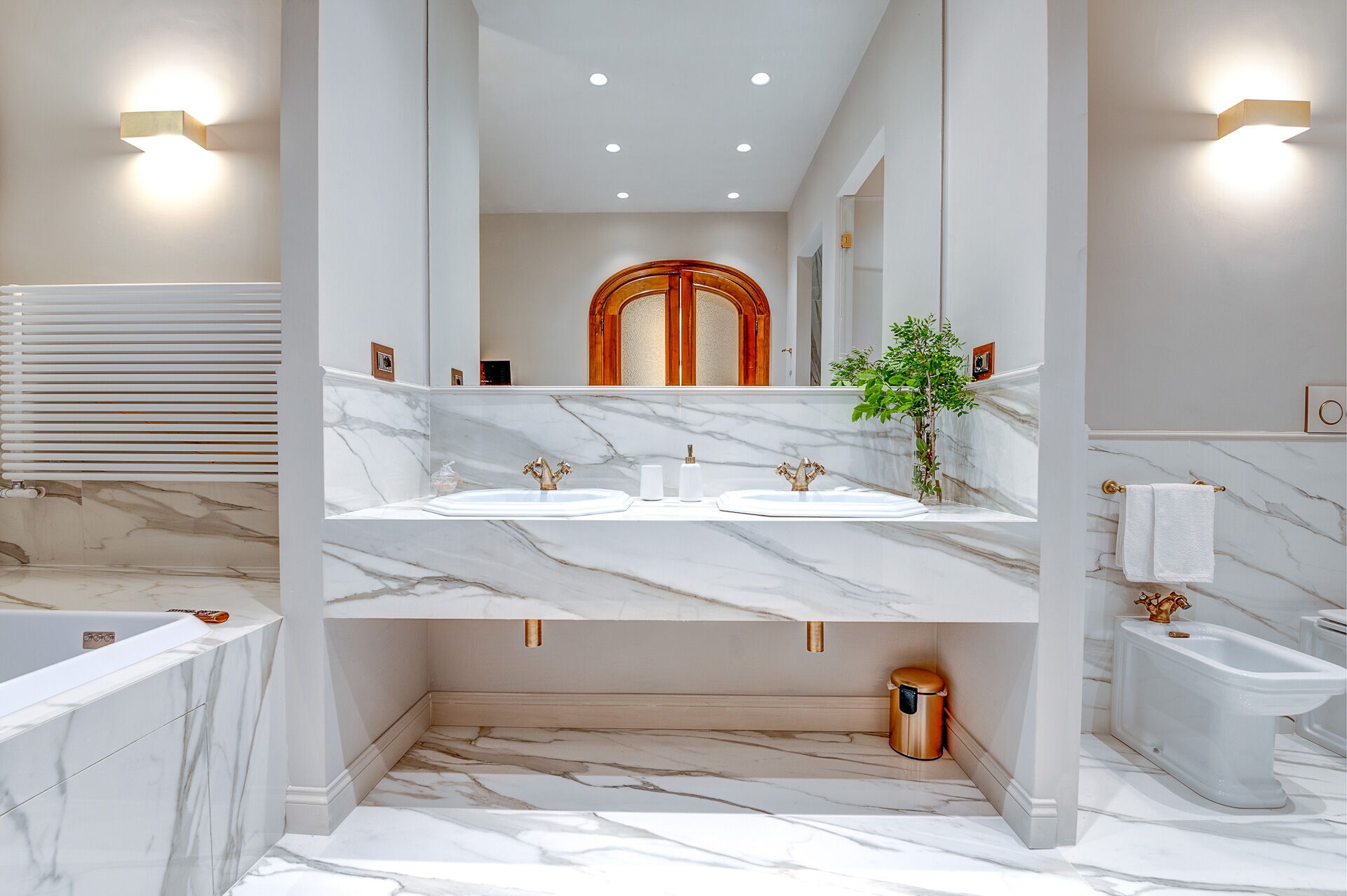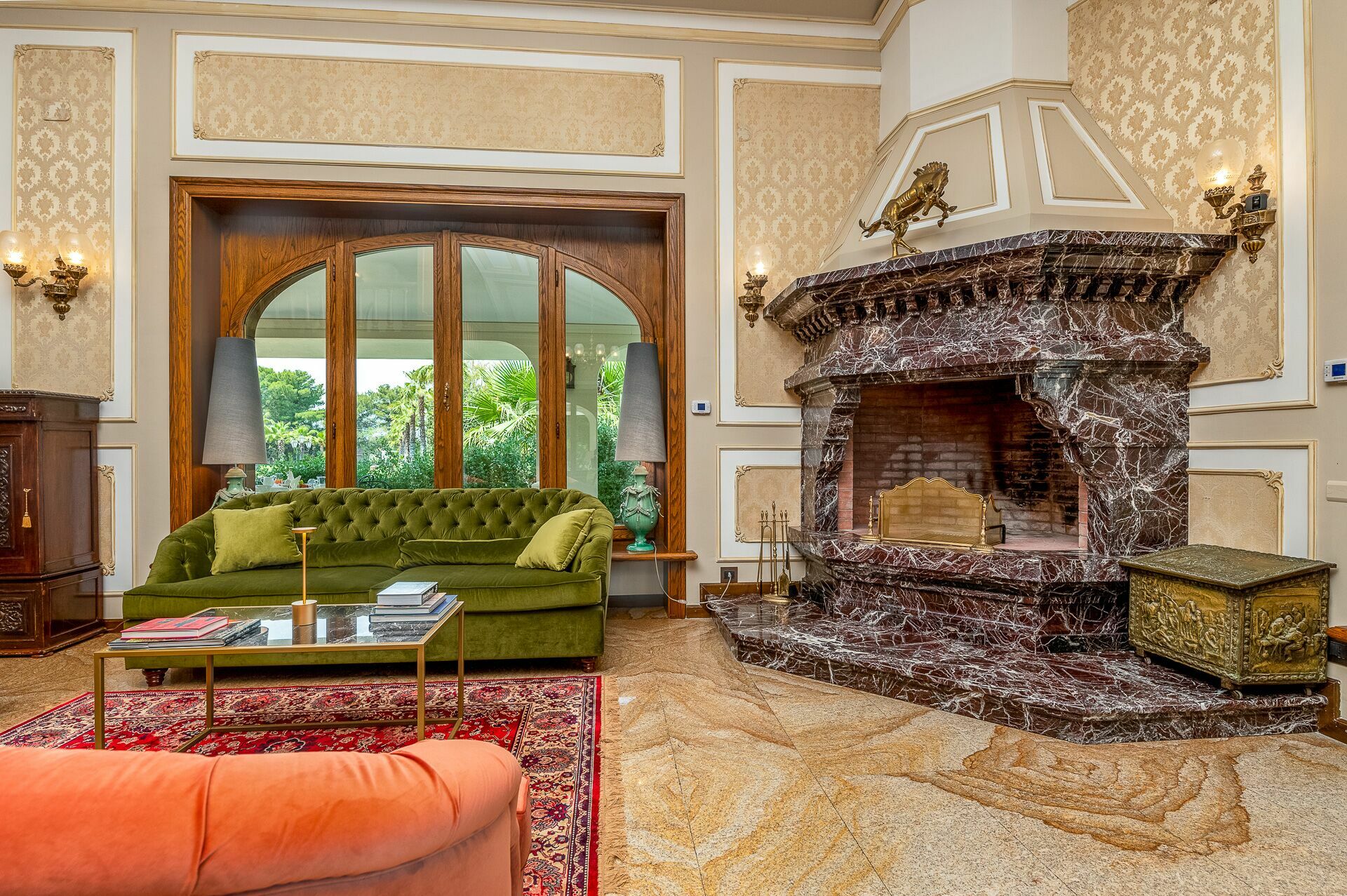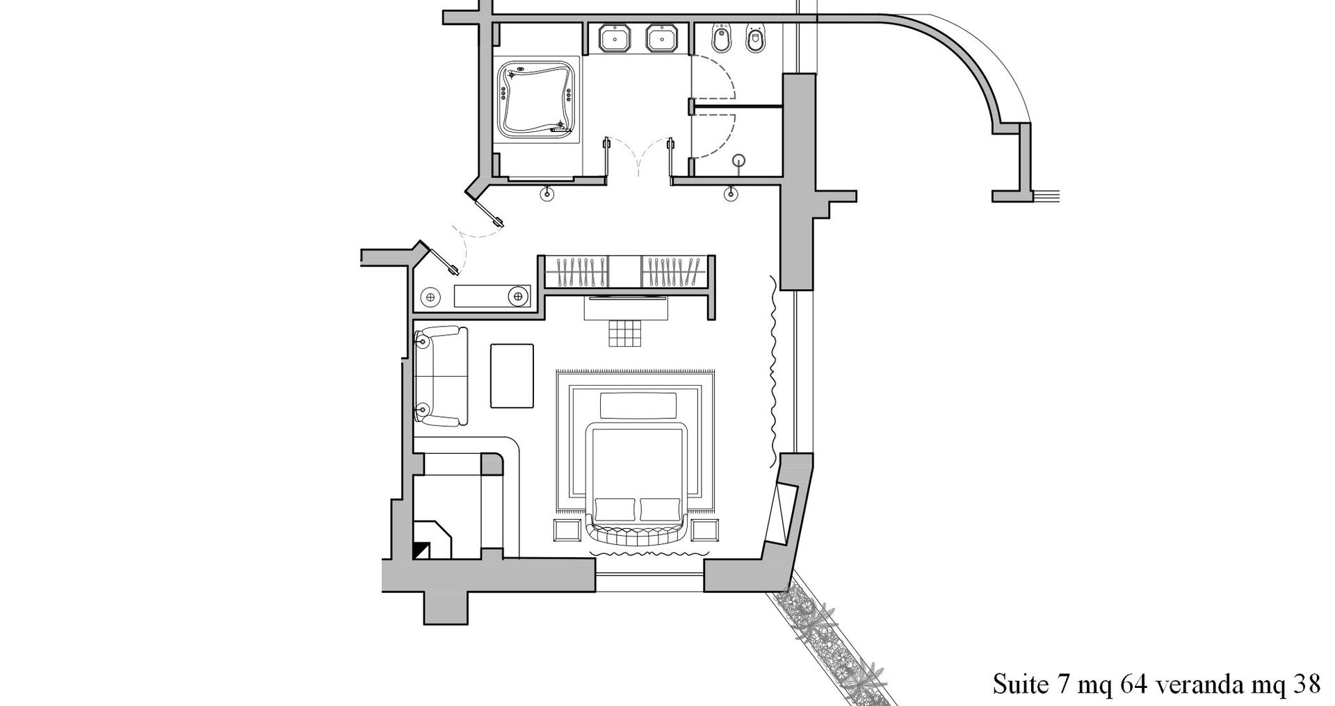 Ground floor: entrance; large living room with fireplace; main kitchen; second kitchen with direct outdoor access; 1 double bedroom with king size bed, private bathroom with shower, access to private veranda and access to private garden; 1 double bedroom with king size bed, private bathroom with shower and whirlpool bathtub, access to private veranda and access to private garden.