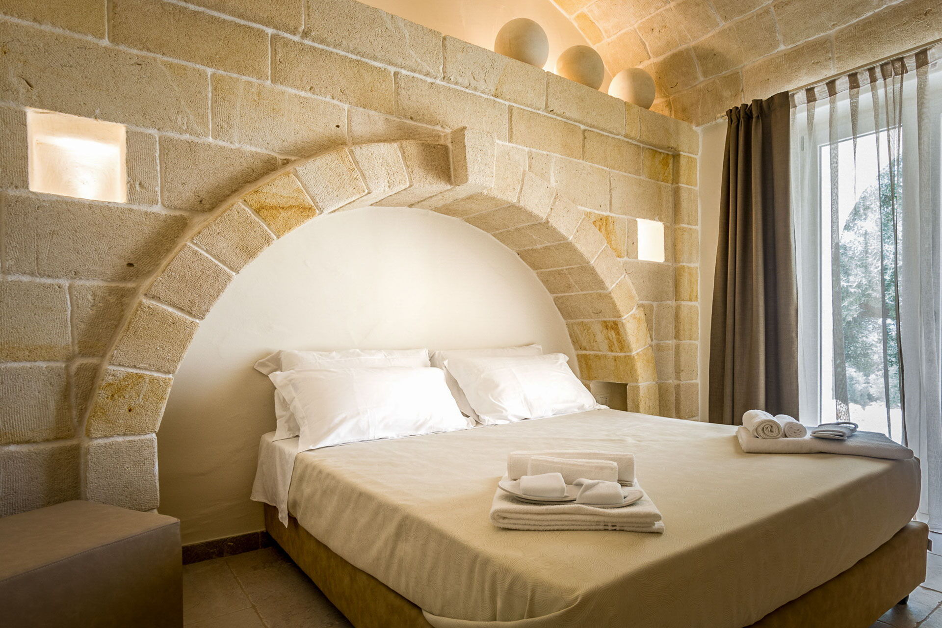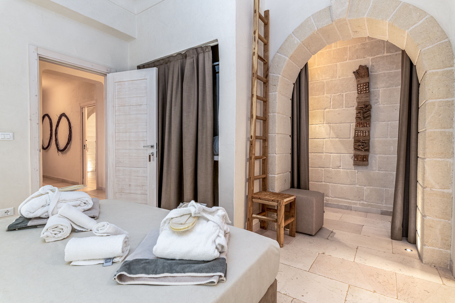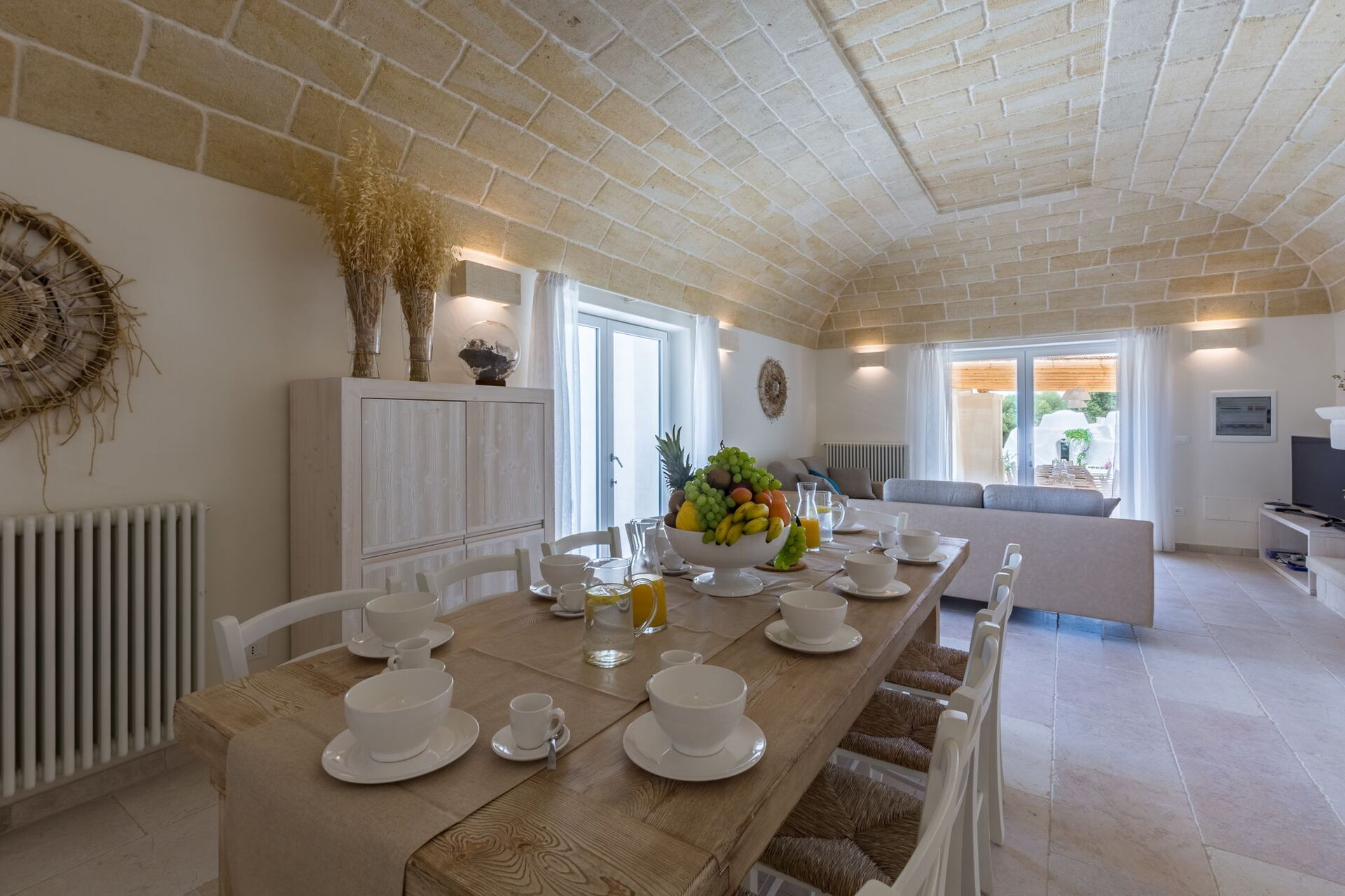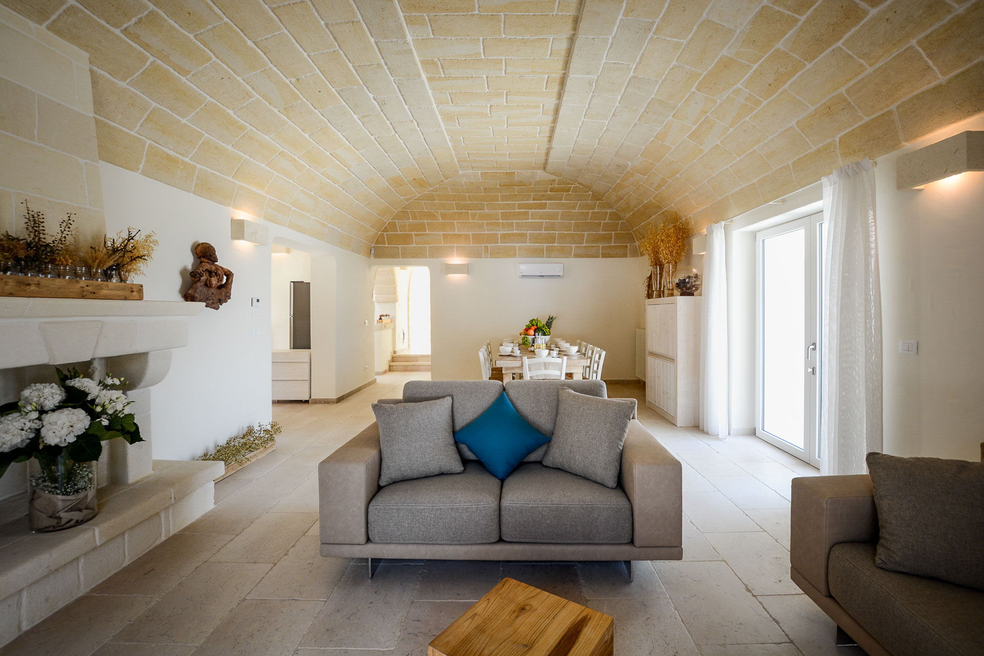 With 7 bedrooms in the majestic main villa, and bedrooms in the adjacent stone trulli, La Residenza- Corte dei Messapi can accommodate up to 16 people. The traditional Apulian-style interiors are an unforgettable mix of stone, arches, muted colors and handcrafted furniture.