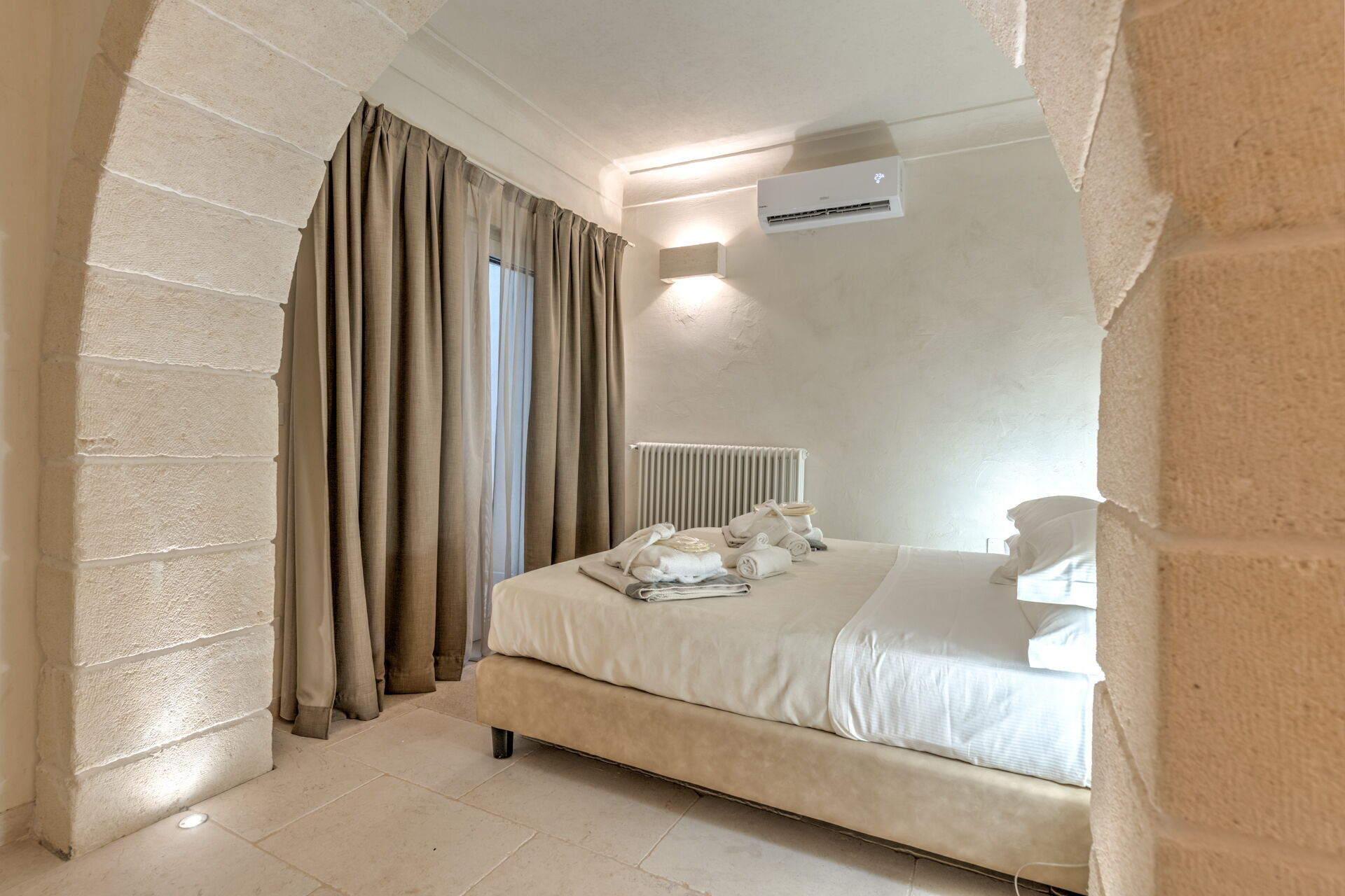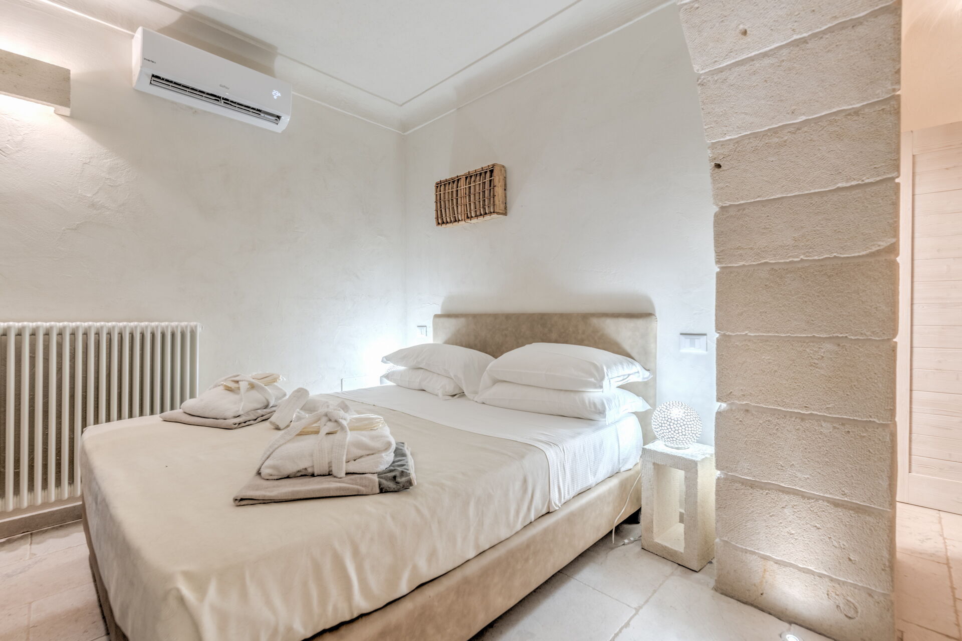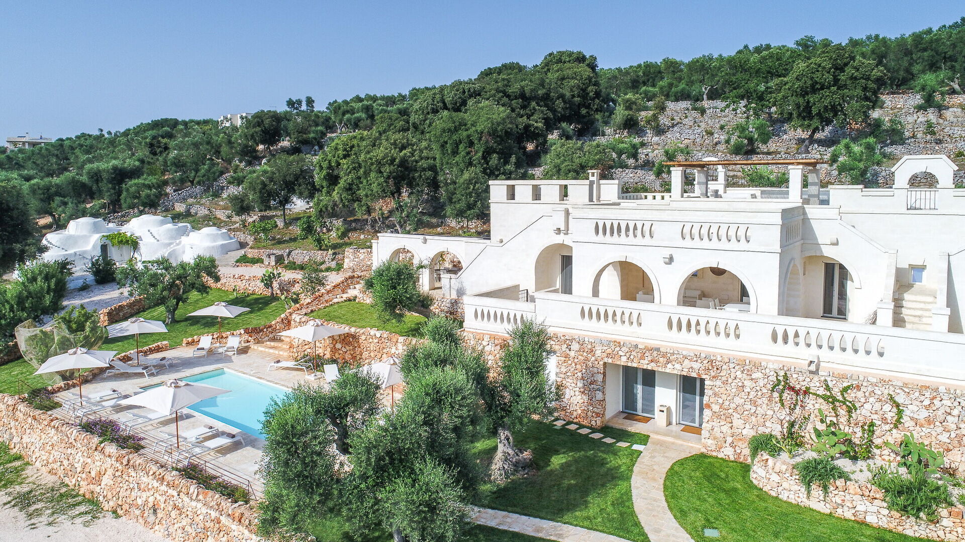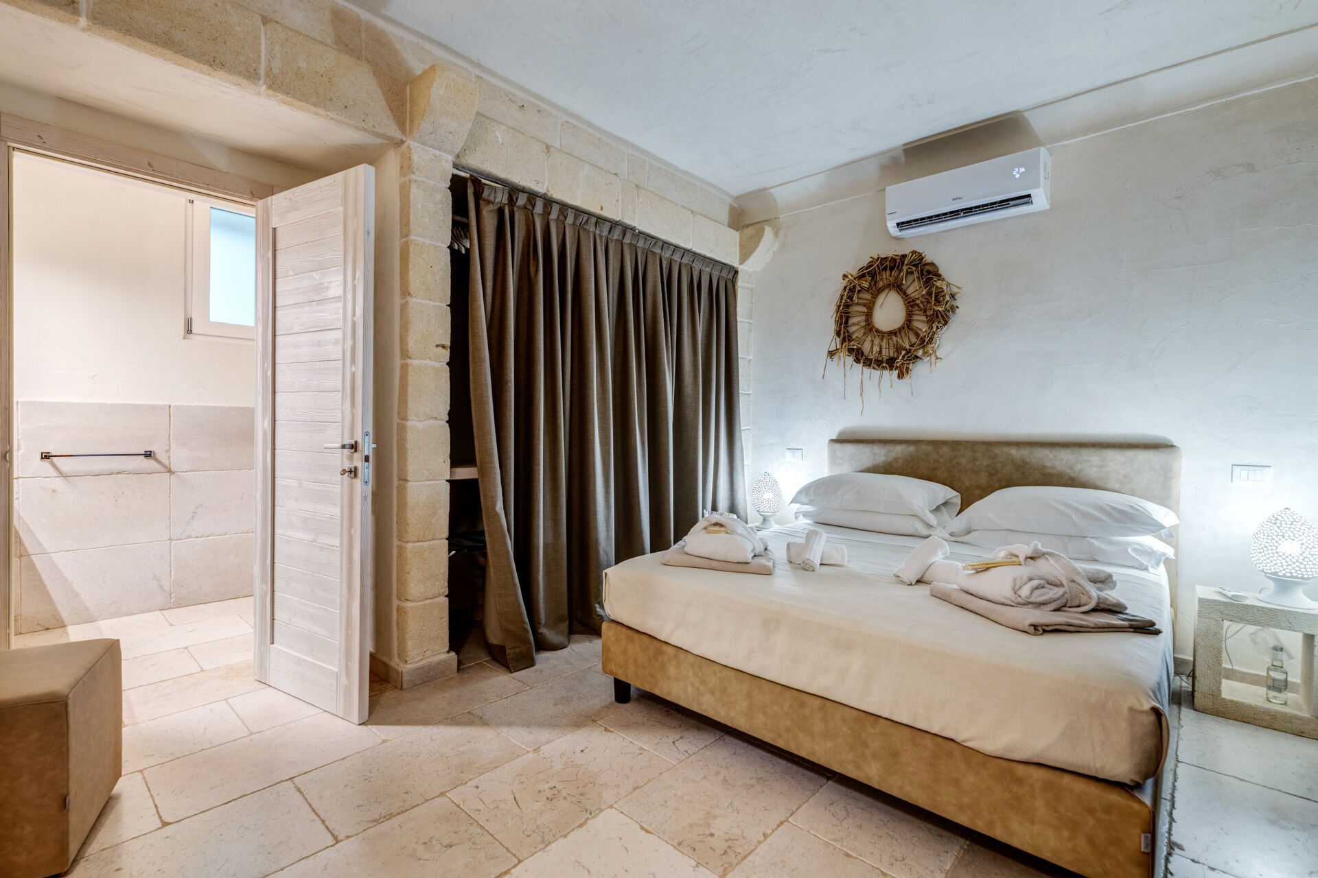 With 7 bedrooms in the majestic main villa, and bedrooms in the adjacent stone trulli, La Residenza- Corte dei Messapi can accommodate up to 16 people. The traditional Apulian-style interiors are an unforgettable mix of stone, arches, muted colors and handcrafted furniture.