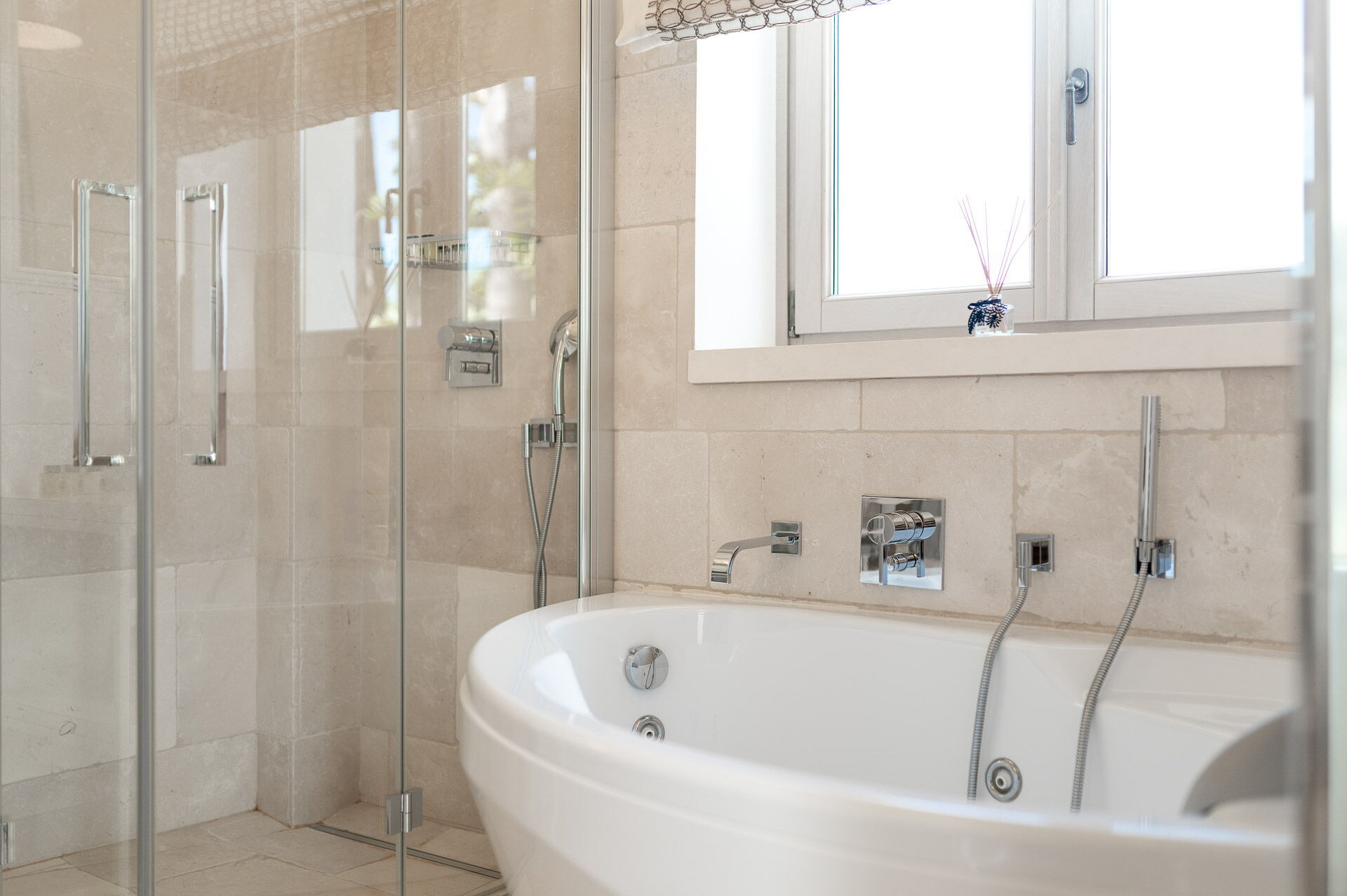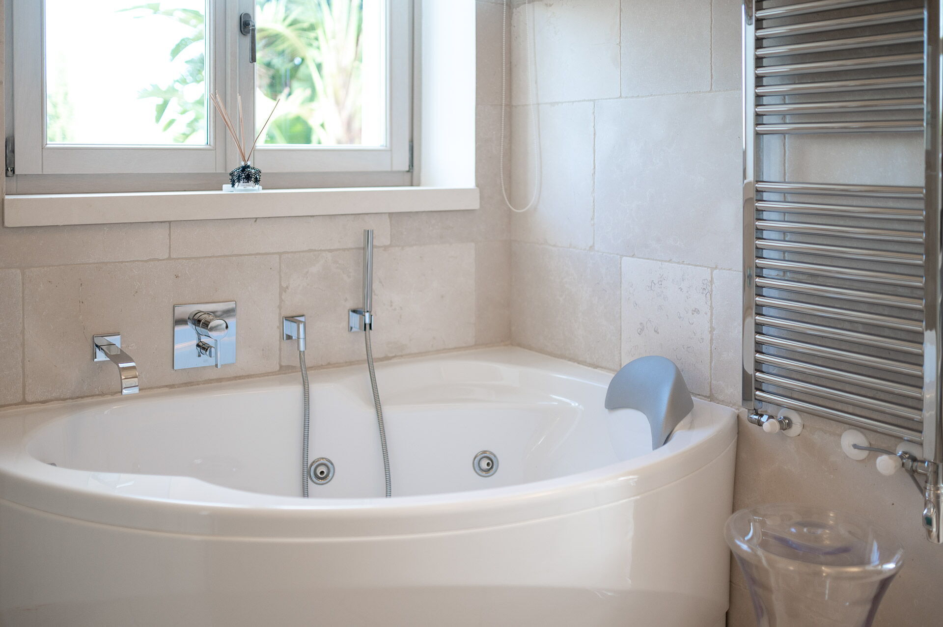 The modern interiors are well appointed, with hues and style that were carefully chosen to enhance the old internal structure’s features. The stunning property is nestled in a well-tended lawn of about 1 hectare, bordered by a traditional lime wall. In the large garden there is an elegant pool (heated upon request) with sun loungers and umbrellas. A charming stone path connects it to the villa rental.