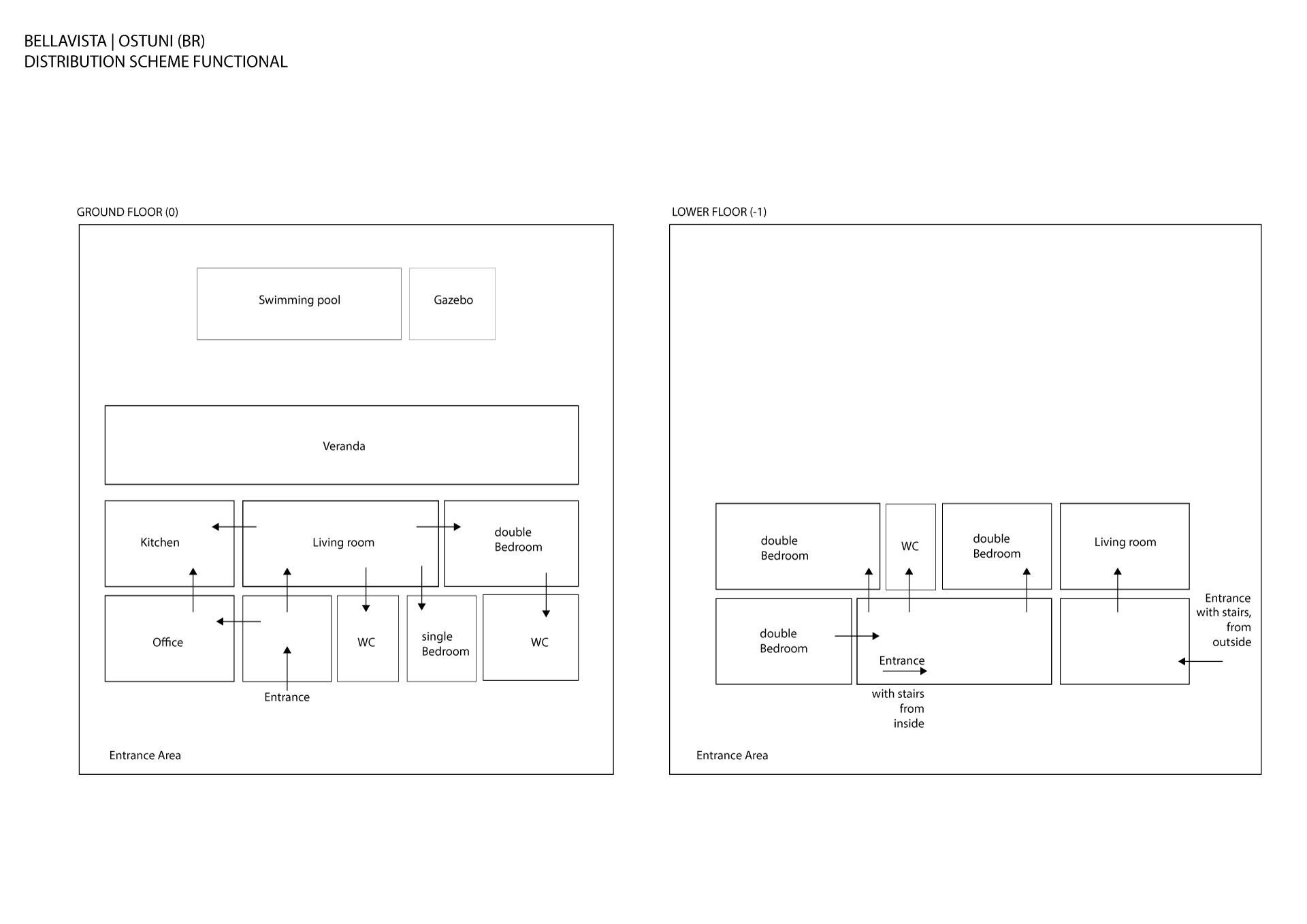 Lower floor: entrance both from the outside and inside, large living room, 3 double bedrooms, bathroom with shower.