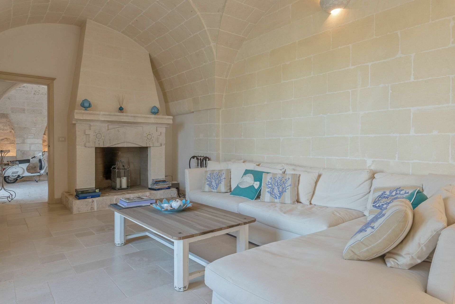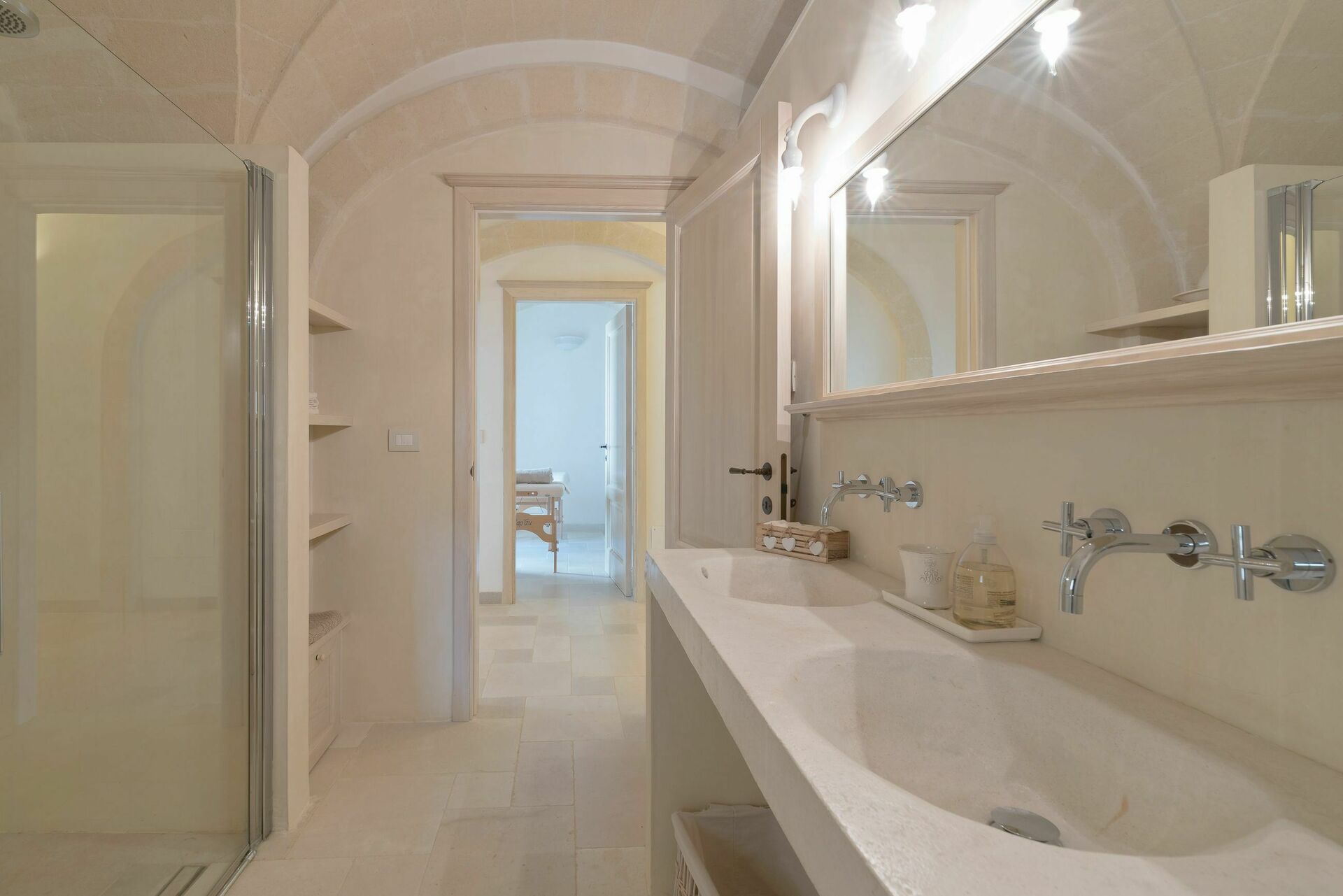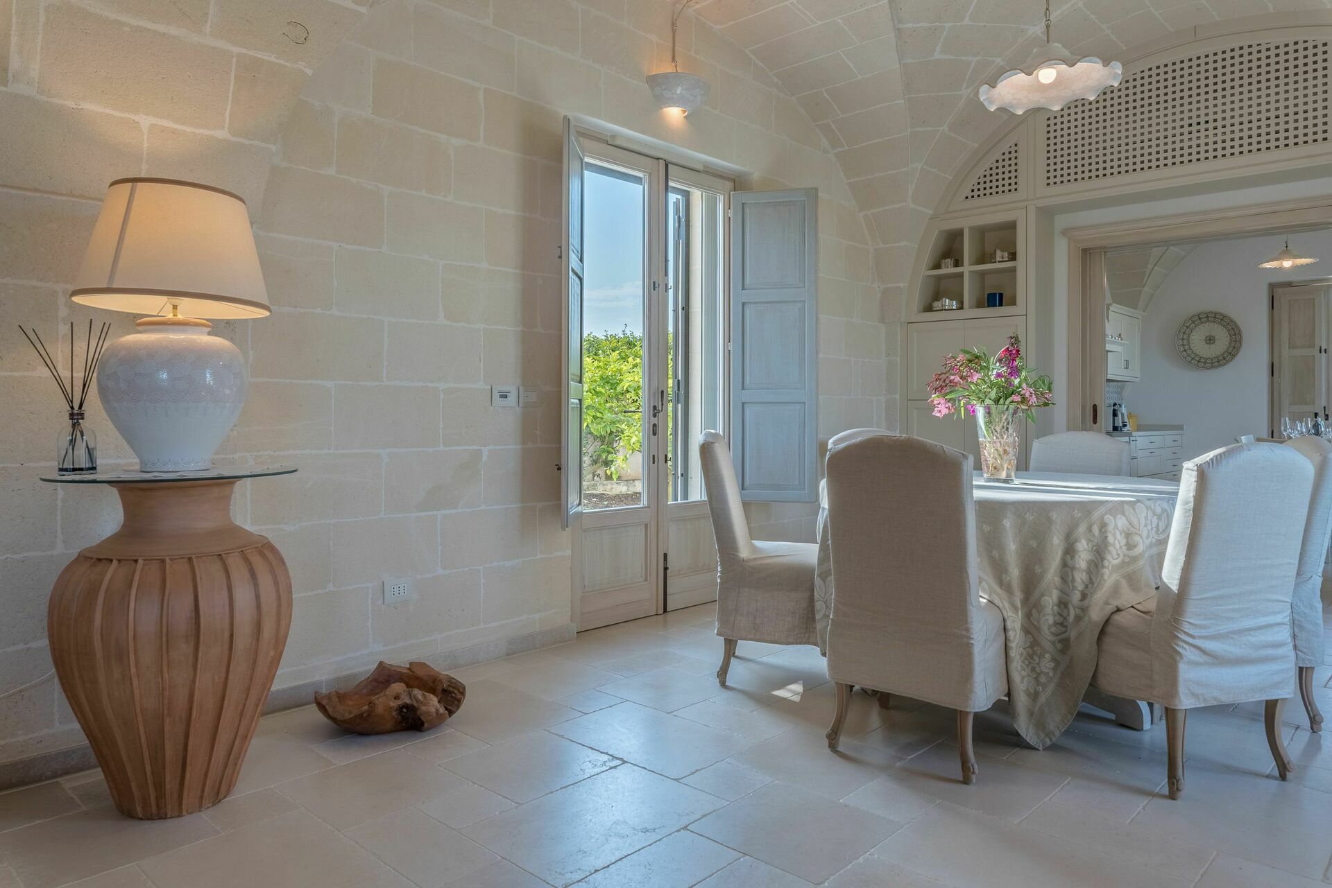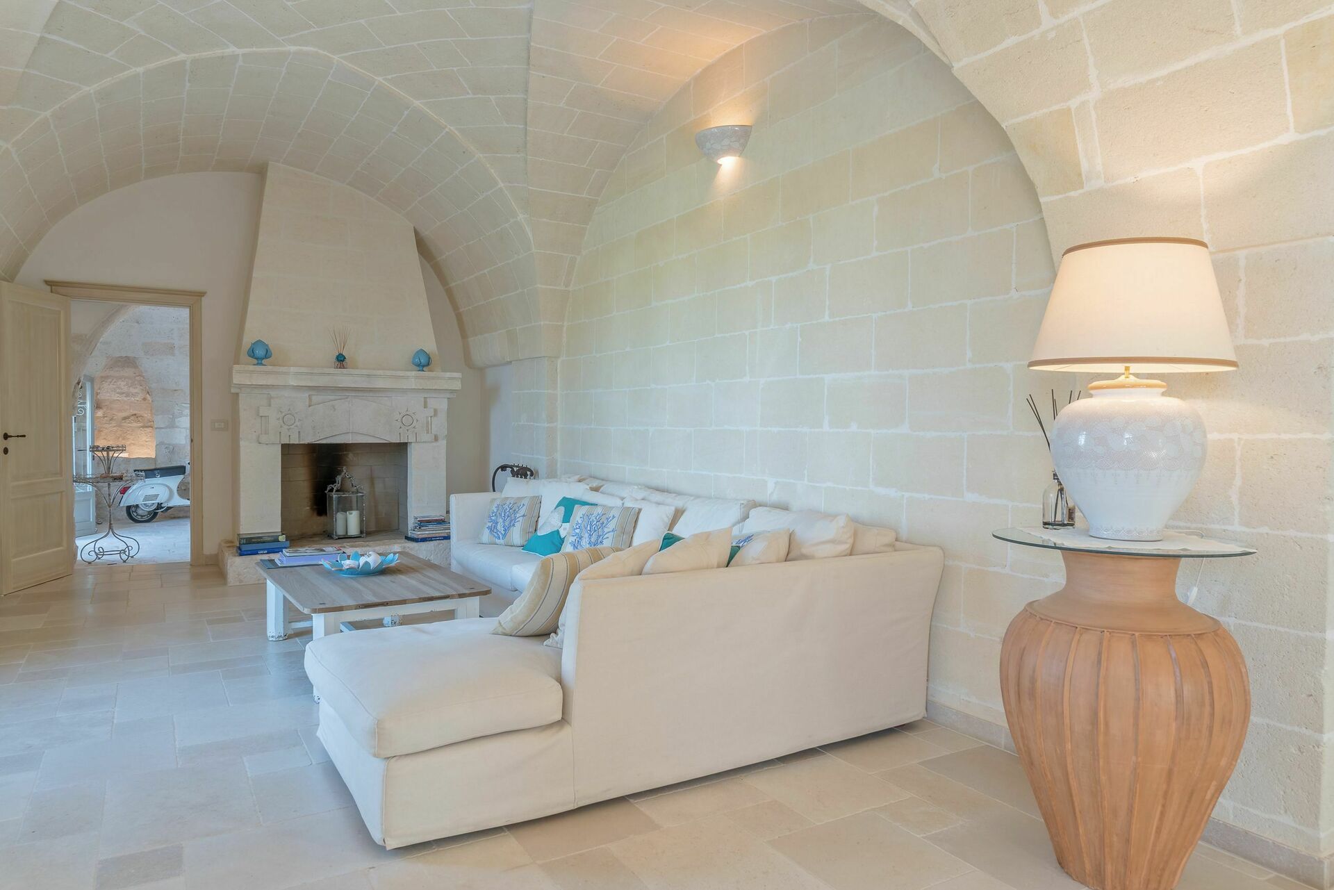 The villa interiors are carefully and elegantly furnished. White and pale color furnishings grace both the inside and outside. There are features of traditional Salento architecture throughout, such as barrel vaulted ceilings, and large brick arches that crown the walls, and separate the various rooms. An indoor staircase leads to the first floor double bedrooms, and to the two splendid, enormous terraces with views of the pool and all of the surrounding countryside.
