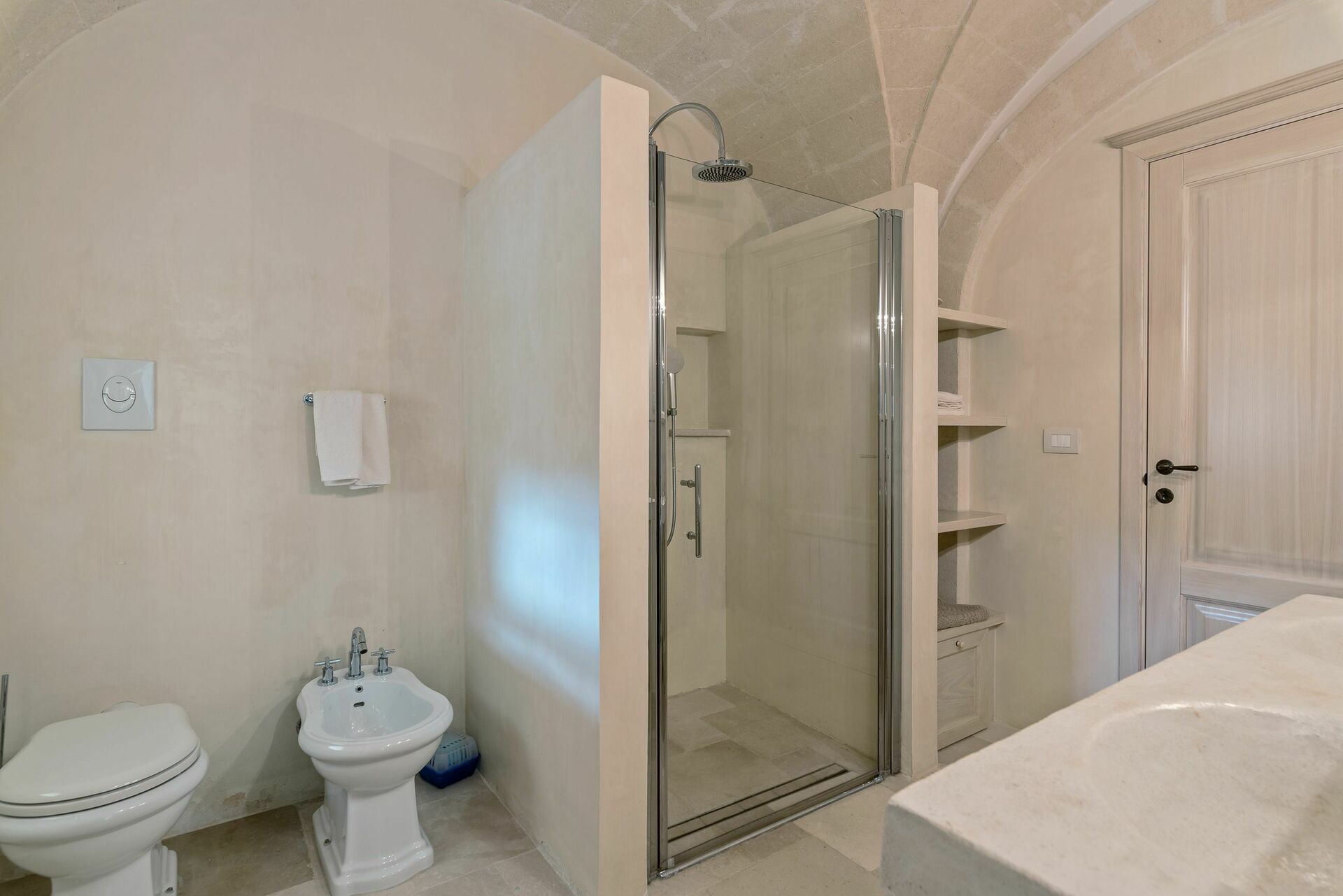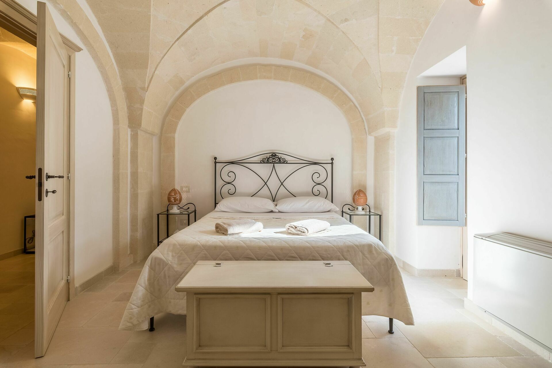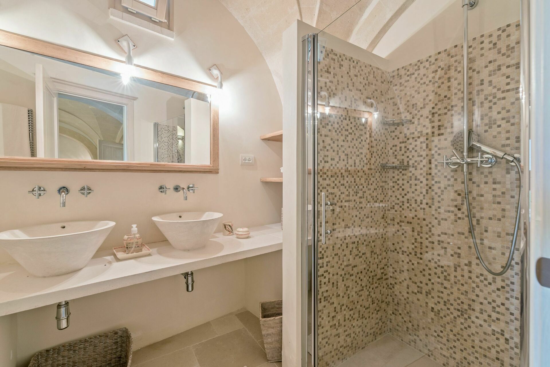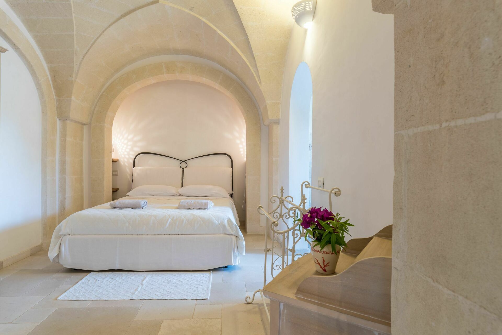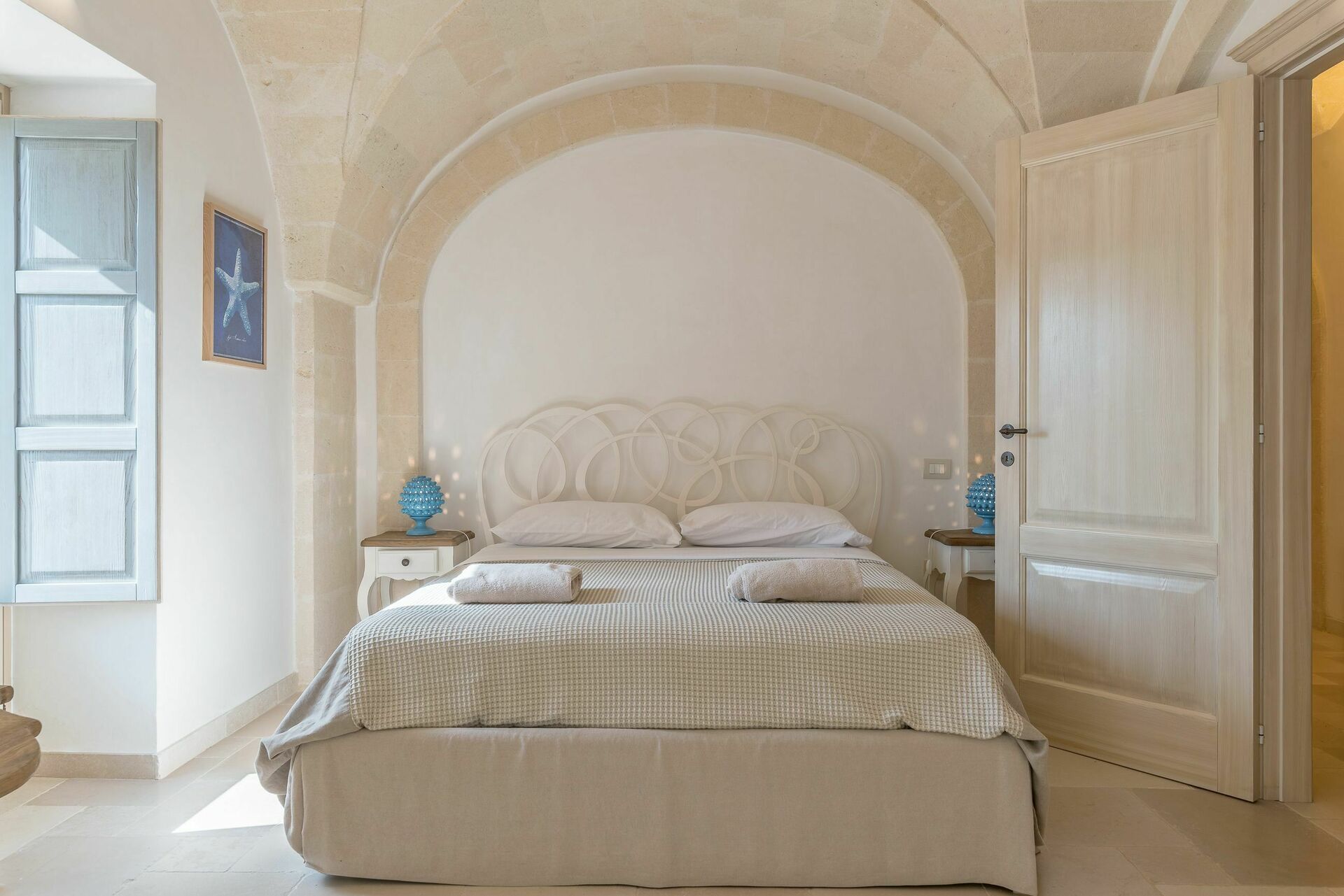 The villa interiors are carefully and elegantly furnished. White and pale color furnishings grace both the inside and outside. There are features of traditional Salento architecture throughout, such as barrel vaulted ceilings, and large brick arches that crown the walls, and separate the various rooms. An indoor staircase leads to the first floor double bedrooms, and to the two splendid, enormous terraces with views of the pool and all of the surrounding countryside.