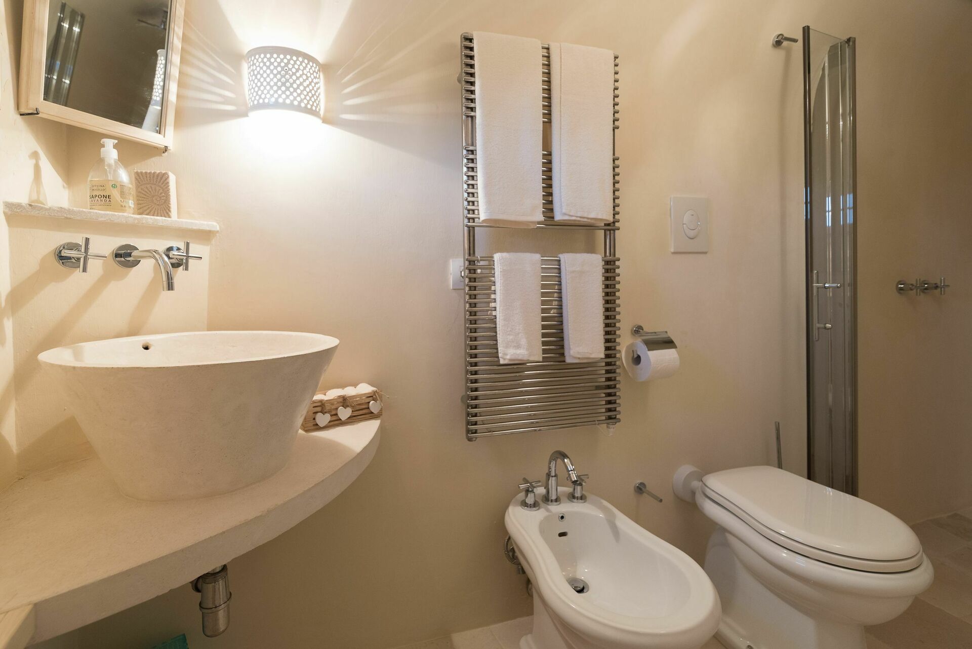 Masseria Villa il Frantoio also has marvelous exteriors. The large garden is lined by a beautiful hedge and offers an elegant private pool with a curved shallow section. The pool can be heated upon request for an extra charge. There are sun loungers and umbrellas by the pool for relaxing and taking in the scents and sun of Apulia. A well-tended green lawn surrounds the villa and pool, and has paths that connect the house to the various outdoor areas, as well as native Salento plants.