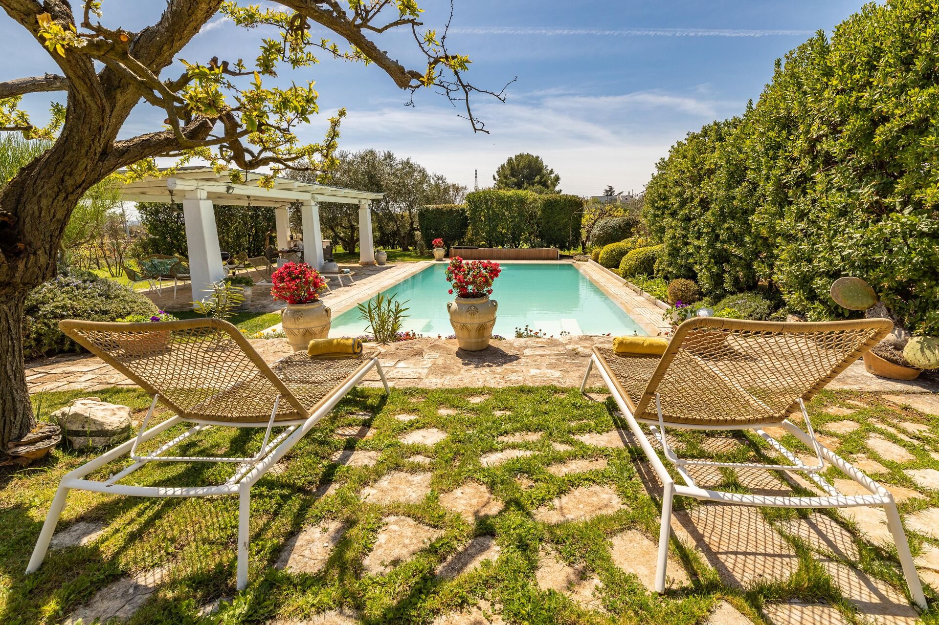 The tasteful, simple interiors respect the trullo’s original characteristics. The splendid villa rental is nestled in a large garden of about 1000 m2, with trees and Mediterranean scrub vegetation. It offers an elegant private pool, connected to the villa by a refined stone path. By the pool you can relax and read a book in the shade of the marvelous pergola, while in front of the house entrance there is a lovely gazebo with seats for enjoying the Salento’s scents and colors.