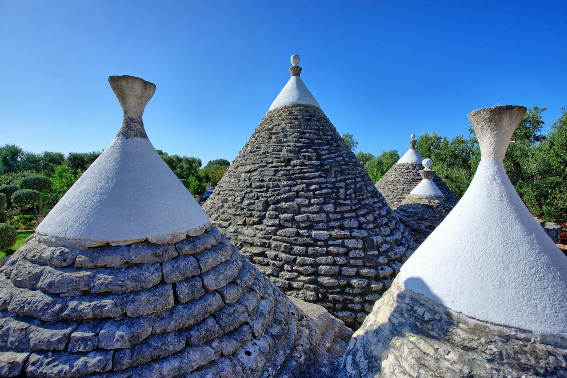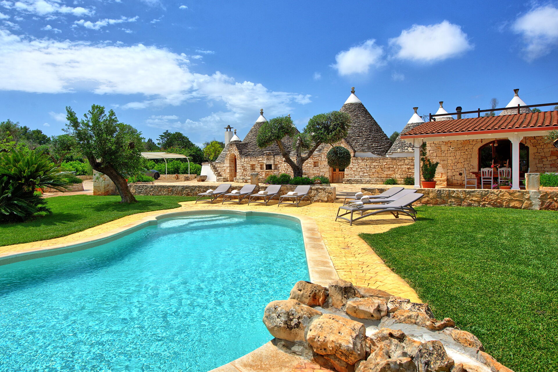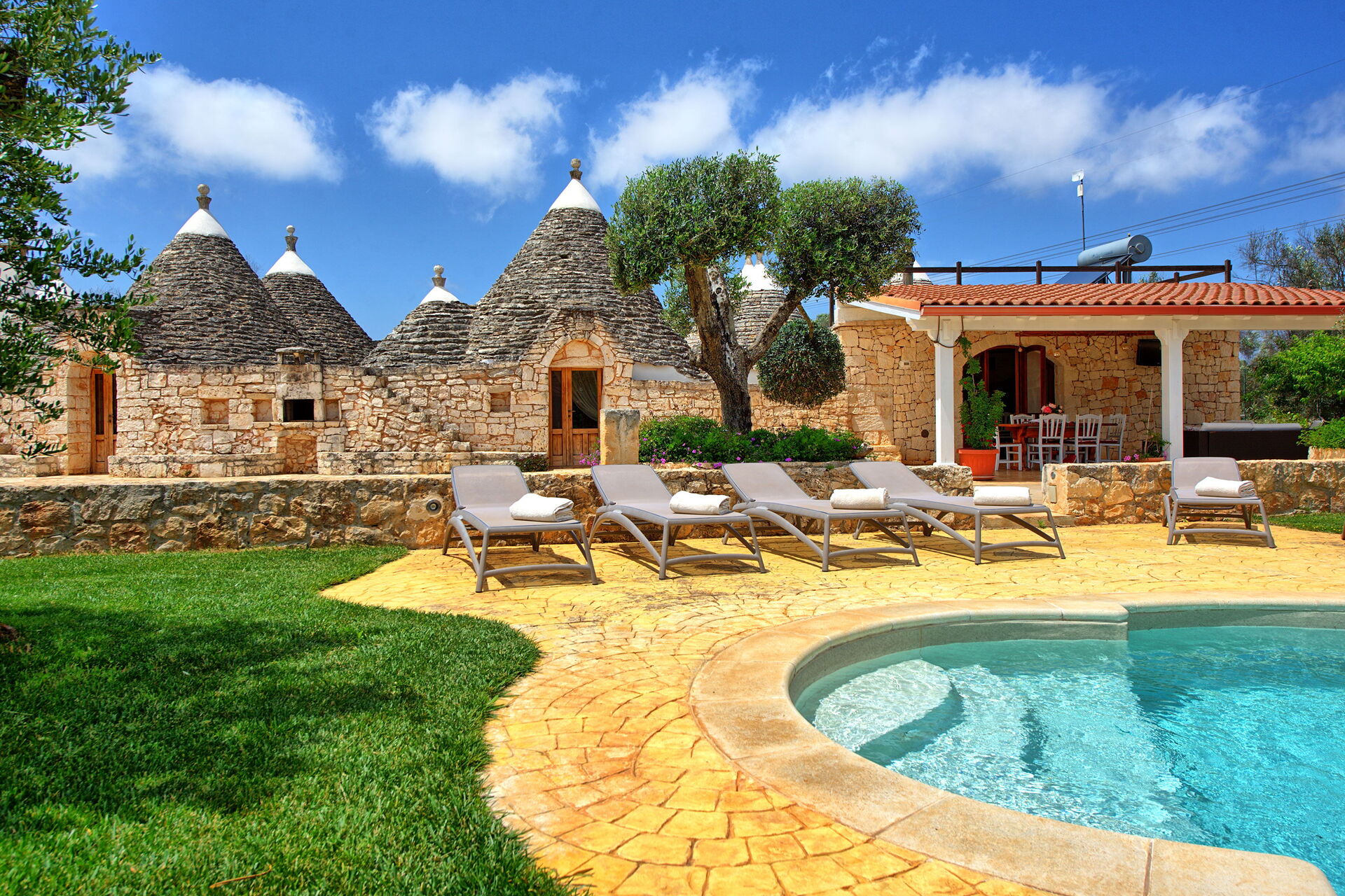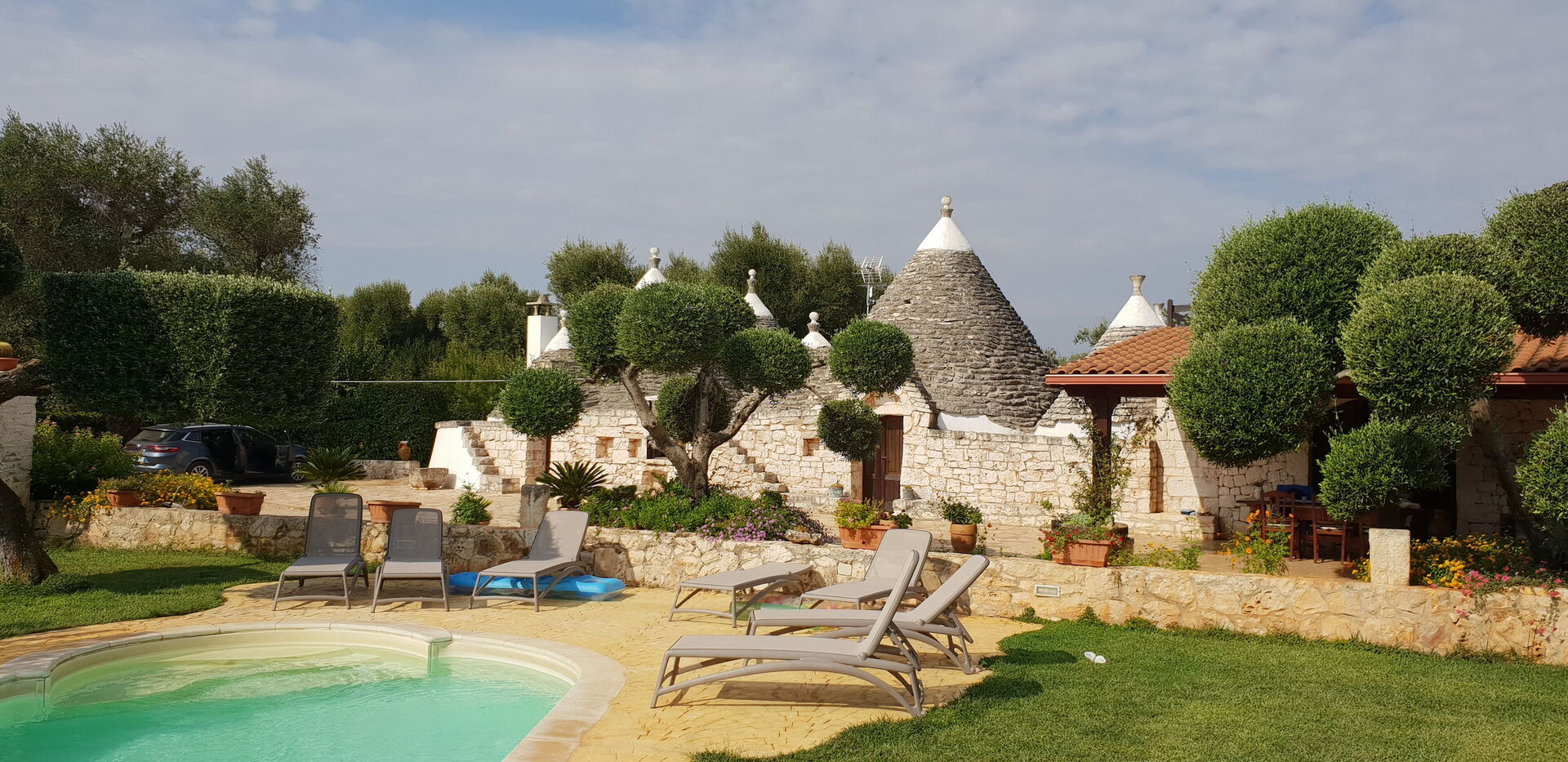 Trullo available to rent in Puglia with private swimming pool and beautiful garden; this splendid property is made up of 11 cones which are all internally connected forming a charming house measuring 145m2 and with 4 bedrooms.