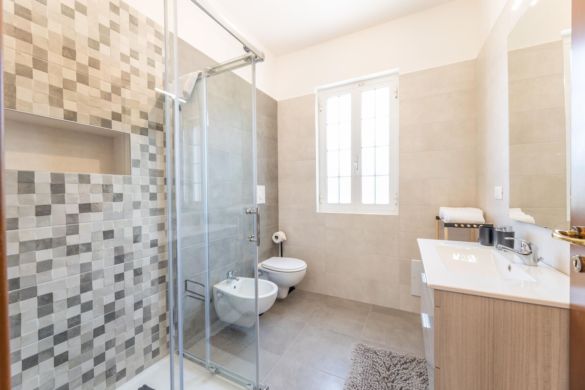 Ground floor: kitchen (cooktop, oven, freezer, refrigerator, dishwasher, coffee maker), living room (air conditioning, tv) with double sofa bed (extra, on request) and dining area, bathroom with shower, 2 double bedrooms (air conditioning, screen), bathroom with shower.