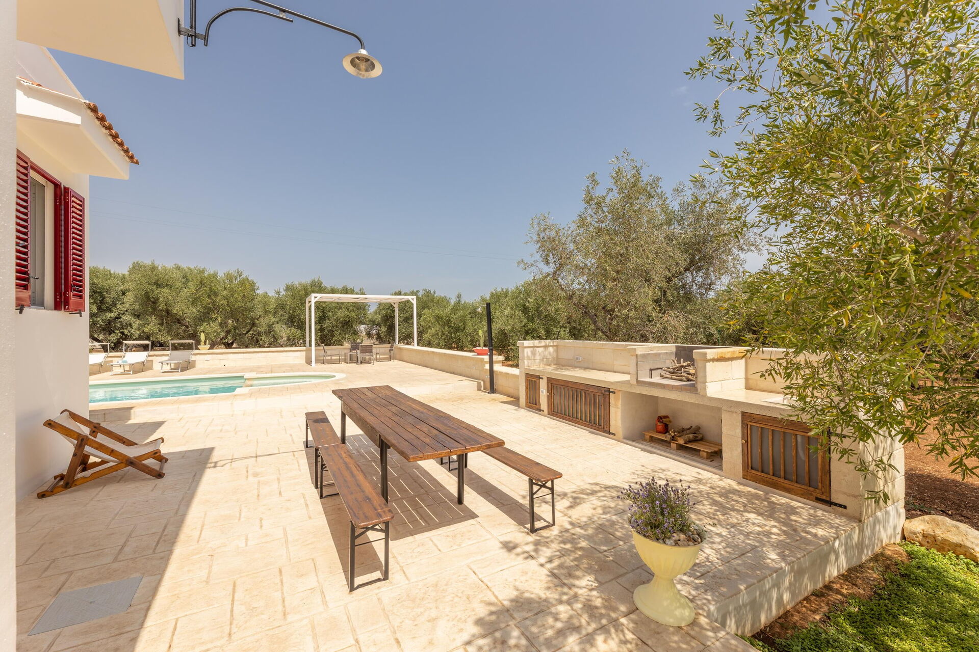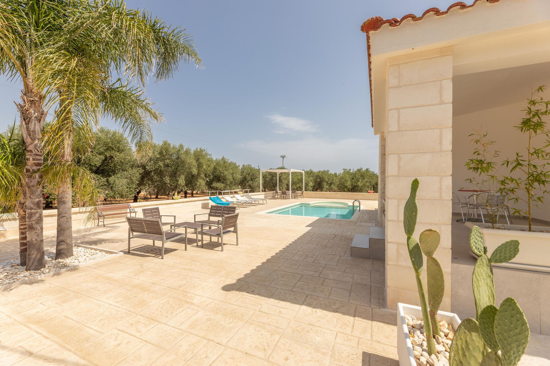 The scenic outdoor spaces have numerous furnished areas for spending time with family or friends. Eat outside while you enjoy fantastic views of the olive trees, or relax by the pool or in the sunbathing area. At guests' disposal there is also a garden with centuries-old olive trees and Mediterranean scrub.