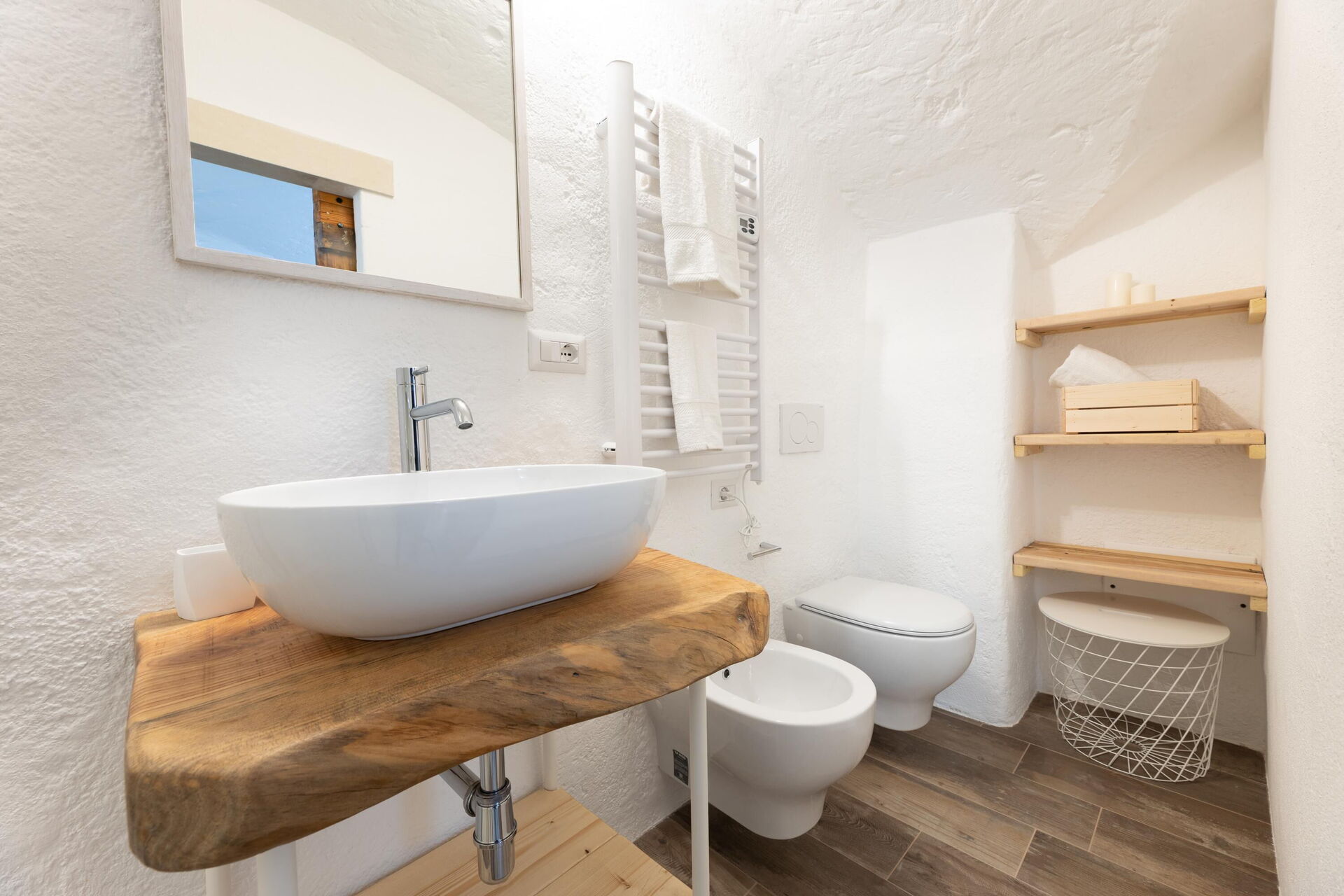 Ground floor: entrance leading into the kitchen (refrigerator, freezer, microwave, induction cooktop, coffee maker) and living room (air conditioning); double bedroom (air conditioned bedroom) with private bathroom with shower; bathroom with shower; sauna relaxation room. From the relaxation room there is access to the roof terrace via an indoor staircase.