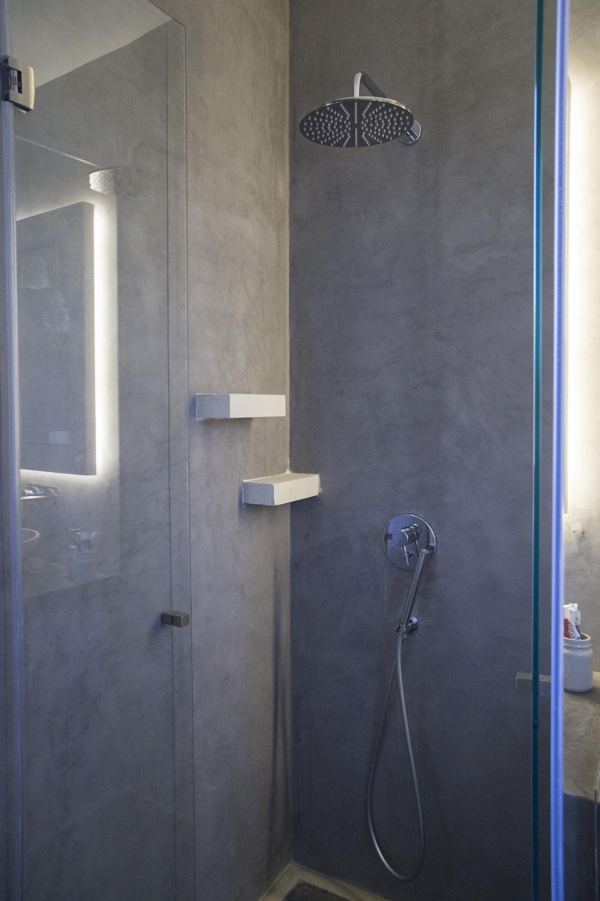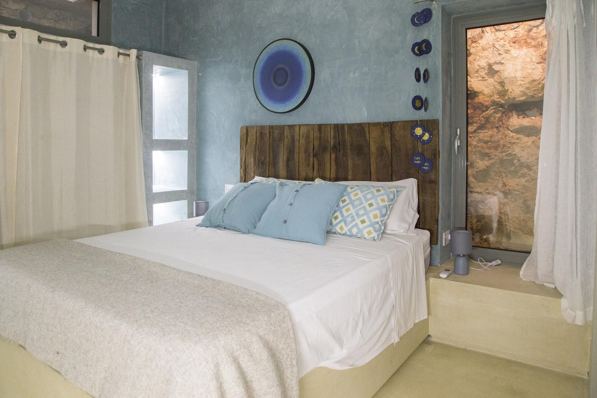 Bedroom with double bed (air conditioning) and bathroom with shower (without window).