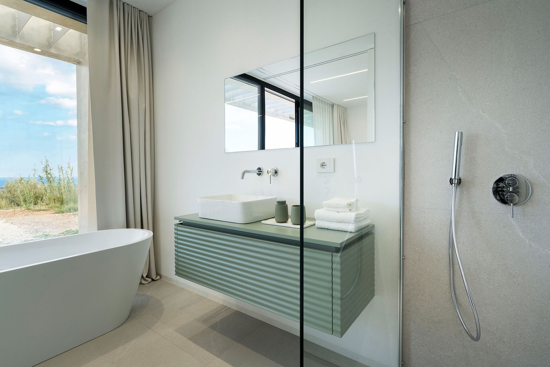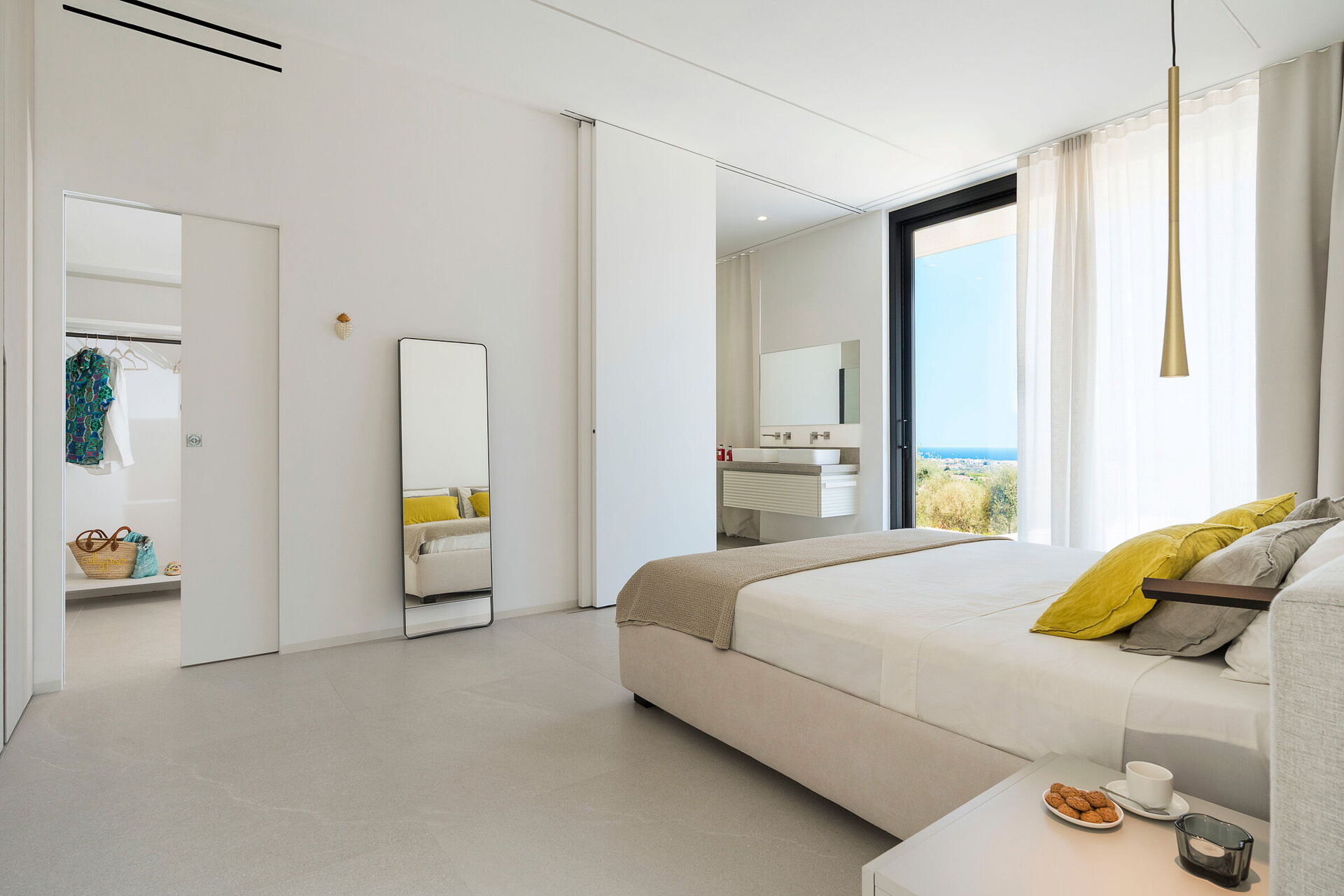 Villa Calypso has two floors of welcoming, tastefully furnished, elegant interiors designed for contemporary living. With 4 bedrooms (each with a private bathrooms), and a large living space that looks out onto the pool area and surrounding landscape, this gorgeous villa rental can comfortably accommodate up to 8 people.