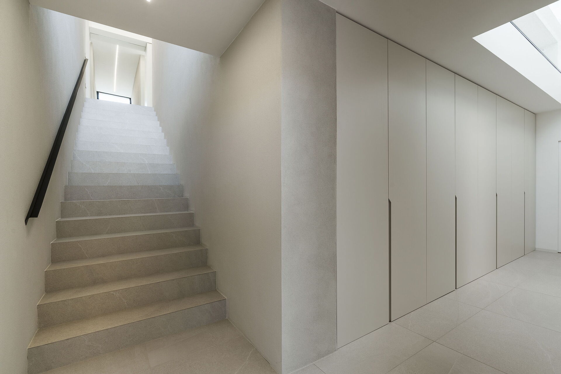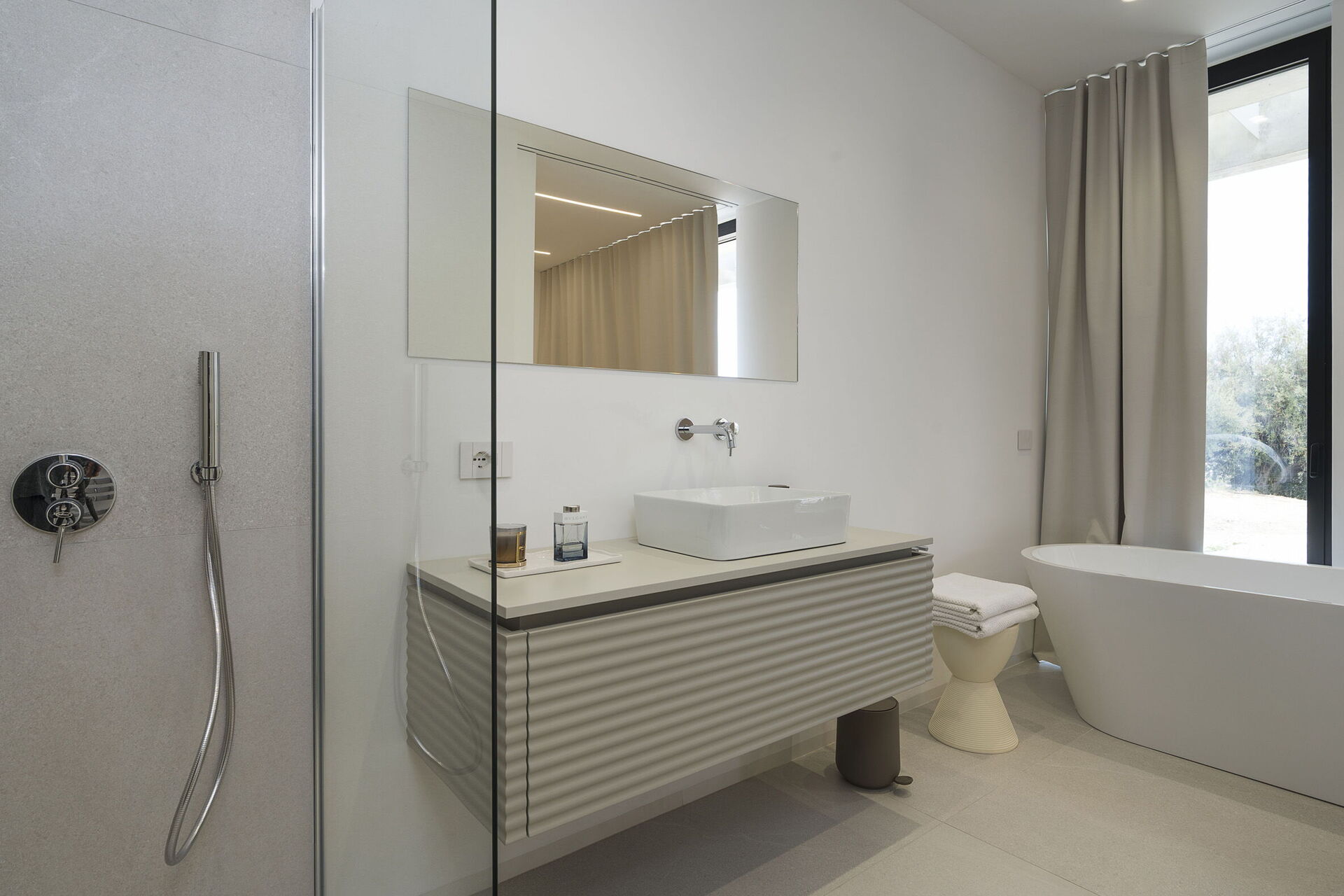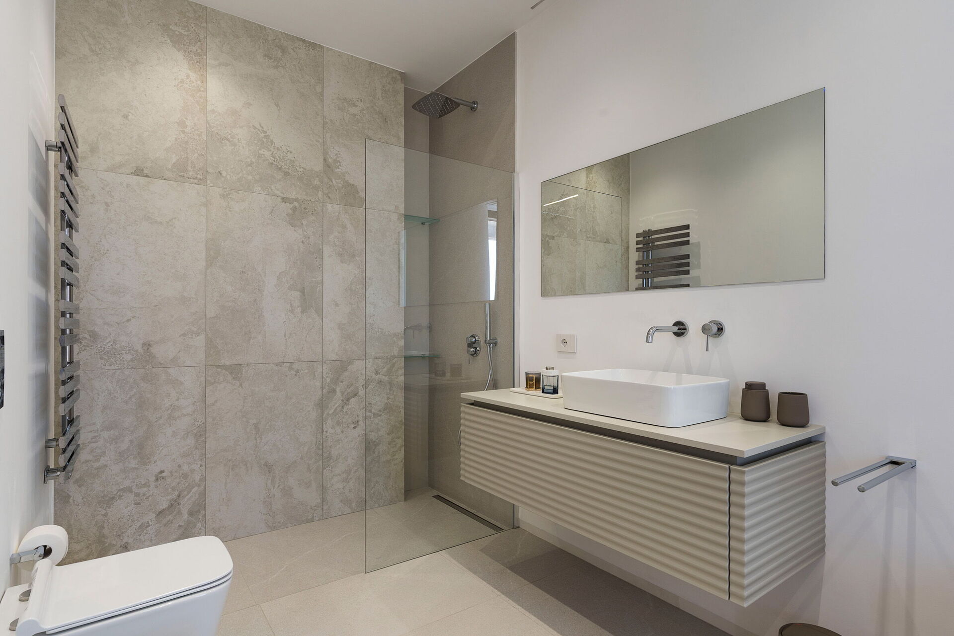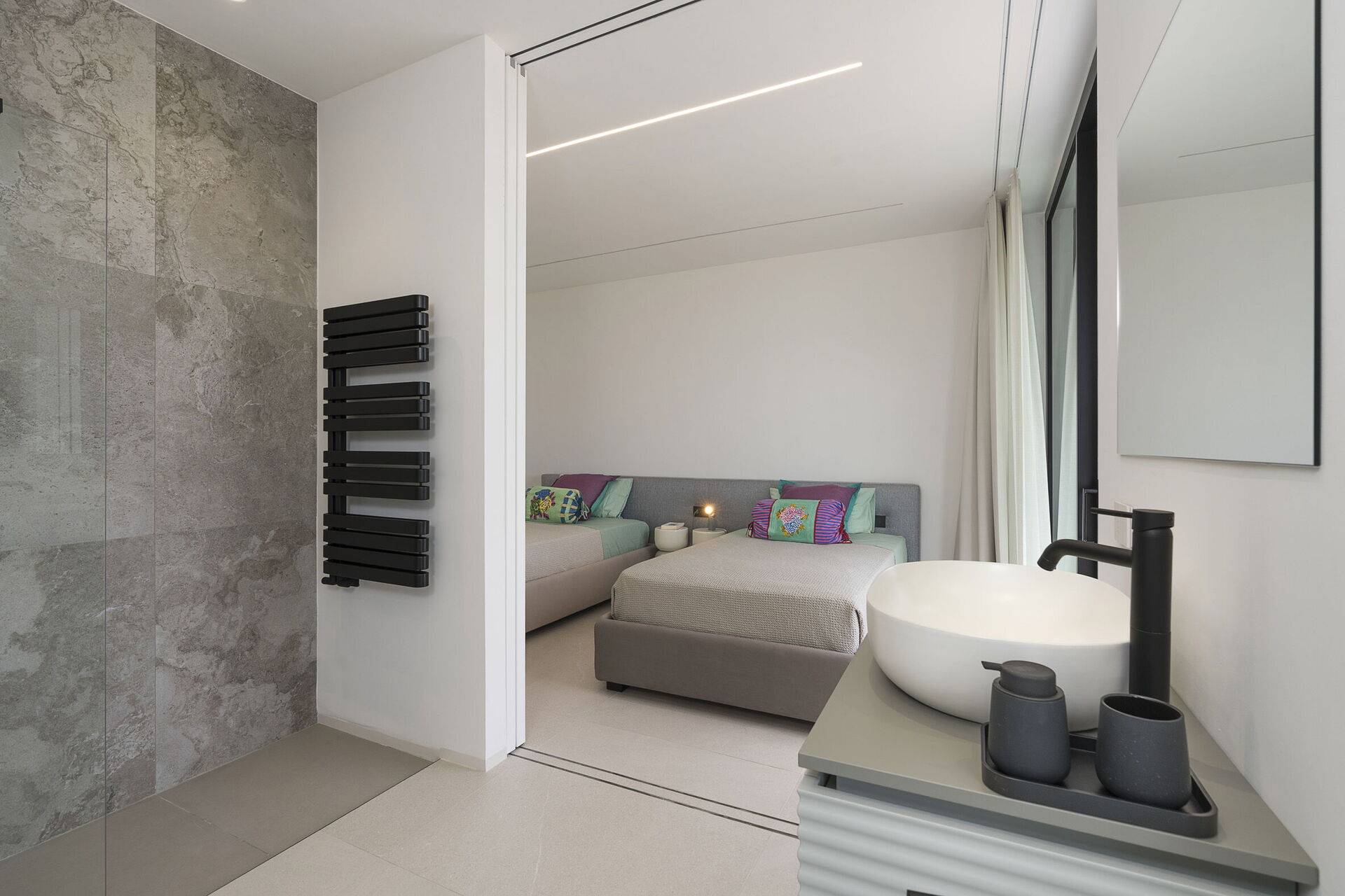 Lower floor: 2 double bedrooms (bed dimensions: 180 x 200 cm) with walk-in closet and private bathroom with bathtub and with shower, 1 bedroom with two single beds (bed dimensions: 120 x 200 cm) with walk-in closet and private bathroom with shower.