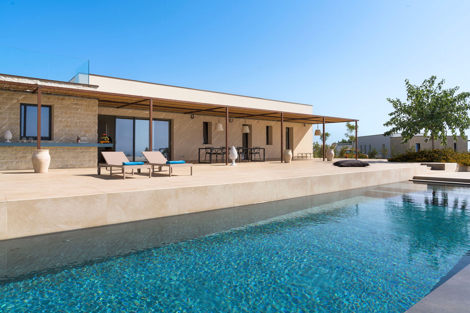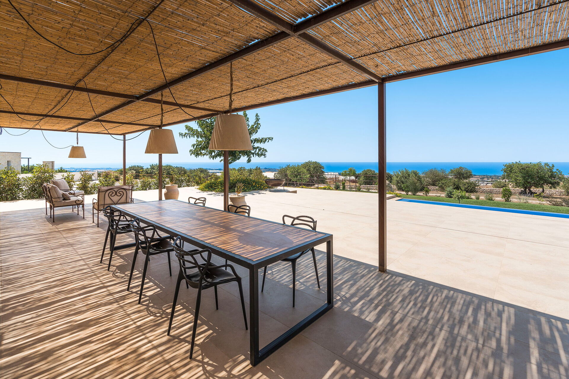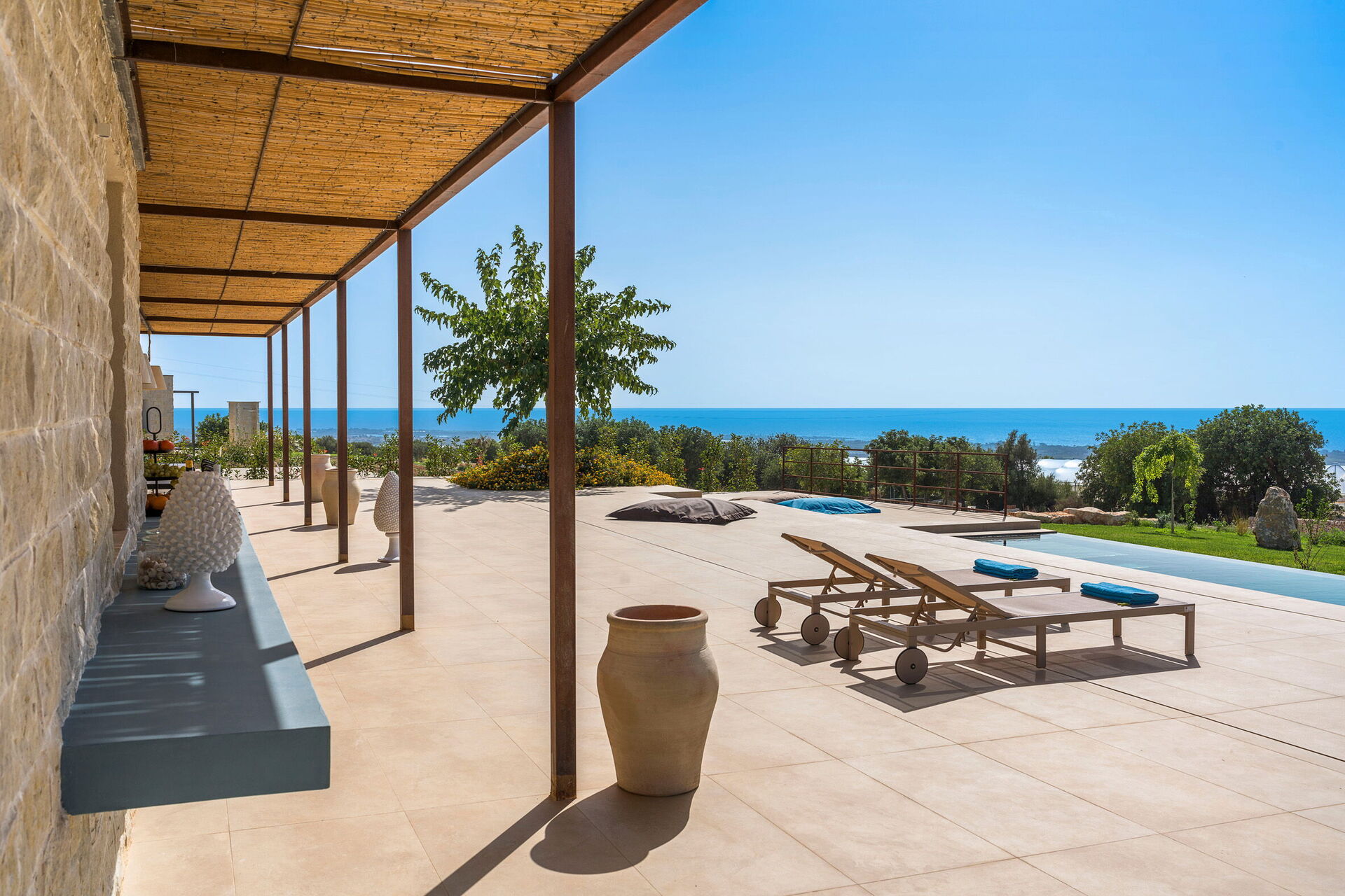 This exclusive vacation villa near Scicli (spectacular Baroque UNESCO site) sits in a tranquil spot with breathtaking views of the splendid surrounding landscape, the countryside and the sea, from the pool and large terraces.