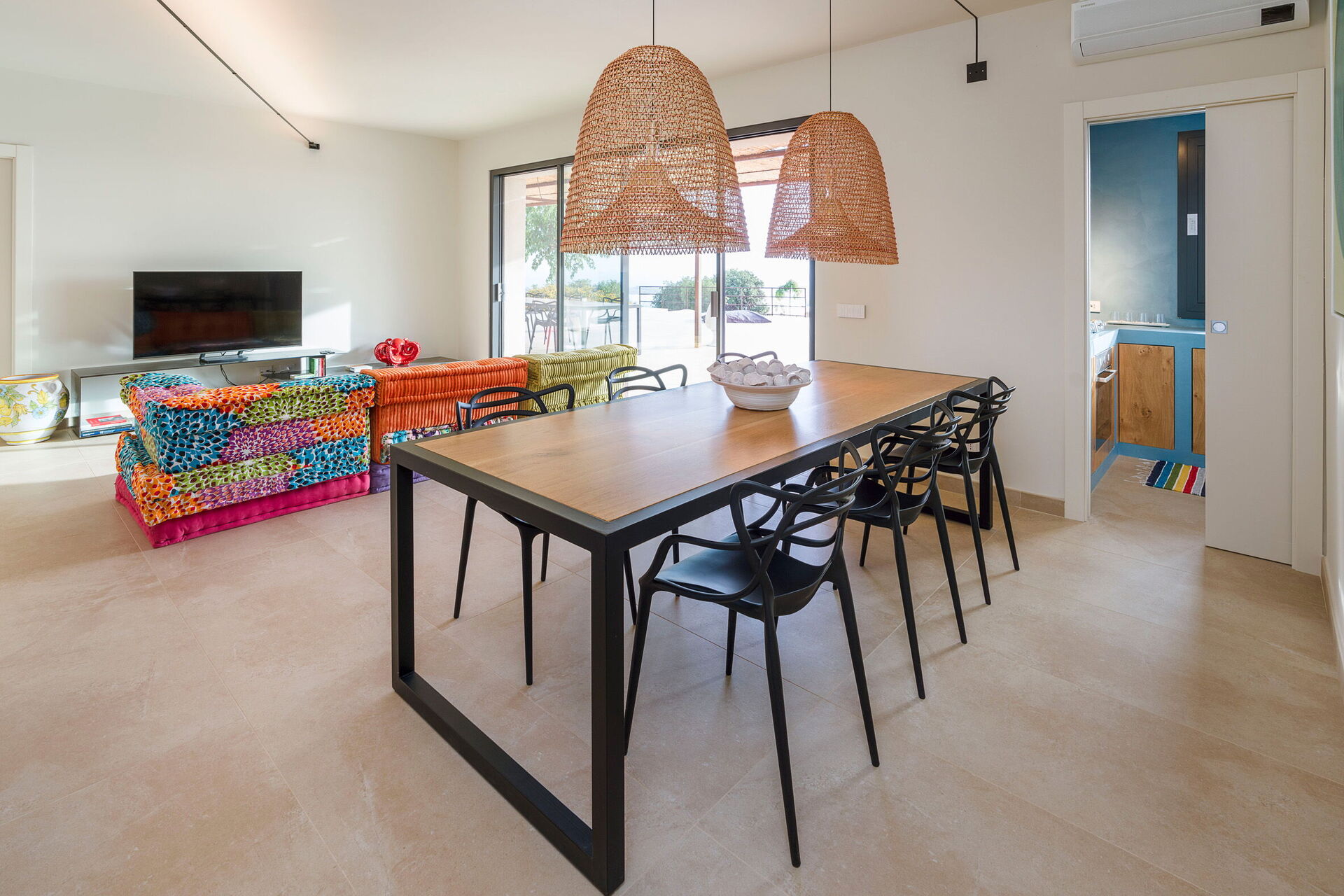 Ground floor: living room with panoramic views (TV) with dining room, kitchen (cooktop, oven, freezer, refrigerator, dishwasher, coffee maker, toaster), bedroom with 2 single beds (air conditioning), bathroom with shower, 2 double bedrooms (air conditioning) each with a private bathroom with shower.