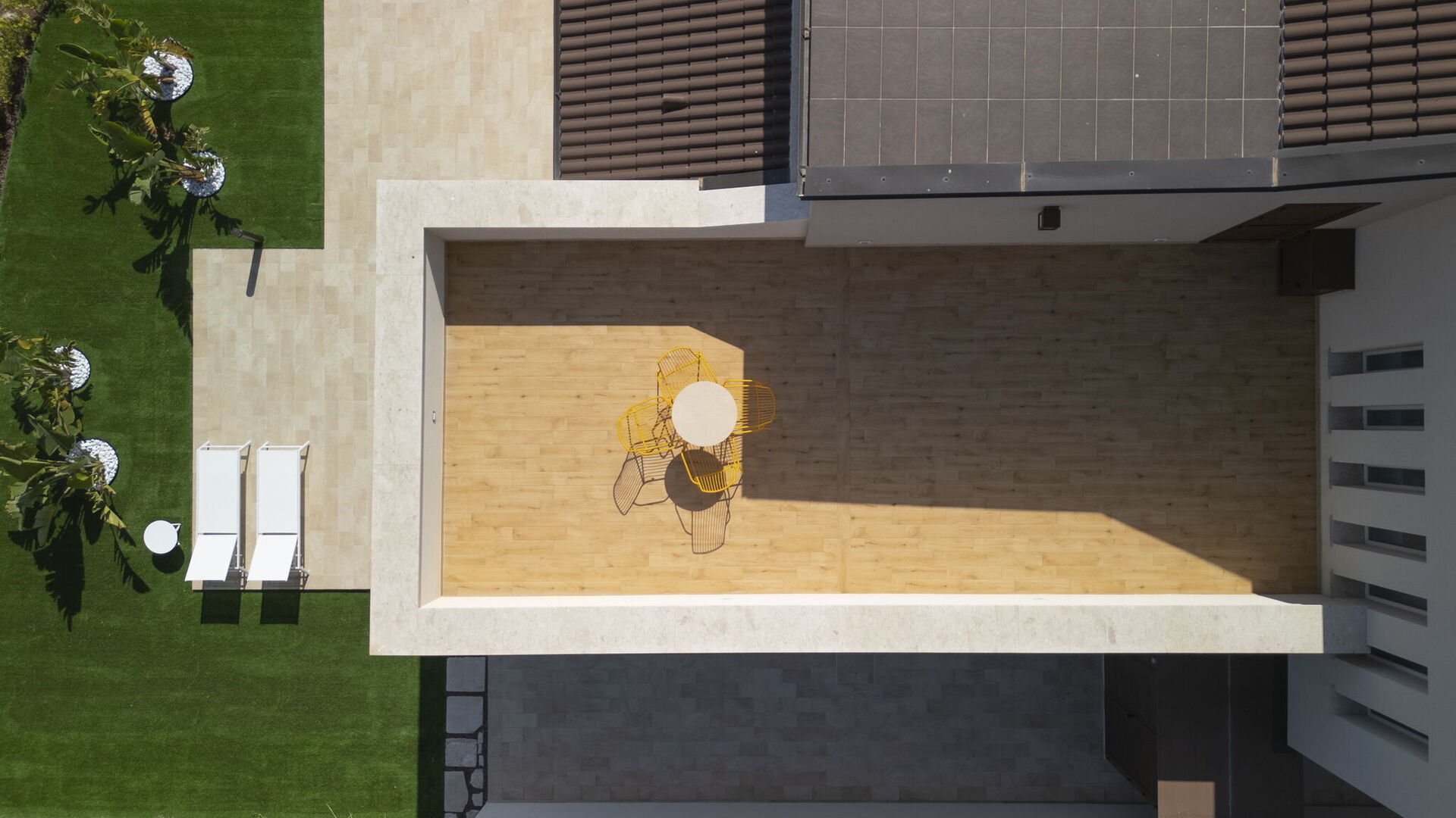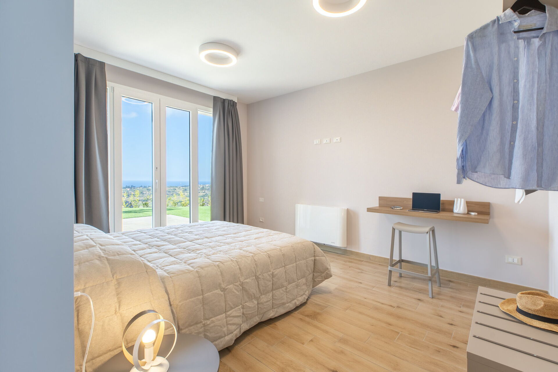 Large outdoor spaces, like the poolside sunbathing area, are at guests’ disposal for relaxing in total privacy with friends and family. Dine outside on the veranda, which is furnished with a table and chairs, and enjoy the panoramic views.