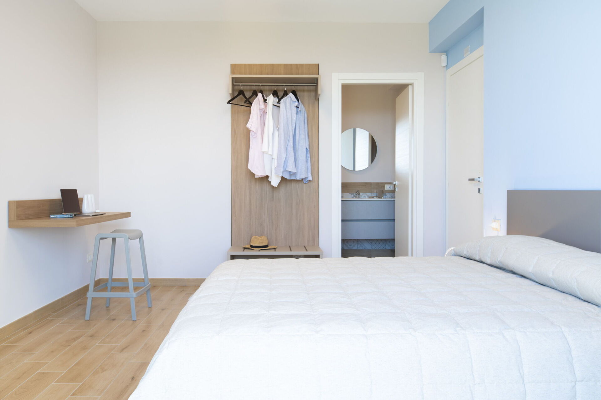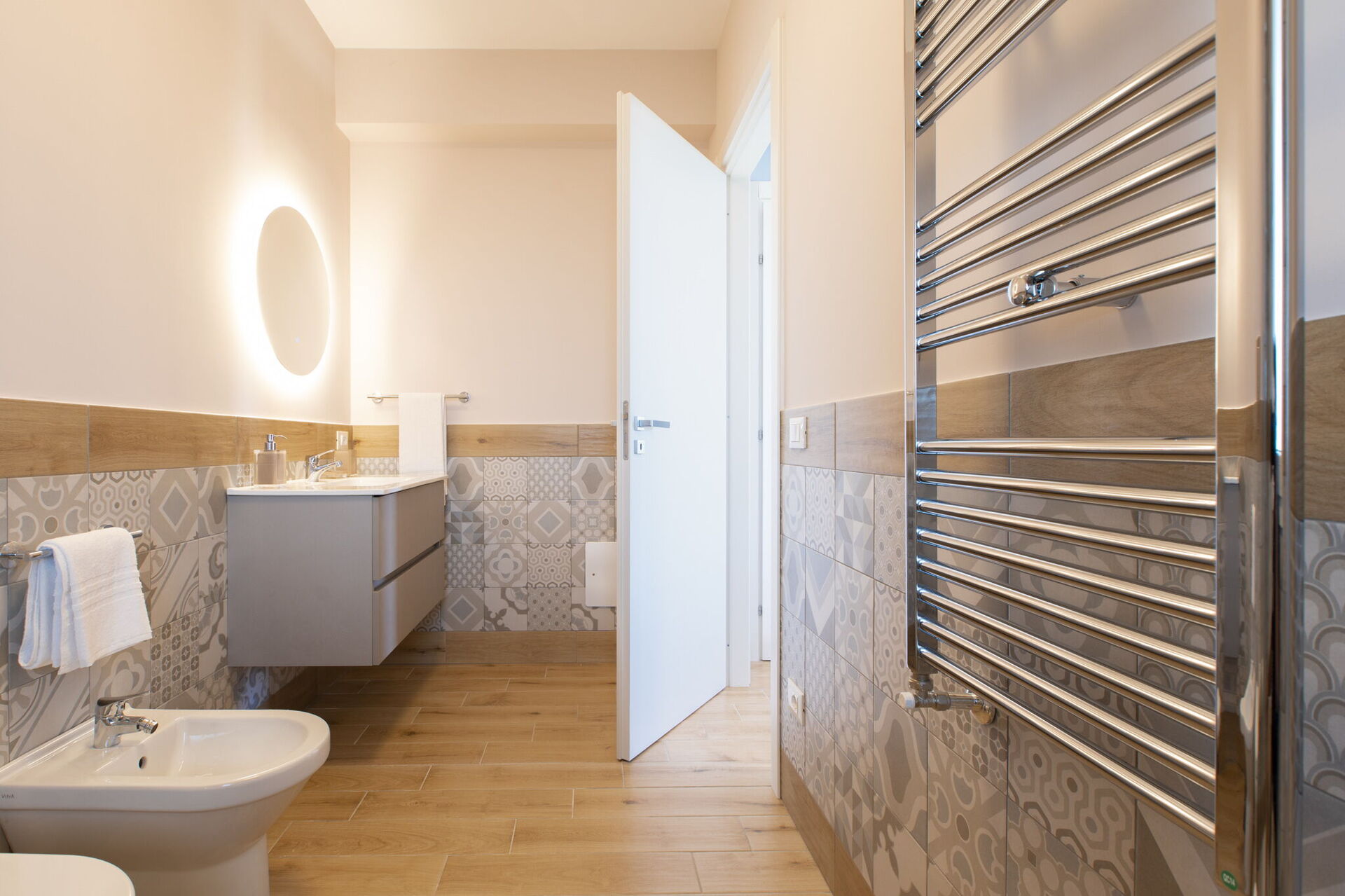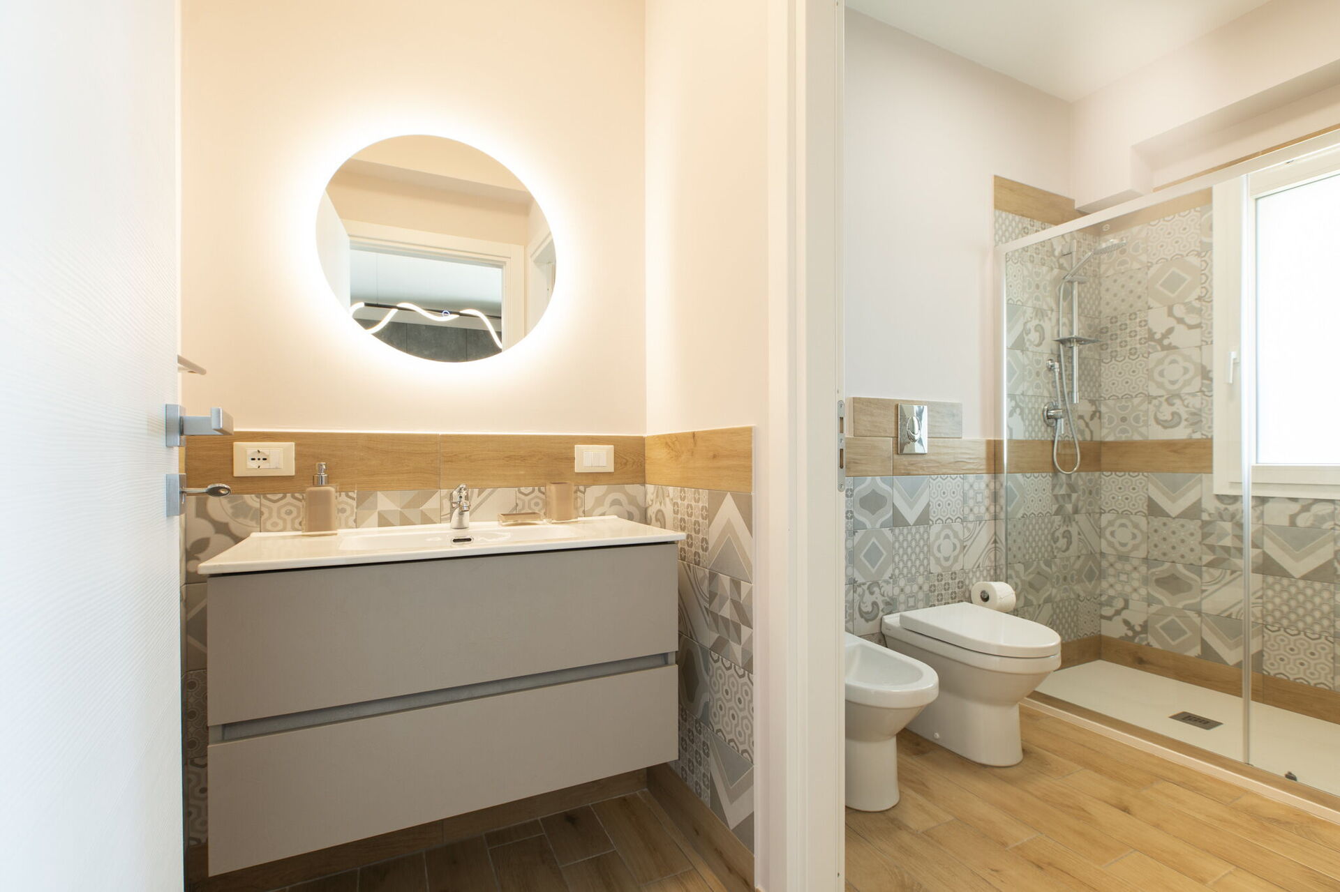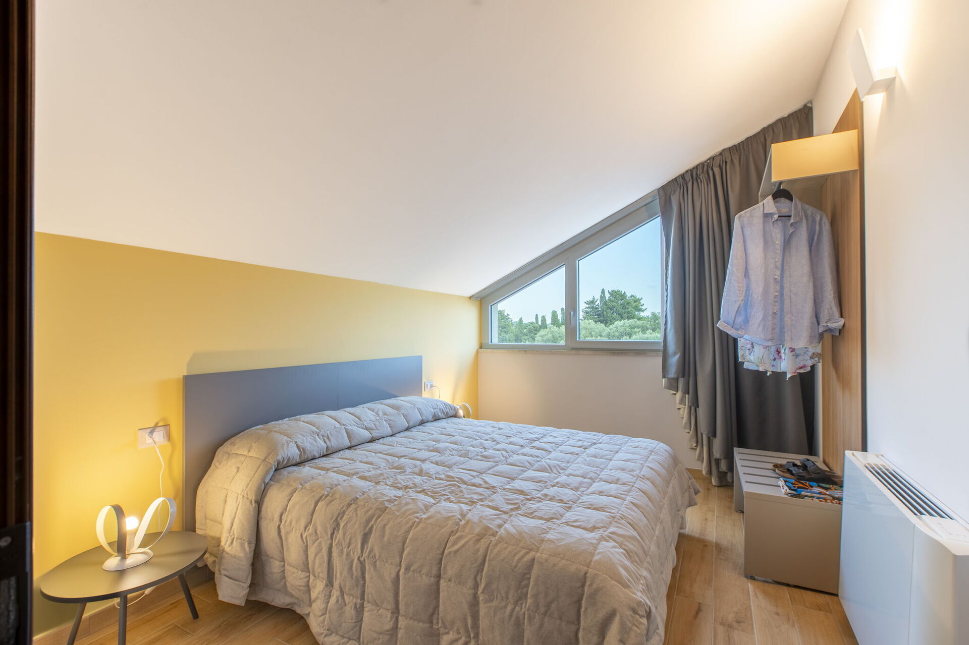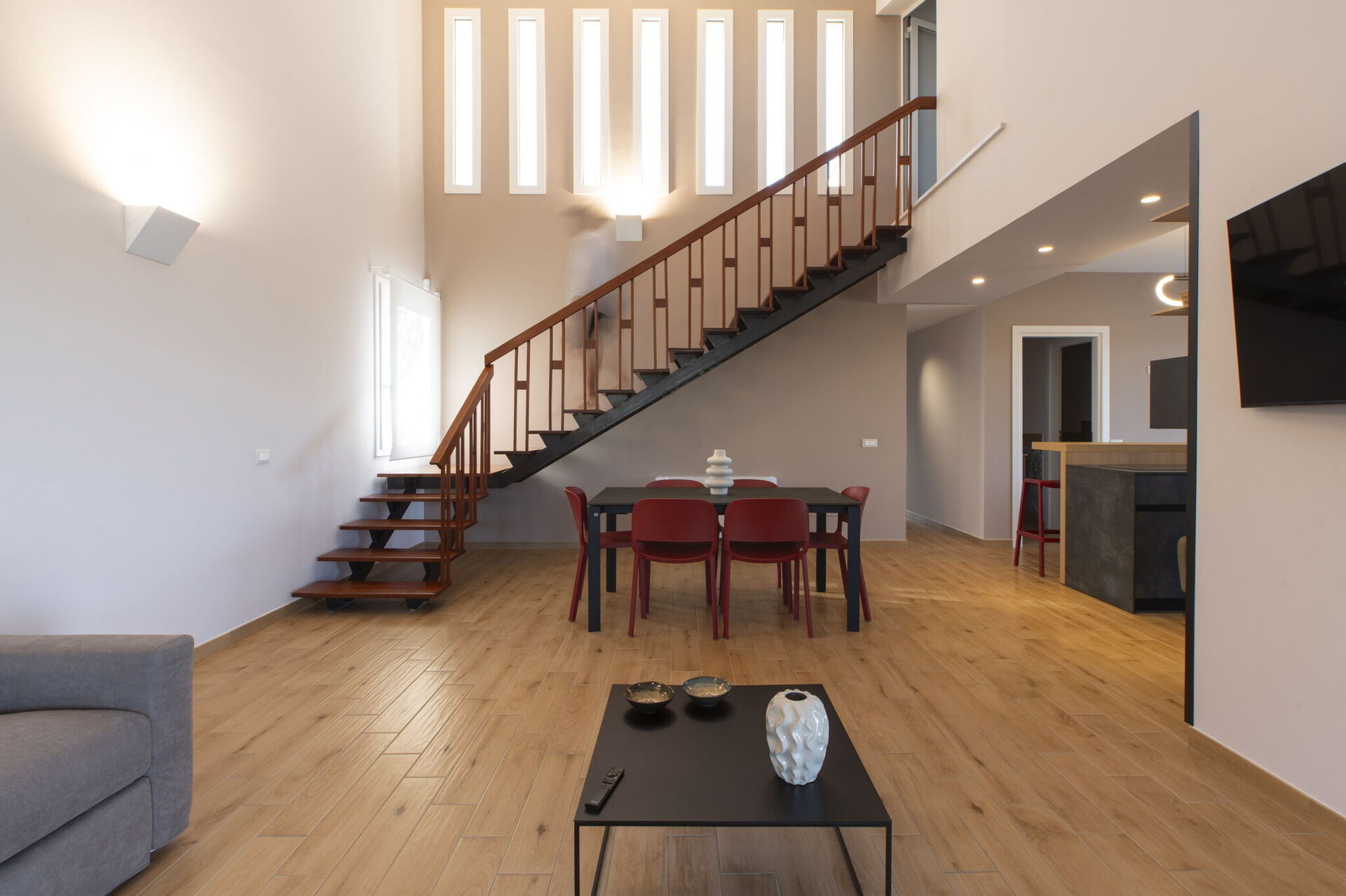 Piano primo : living room with access to a sunbathing terrace (smart tv), 2 double bedrooms, bathroom with shower. In the living room and in one of the bedrooms part of the ceiling slants down.