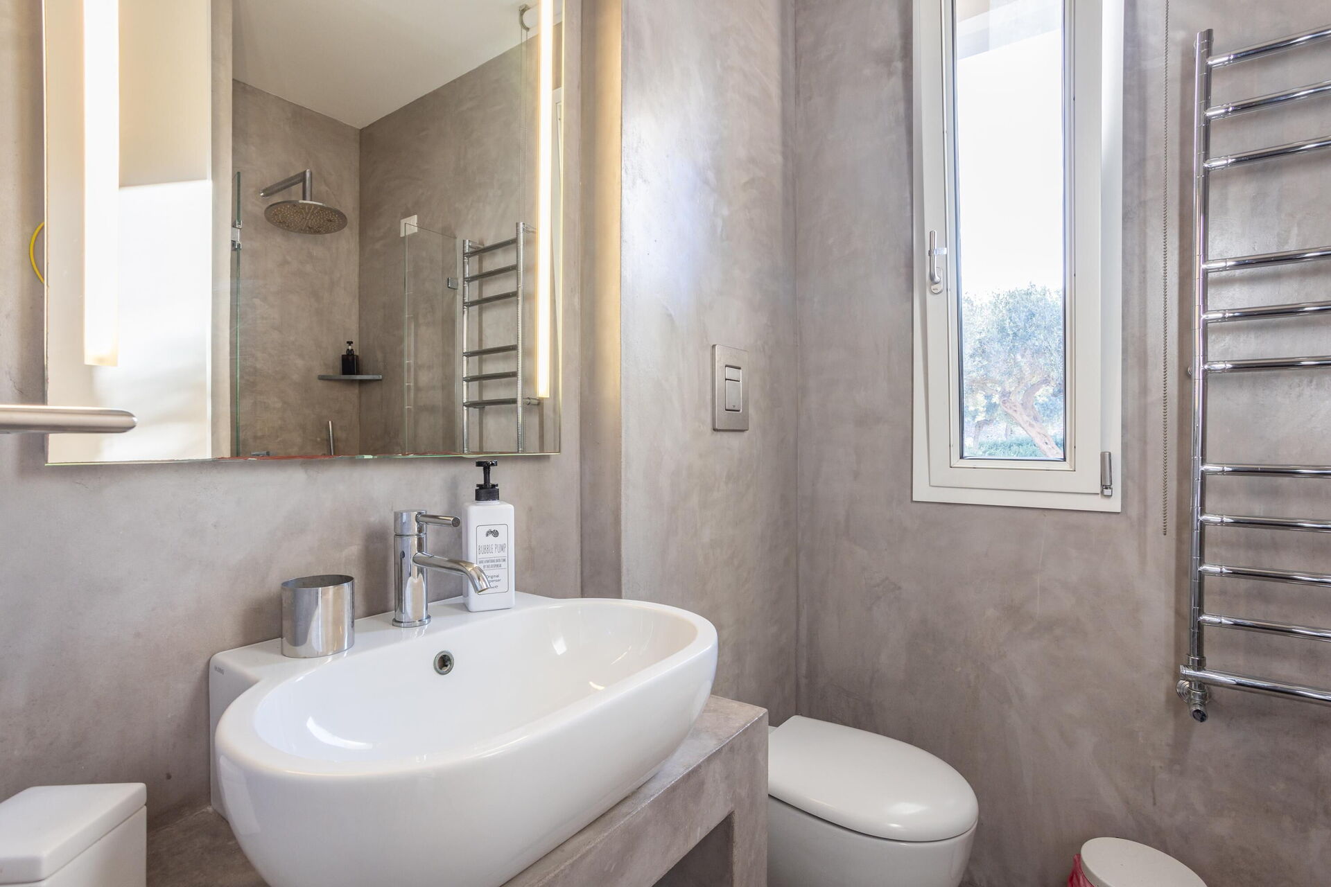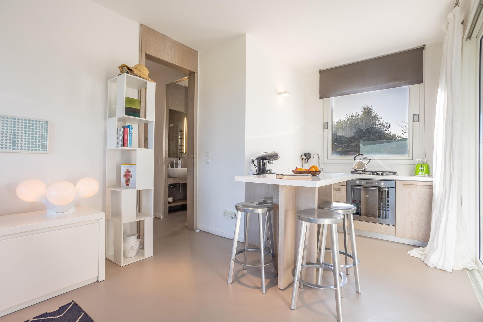 Ground floor (accessible only from the outside, and not connected to the rest of the villa on the inside): : entrance and small living room with kitchen corner (oven, refrigerator, dishwasher, toaster, espresso coffee maker), double bedroom (air conditioning) with direct outdoor access, bathroom with shower, bedroom with 2 single beds (air conditioning).