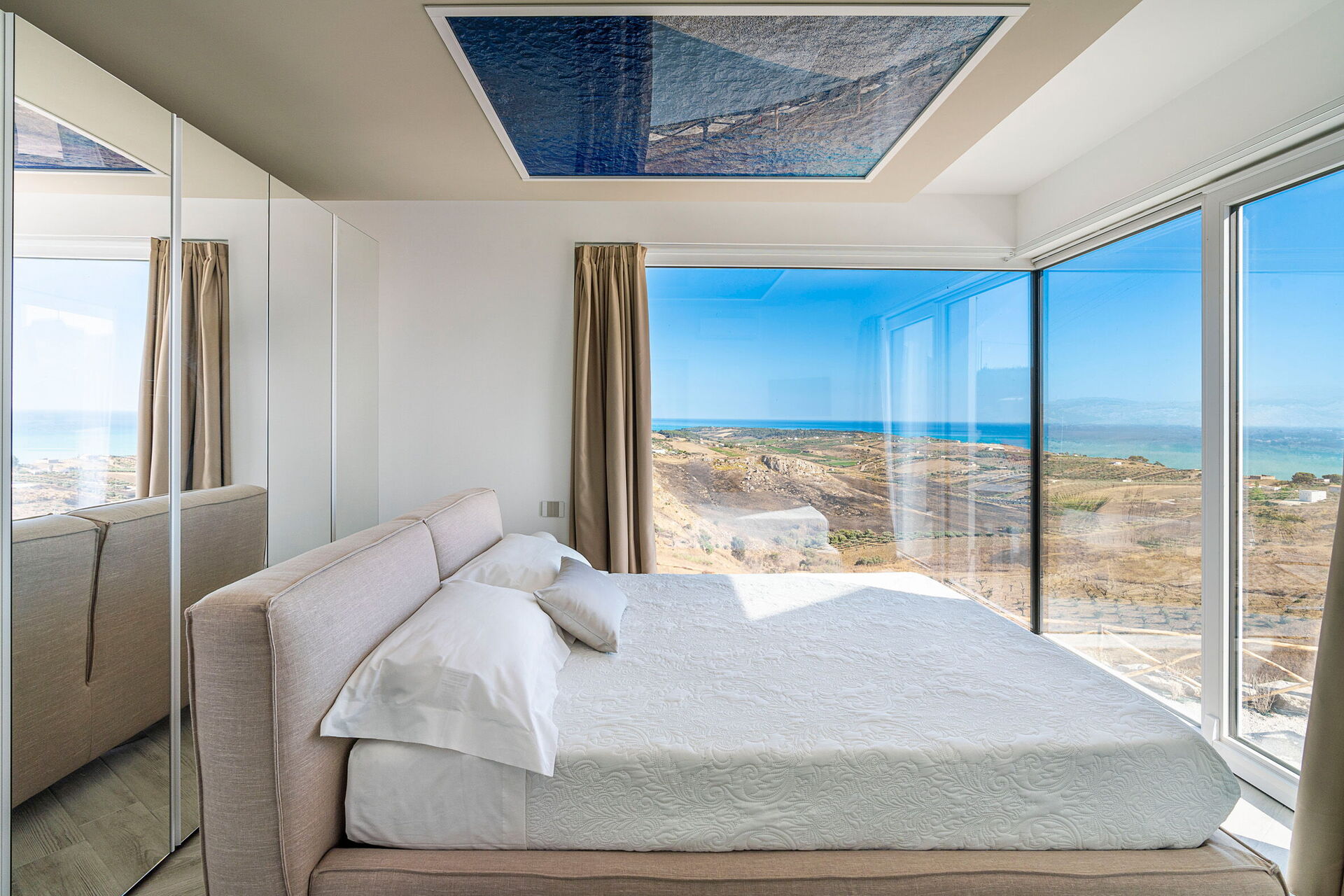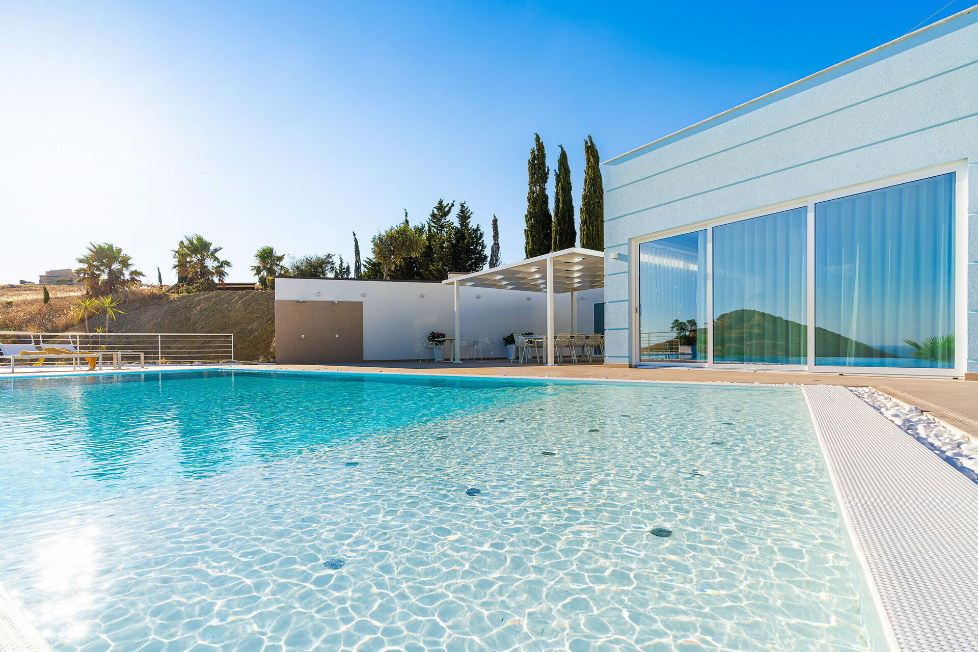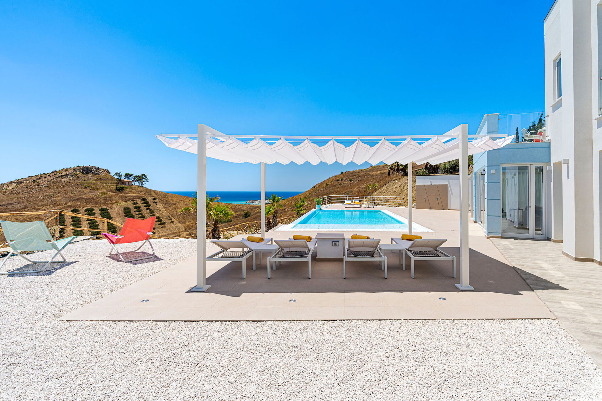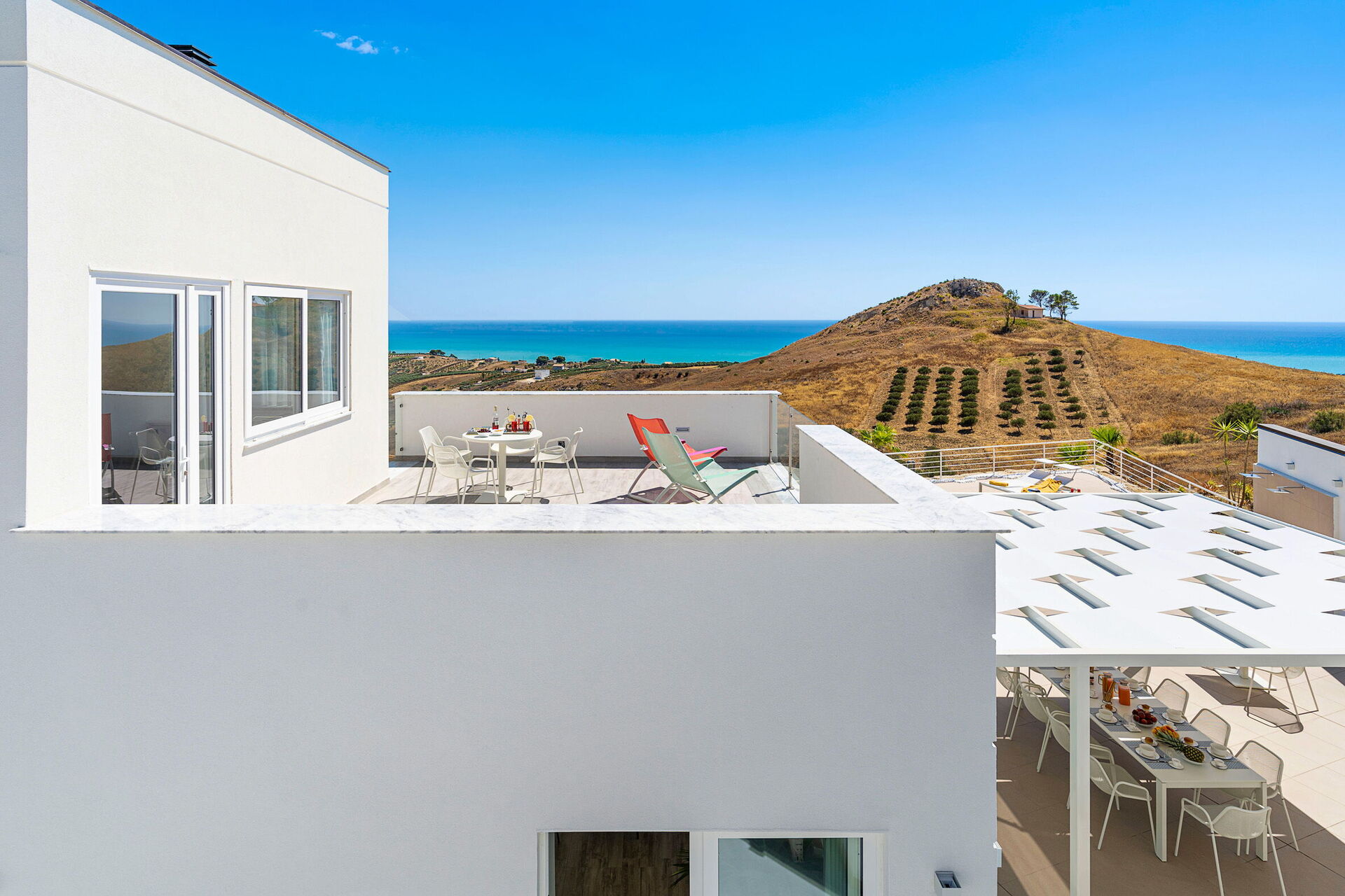 If you are looking for an exclusive vacation villa in Sicily, Villa Domizia is for you. Modern and refined, it has 4 bedrooms to accommodate up to 8 people. The light and panoramic views are this marvelous villa’s best features: both inside and outside there are spectacular views of the sea and the surrounding countryside. Outside, you can relax in the large saltwater pool with a whirlpool zone.