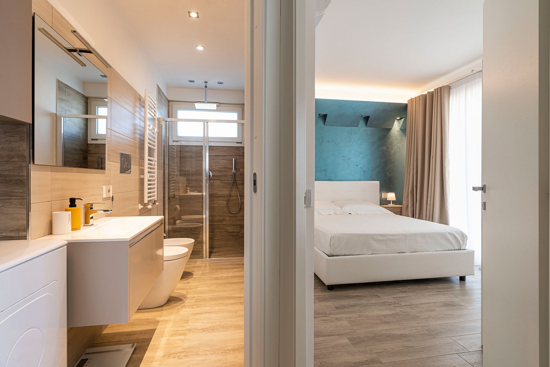 First floor: (not connected inside, and only accessible from the outside): 2 double bedrooms, each with a private bathroom with shower, living room with kitchen corner, terrace access.