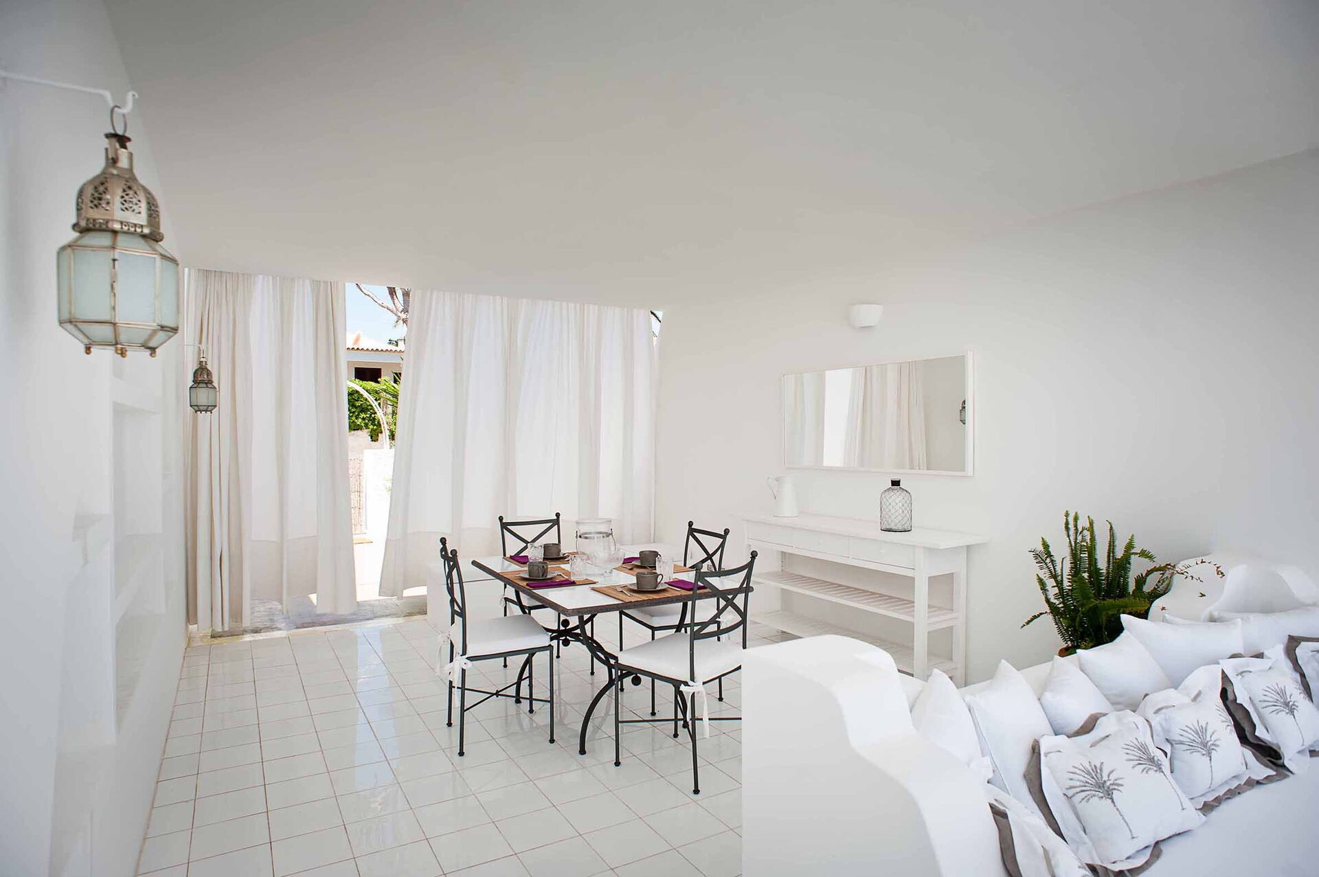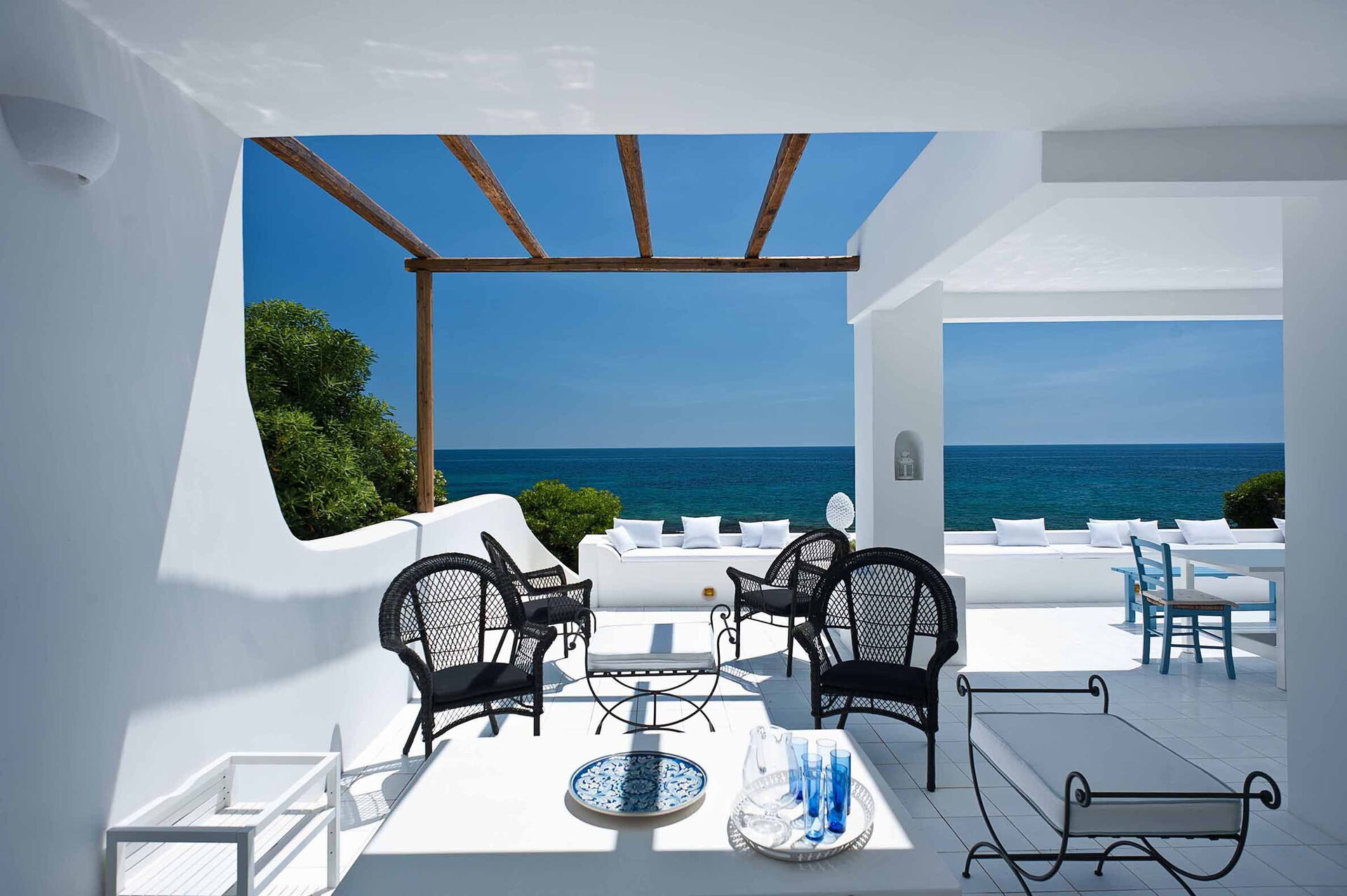 A large covered veranda equipped with table and chairs opens onto the terrace, creating a feeling of continuity between inside and outside and allowing guests to eat al fresco while enjoying the enchanting view.