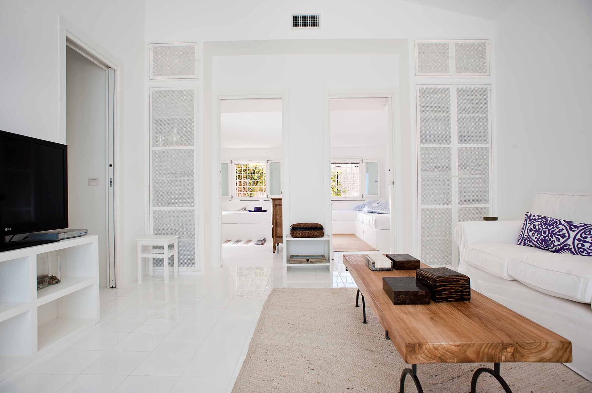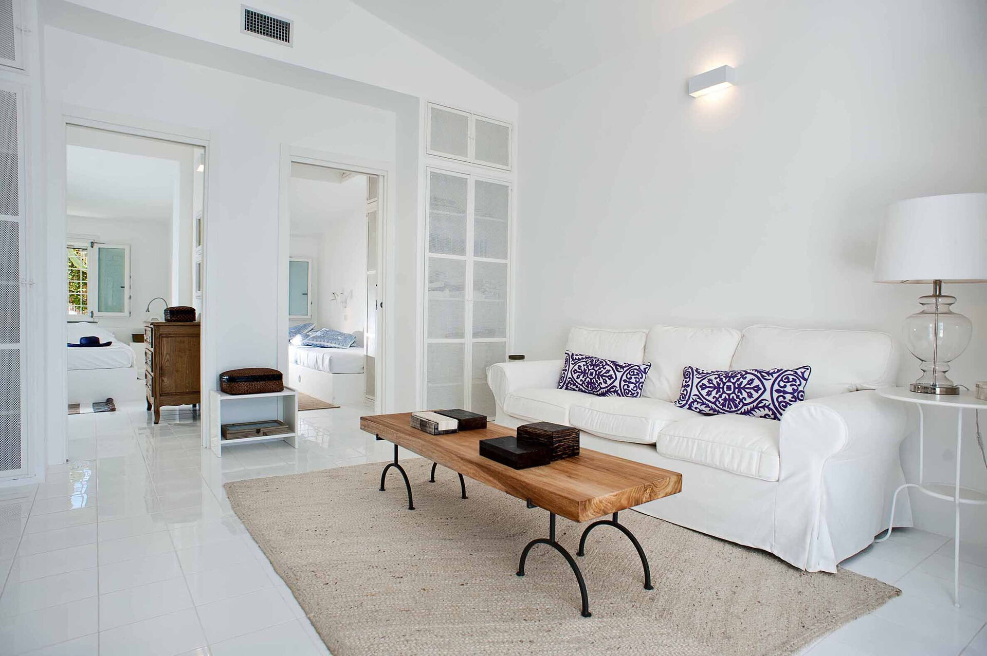 Laid out on a single level, the welcoming and well-lit interiors stand out for their elegant contemporary design and minimalist white furnishings.
