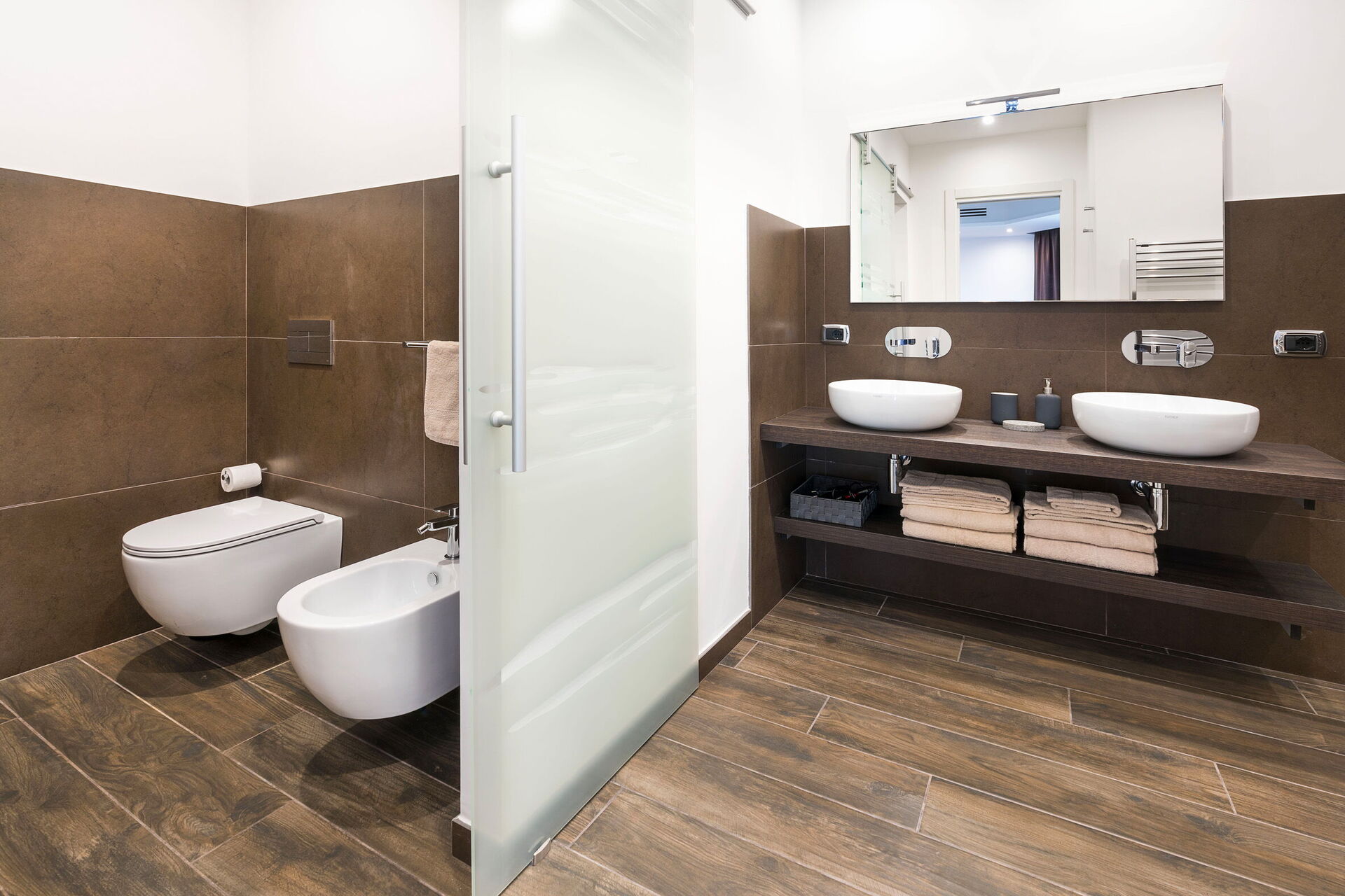 Ground floor: large living room (piano- tv); dining room; kitchen; WC; laundry room with washing machine and dryer; 3 double bedrooms, each with private bathroom with shower.