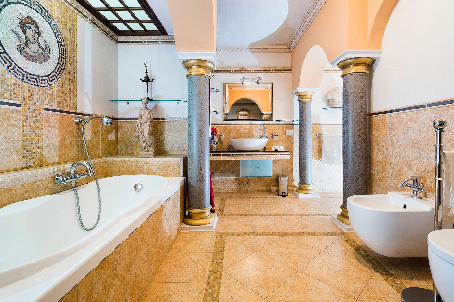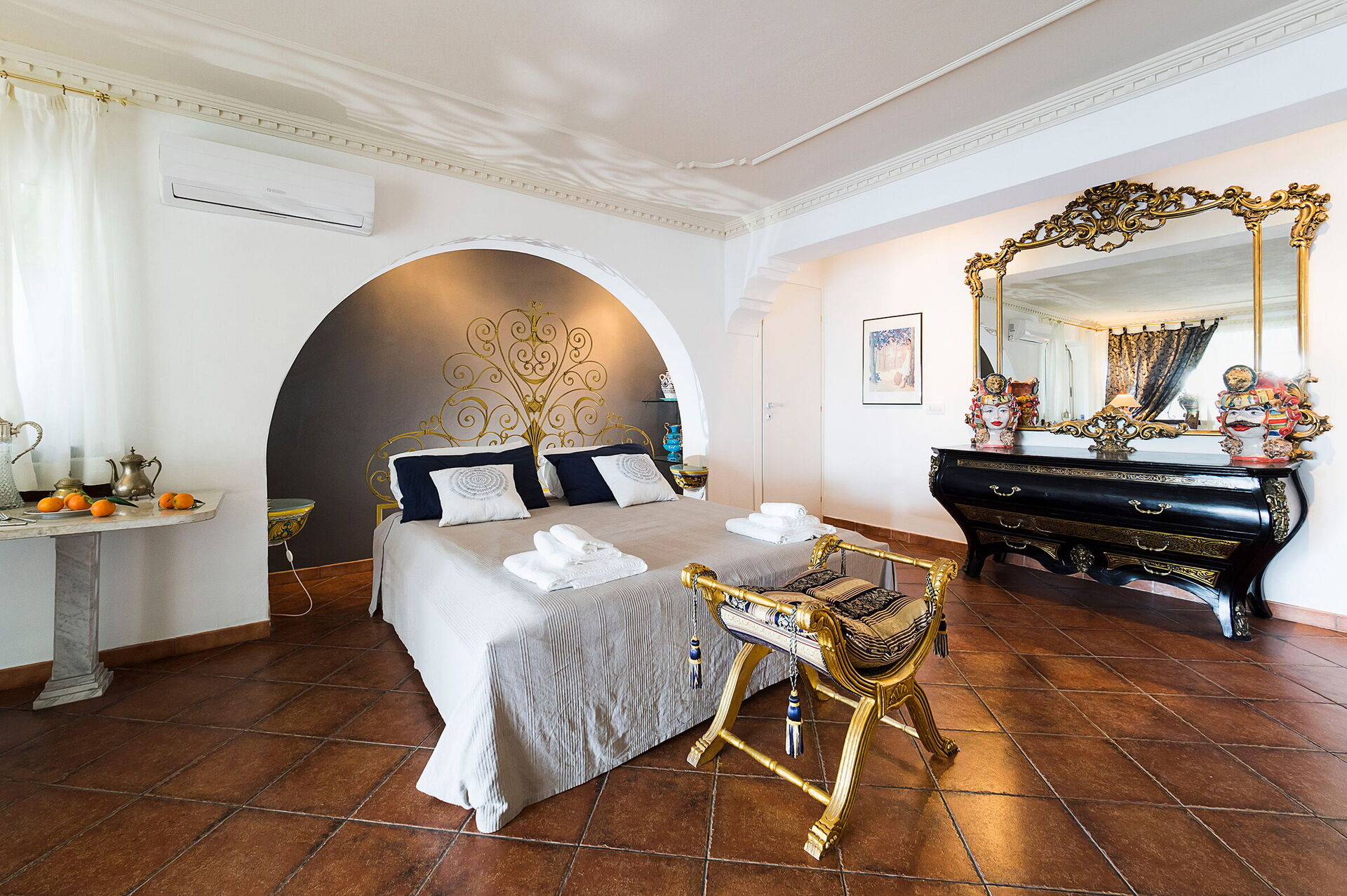 Ground floor: double bedroom (air conditioning, minibar, TV, mosquito net) with private bathroom with tub and shower