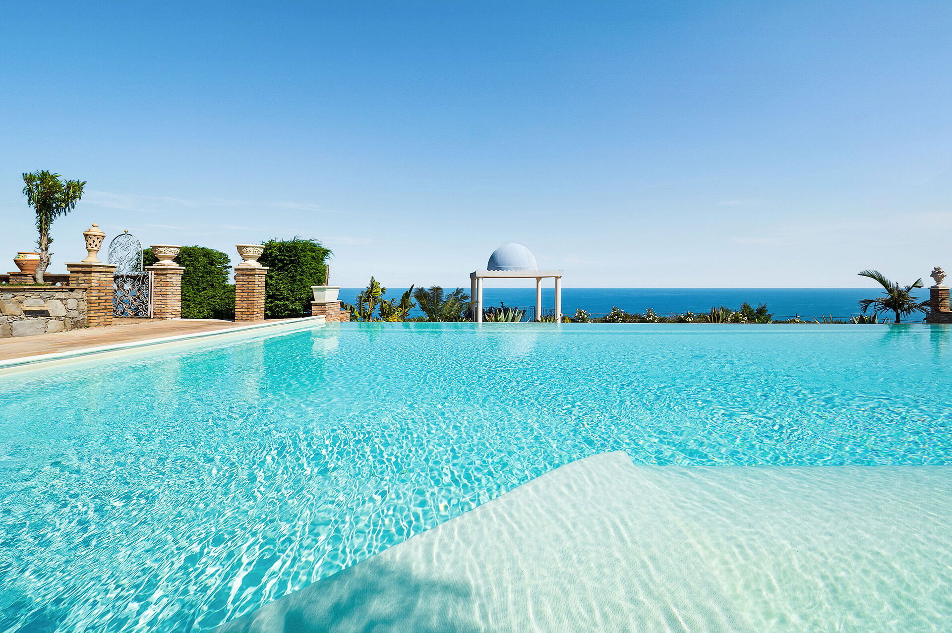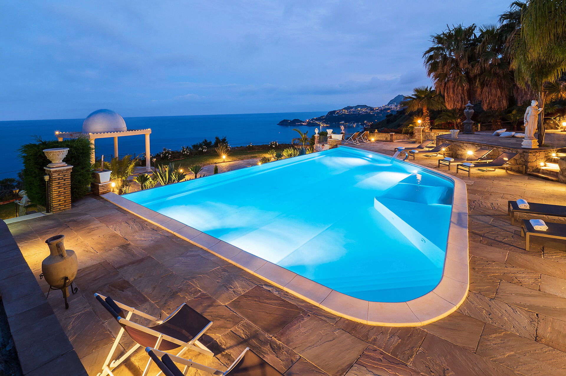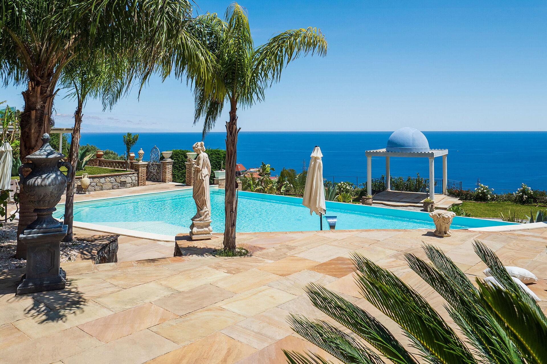 Prestigious and refined, this exclusive holiday villa enjoys a spectacular panoramic position with a breath taking view of the sea and the bay of Taormina, which can be admired both from the infinity pool and from its large terraces.