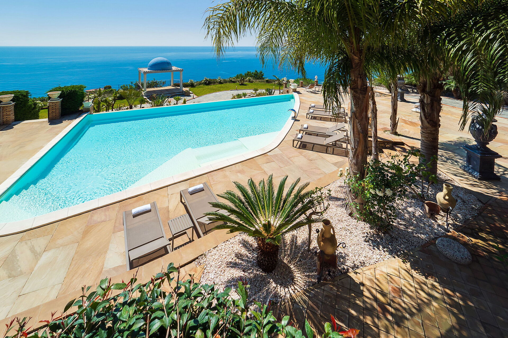The panoramic outdoor spaces offer numerous common areas and allow guests to spend a pleasant stay with family or friends, relaxing on the terrace equipped for al fresco dining or in the large pool area with sea view, ideal for spending unforgettable moments under the Sicilian sun.