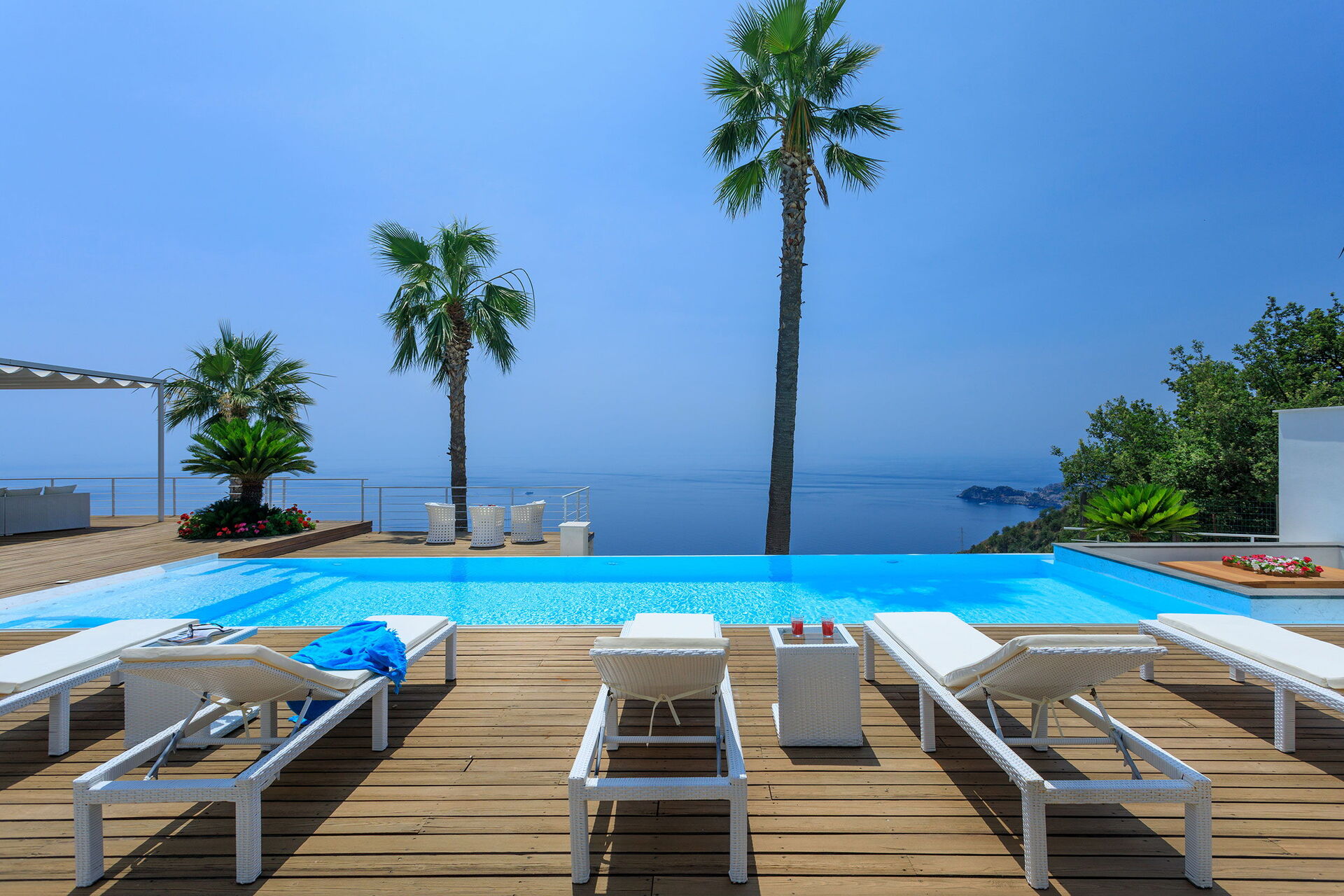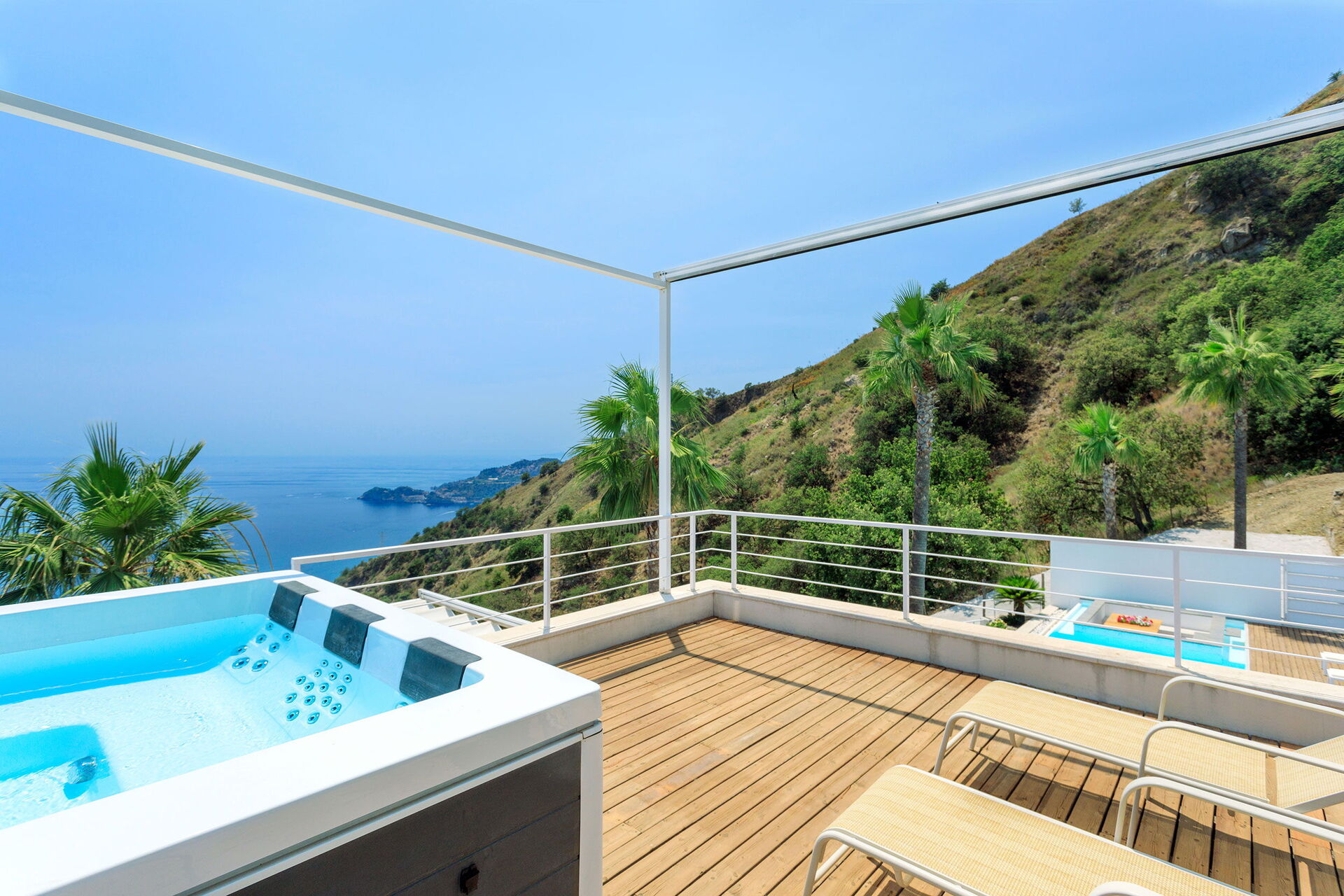 Modern and bright, this exclusive vacation villa rental sits in an incredibly scenic spot with breathtaking views of the sea and bay of Taormina. Enjoy the views from the infinity pool with whirlpool area, from the terraces, or from the garden.
