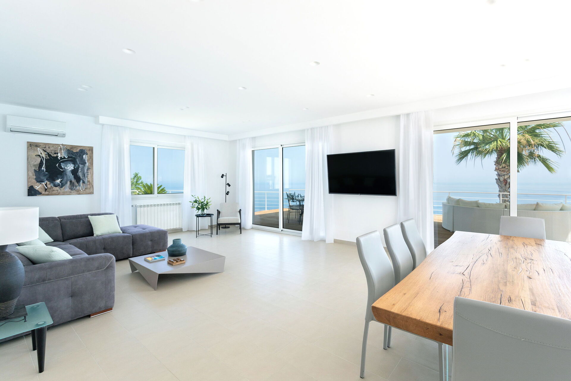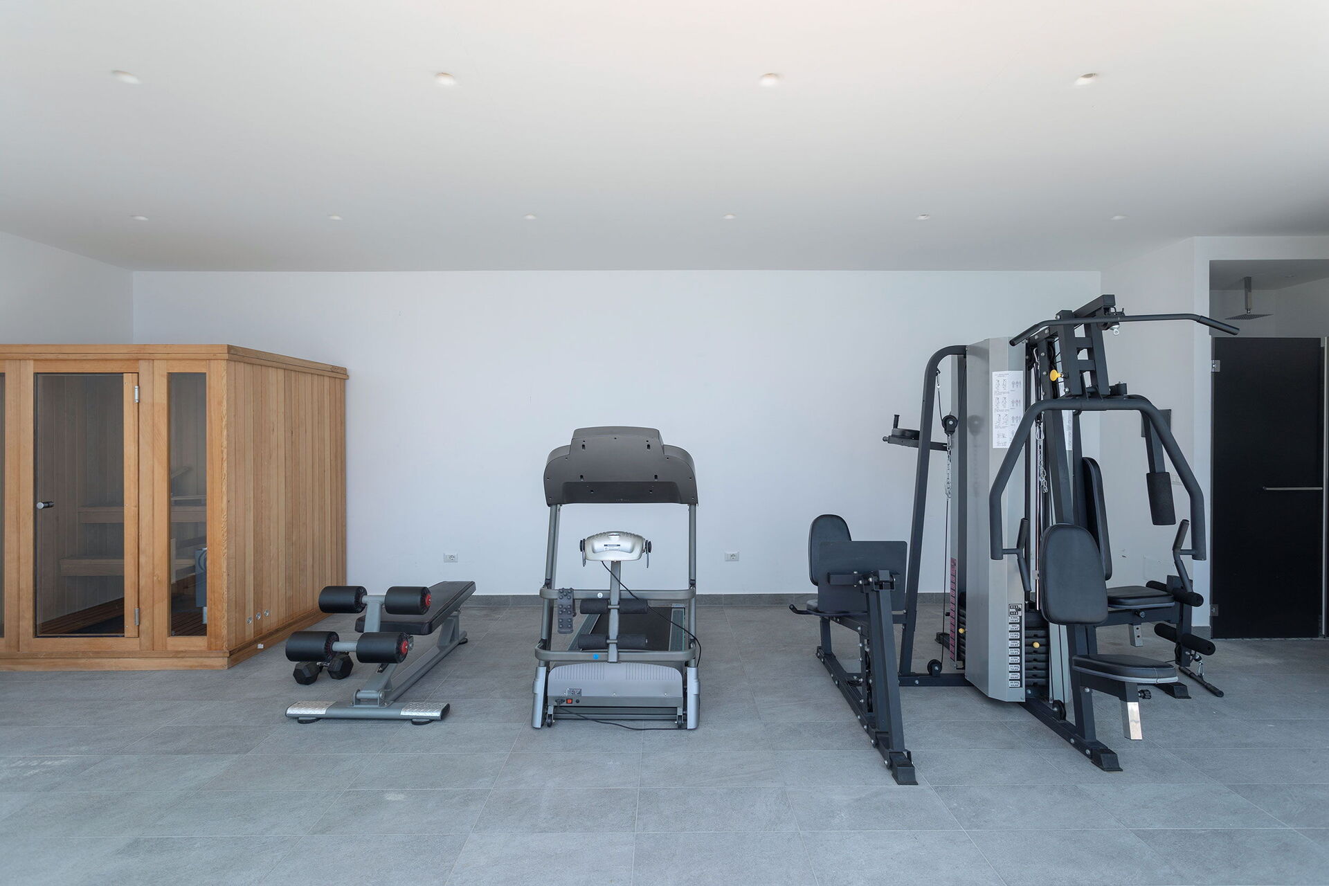 Ground floor: large open plan living room and kitchen (cooktop, oven, refrigerator, freezer, dishwasher, microwave, toaster, espresso coffee maker) with dining area and access to the scenic terrace equipped for outdoor dining, WC, gym with sauna and bathroom with shower, laundry room, double bedroom (air conditioning) with private bathroom with shower.