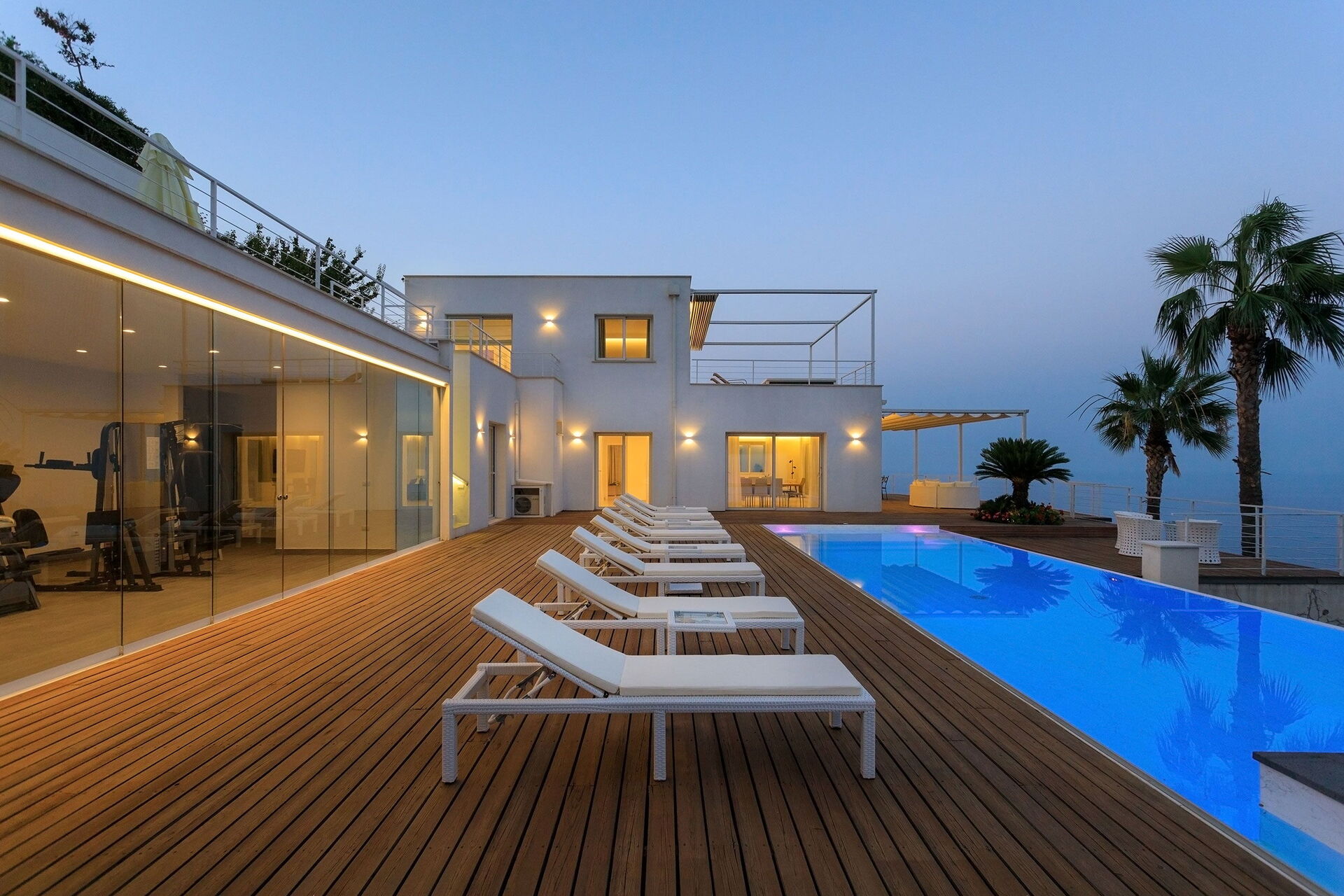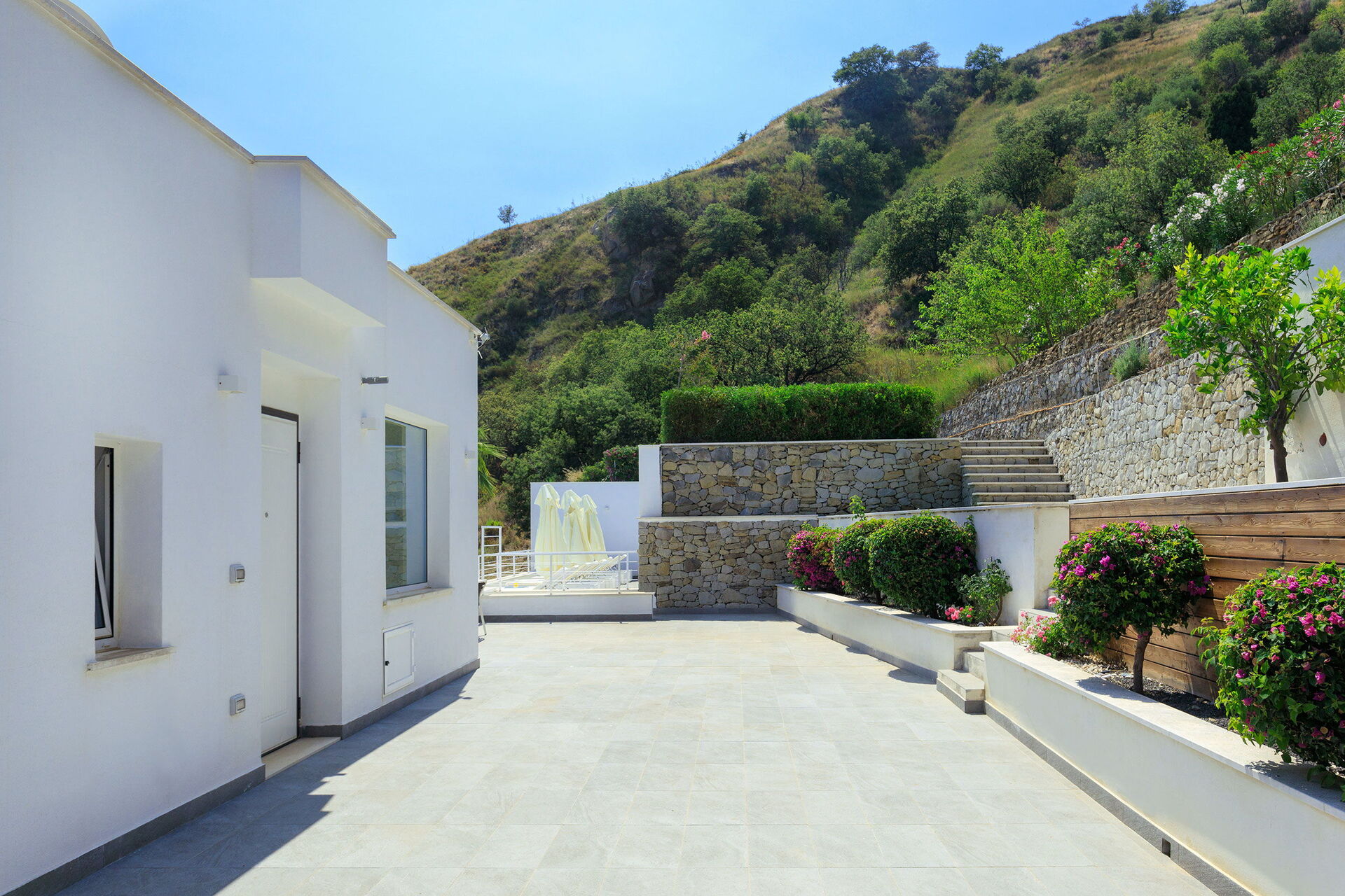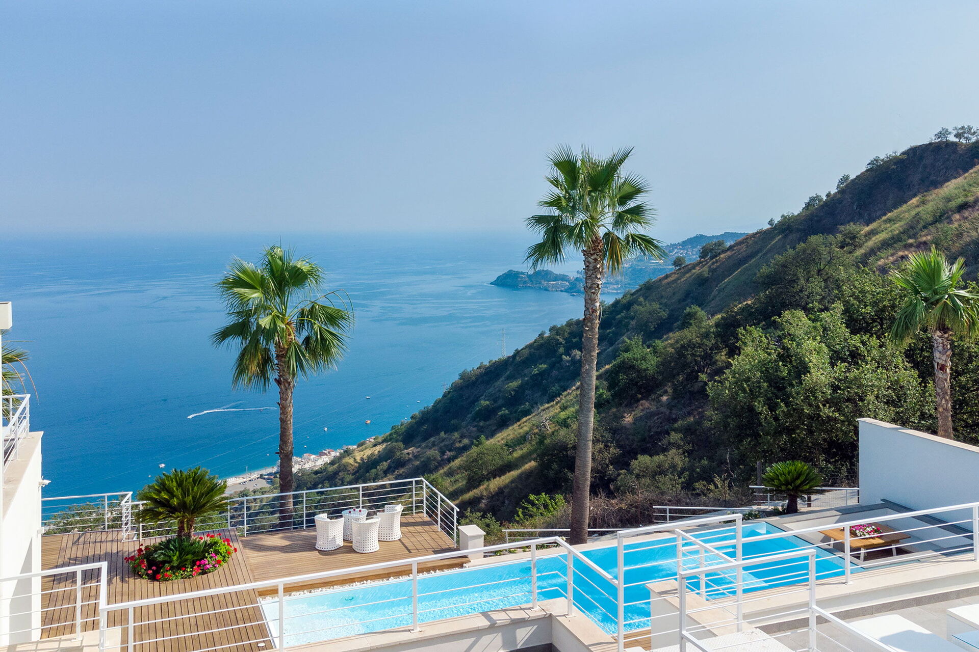 The many scenic outdoor areas offer the opportunity to spend unforgettable moments in the Sicilian sun, relaxing with family and friends on the furnished patio and dining outdoors, or in the large pool with spectacular sea views.